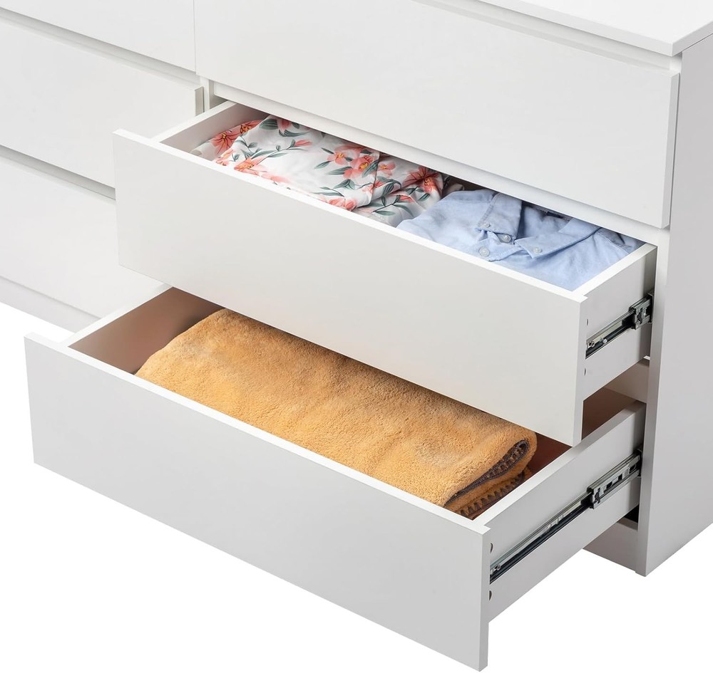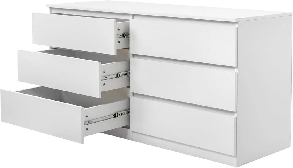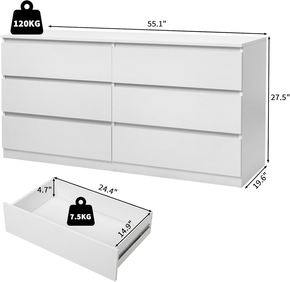 Product Description Introductions: Introducing the FCH 6-Drawer Double Dresser, a compelling blend of modern design and stellar functionality. Crafted from robust P2 class particle board, this dresser offers durability and strength for everyday use. Flaunting a chic black finish, it is an exquisite addition to your bedroom, living room, or entryway. Its wide drawers provide ample storage space for your belongings, ensuring your home stays clutter-free. Organize in style with this versatile piece that marries aesthetic appeal with practical utility. Features: - Durable Construction: Manufactured from high-quality P2 class 15MM particle board, ensuring long-lasting durability and robustness. - Elegant White Finish: The sleek white finish adds a touch of sophistication and seamlessly blends with any home decor. - Spacious Storage: Six wide and deep drawers, each capable of holding up to 16 lbs, allowing you to store items of various sizes. - Versatile Use: Ideal for the bedroom, living room, or entryway, offering a stylish solution for keeping your space tidy. - Easy Assembly: come with installation hardware and manual, anti-toppling accessories are also included Specifications: 1. Material: P2 Class 15MM Particle Board 2. Color: White 3. Dimensions: (55.1 x 19.6 x 27.5)in / (140 x 50 x 70)cm (W x D x H) 4. Drawer Size: (24.4 x 14.9 x 4.7)in / (55 x 35 x 11)cm (W x D x H) 5. Single Drawer Weight Capacity: 16 lbs / 7.5 kg 6. Product Weight Capacity: 331 lbs / 150 kg 7. Net Weight: 118 lbs / 53.5 kg 8. Package Weight: 127 lbs / 57.6 kg Package Includes: 1 x 6-Drawer Double Dresser 1 x Manual On Aug 6, 2025 at 23:07:31 PDT, seller added the following information: