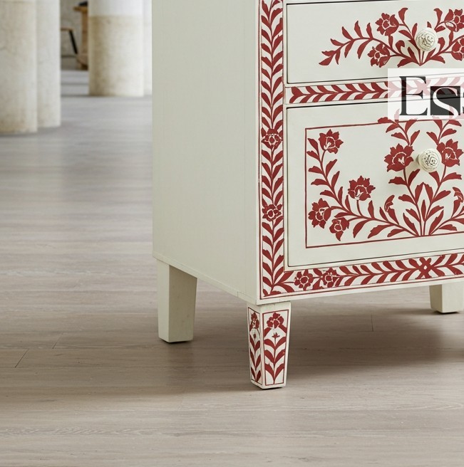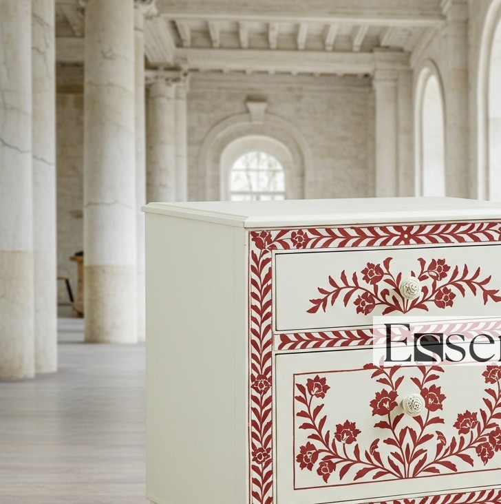 Elevate your interior with timeless elegance through this handcrafted White Bone Inlay Bedside Table, featuring a delicate floral motif and two practical drawers. Made by skilled artisans in Rajasthan, India, this piece celebrates traditional craftsmanship with a clean and modern all-white palette. Each floral design is meticulously hand-carved from ethically sourced camel bone and inlaid into a smooth white resin base, creating a graceful vine pattern that wraps the top, sides, and drawer fronts. The matching bone knobs add a cohesive, refined finish, while the two drawers provide ample storage for nighttime or everyday essentials. The all-white finish makes this bedside table exceptionally versatile — ideal for minimalist, bohemian, coastal, or classic interiors. It brings sophistication and serenity to bedrooms, guest rooms, or even stylish entryways. As every piece is handmade, slight variations in inlay detail and tone highlight the authenticity and uniqueness of the craftsmanship, ensuring no two tables are exactly alike. Product Specifications: Material: Bone Inlay, Solid Wood, Resin Pattern: Hand-Inlaid Floral Vine Motif Color: All White – White Resin with White Bone Drawers: 2 Drawers with Bone Knobs Style: Ethnic Minimal, Luxe Bohemian, Modern Artisan Finish: Smooth Matte Finish Origin: Handmade in Rajasthan, India Care Instructions: Wipe gently with a soft, dry or slightly damp cloth Assembly: Arrives fully assembled