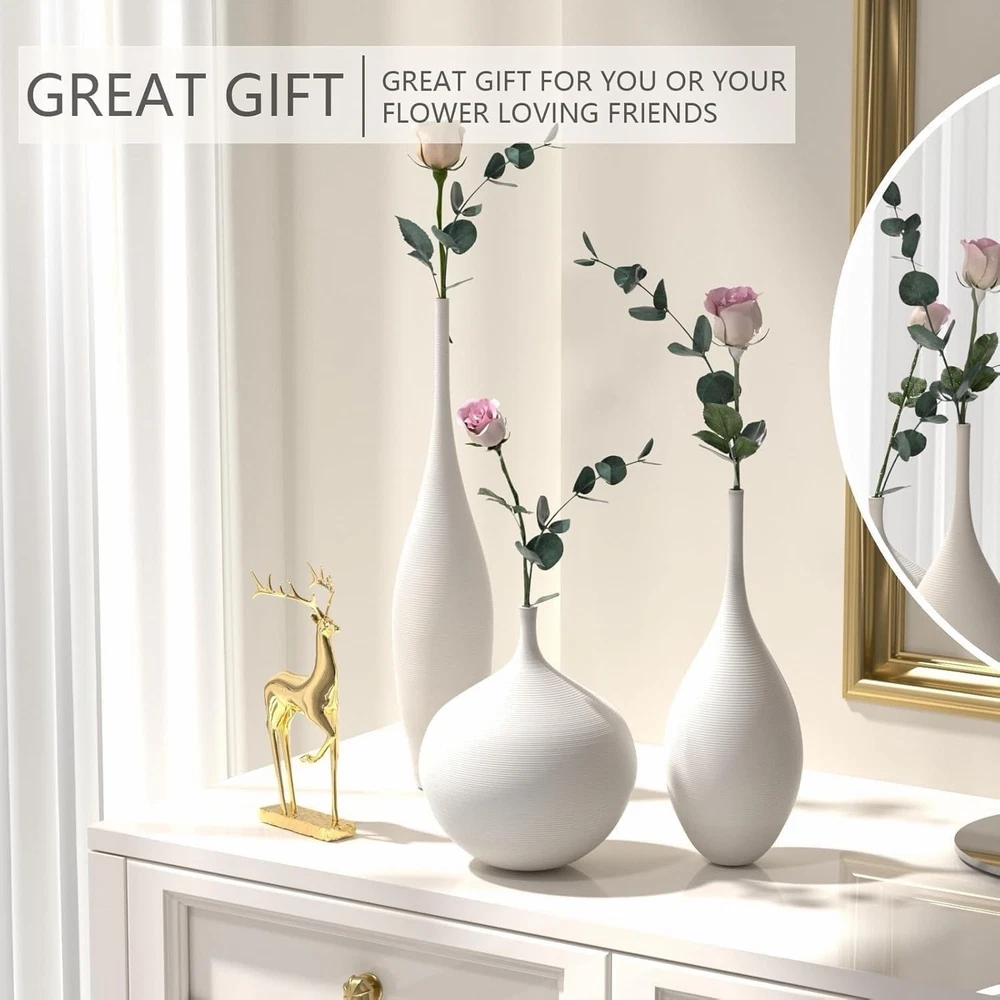 Material Ceramic Color White Brand Relexome Product Dimensions 9.25"L x 6.5"W x 16.14"H Shape Oblong Style Minimalist ใ๐๐๐ฌ๐ ๐๐๐ญ ๐๐ข๐ณ๐ใVase 1: 6.69''H x 5.11''W x 5.11''L; Vase 2: 14.96''H x 3.14''W x 3.14''L; Vase 3: 9.84''H x 3.14''W x 3.14''L; Bottle Mouth Diameter: 0.47''. Please carefully check the size of the vase before purchasing. ใNOTICEใThis ceramic vase set is not extra large, and not very suitable as a floor vase. It is more suitable as a vase for desktop decoration. If you need a very large vase, this one is not recommended. ใ๐๐ซ๐๐ฆ๐ข๐ฎ๐ฆ ๐๐ฎ๐๐ฅ๐ข๐ญ๐ฒ & ๐๐ฑ๐ญ๐ซ๐๐ฆ๐ ๐๐ซ๐๐๐ญ๐ฆ๐๐ง๐ฌ๐ก๐ข๐ฉใEach hand-made white vase is made of high-quality hand-crafted porcelain with uniform texture, the matte surface with a special frosted hand feel. These vases are sturdy, durable, and leak-proof. Perfect for shelf decor, aesthetic room decor, coffee table decor, Office Desk, boho home decor, and office decor. ใ๐๐๐ซ๐ฌ๐๐ญ๐ข๐ฅ๐ ๐๐จ๐ฆ๐ ๐๐๐๐จ๐ซใThis white ceramic vase is suitable for any style or occasion. The ceramic vase with uniform texture and a special frosted hand feel is so stunning, that you can create a beautiful centerpiece anywhere in your home with, or without flowers. Whether in your mantel, living room, bathroom room, kitchen, bedroom, dining room, or covered patio, this vase set will bring a modern farmhouse vibe to your table, shelf, or mantle. ใ๐๐ข๐ง๐ข๐ฆ๐๐ฅ๐ข๐ฌ๐ญ ๐๐จ๐ซ๐๐ข๐ ๐๐จ๐ก๐จ ๐๐ญ๐ฒ๐ฅ๐ ๐๐๐ฌ๐ใThis aesthetic vase set is perfect for a room with a minimalist style of decoration or a boho room. Blending in with a ton of styles like boho, modern farmhouse, rustic, cottage-core, and much more, this decorative vase will keep your home dรฉcor looking fresh and up-to-date year after year. ใ๐๐ฎ๐ฅ๐ญ๐ข๐ฉ๐ฎ๐ซ๐ฉ๐จ๐ฌ๐ใThis ceramic vase set of 3 is not only suitable for holding greenery and dried flowers but also can be used to hold flowers in water without leaks. The versatility, compact size, and gorgeous look make it perfect for weddings, bridal, or baby showers and even make a great vase gift.