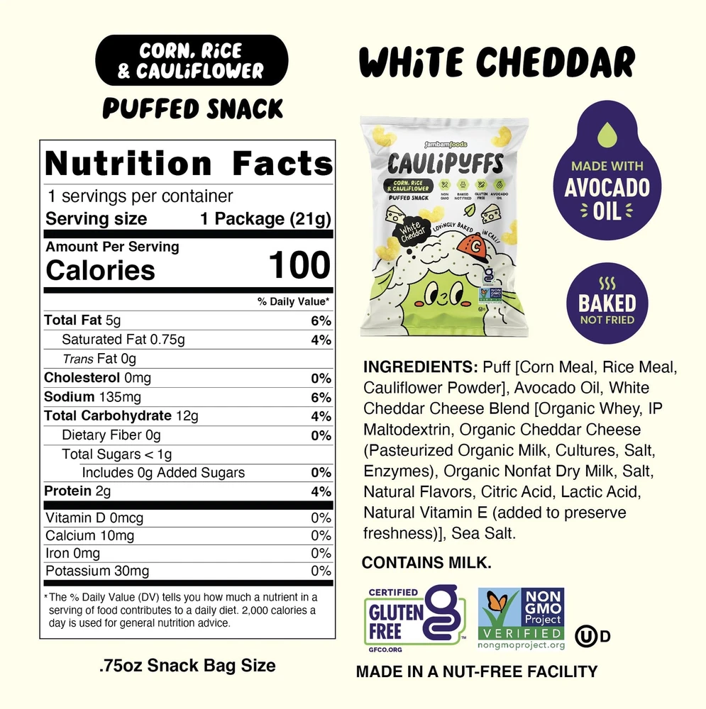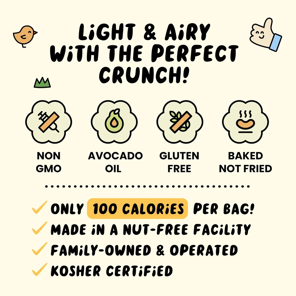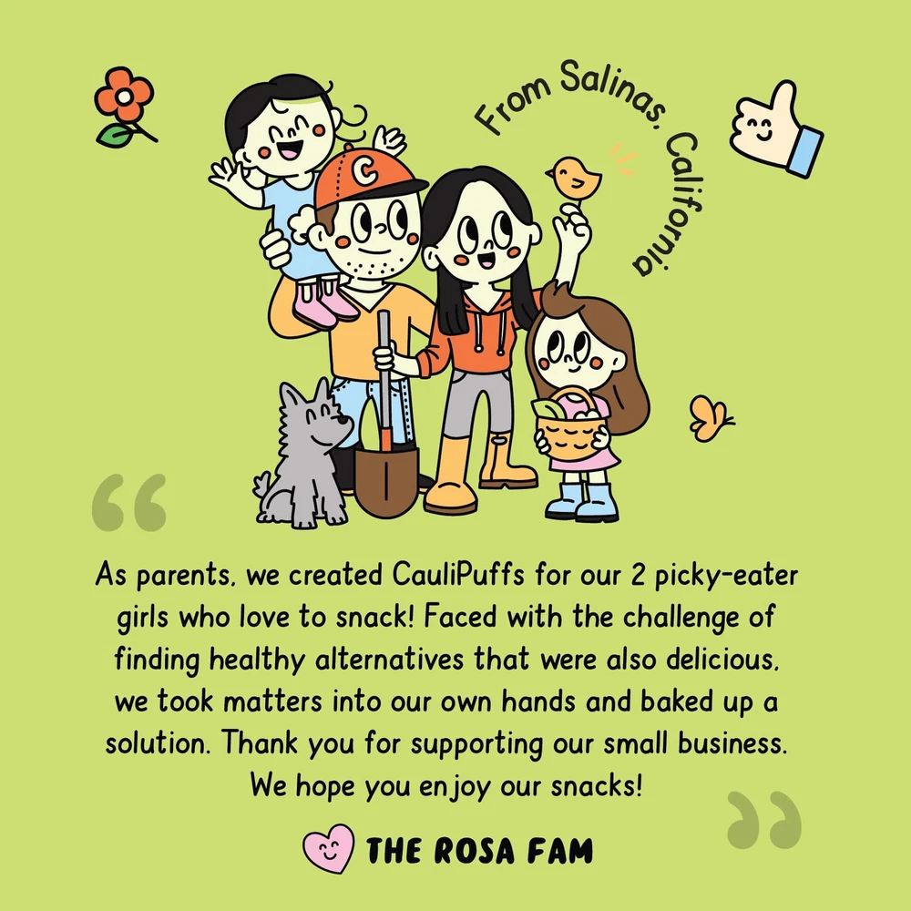 Luscious light and airy snack puffs, delightfully seasoned with cauliflower. Satisfy crunch cravings for the whole family. Guilt-free goodness, a healthy alternative to junk food - non GMO, gluten-free, baked in avocado oil and 100 calories. Perfectly portioned individual packed snacks for lunchboxes, backpacks and parties. Don’t let hunger interrupt your next adventure! Yummy snacks for tummies that do not stay on fingers (or Mommy’s dress!) No strong smells or squishiness, just mess and stress-free snacks. A family-owned brand, made with love in California. Sharing fun, health and adventure, from our family to yours.