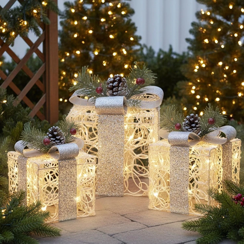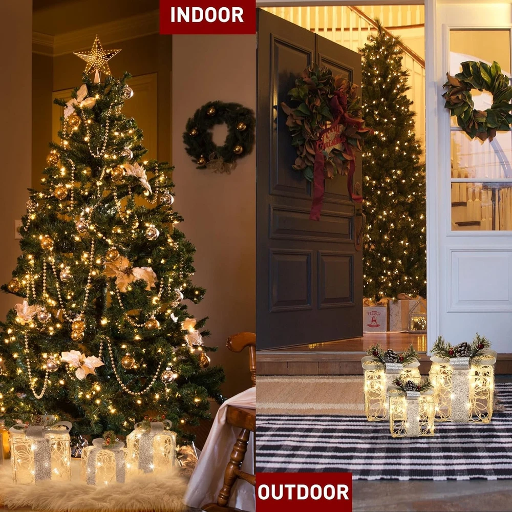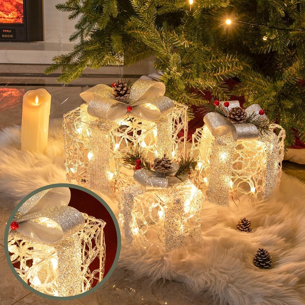 White Christmas Decorations, Set of 3 Christmas Lighted Gift Boxes, 48 LED Light LIGHTED CHRISTMAS GIFT BOXES: Set of 3 Christmas Gift Boxes; Large Box- 7.87 Inch; Medium Box- 6.37Inch; Small Box 5.5Inch; Adorned with silver bows; pine needles; and red berries; they bring joy and excitement to the room LIGHTED PRESENTS DECORATION: A hollow gift pack with 48 warm white LED bulbs; suitable for indoor and outdoor decoration; making your Christmas time memorable and full of fun WINTER HOME DECOR: Acrylic material; different sizes allow you to decorate in various ways to meet your decoration preferences; Stackable design for easier storage without taking up too much space CHRISTMAS YARD DECORATIONS: This Christmas gift box is equipped with 24 V UL listed waterproof adaptor safe with low voltage power and 16.4 FT lead-in to fully support Christmas outdoor needs CHRISTMAS DECORATIONS: Perfect for Bedroom, Living room, Porch, Pavilion, Lobby, Doorway, Patio, Yard, Garden and Lawn; Gift boxes under the Christmas tree as family members sitting together and unwrapping presents; accompanied by constant laughter Delivery within 3-4 days. Shipping as fast as possible Please contact if you have a question! HAVE A NICE SHOPPING!