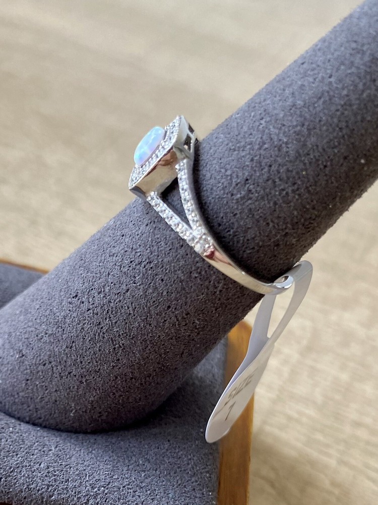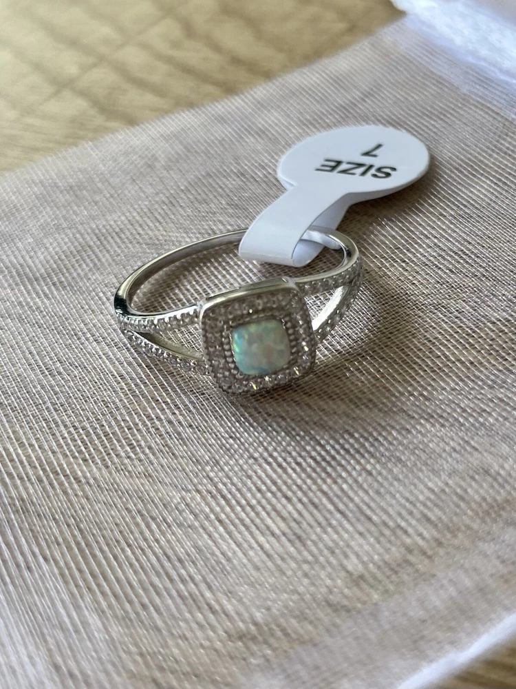 925 sterling silver ring , it features a square-shaped opal with inlaid cubic zirconia stones. The ring is hallmarked and comes in a elegant white colour. The ring is available in a size N All rings come in a gift bag