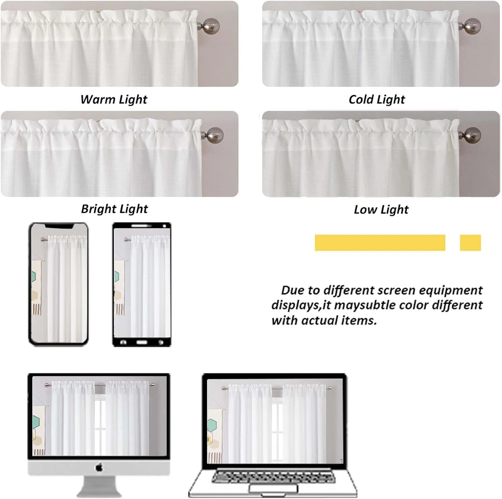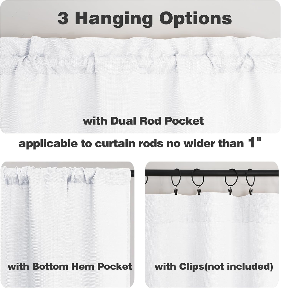 Fast Shipping On All Items 30 Days Money Guarantee Customer Support Excellent Service 100% Satisfaction Satisfaction Guaranteed White Curtains 45 Inch Length 2 Panels, Faux Linen Textured Semi S... Specification Item model number B0CKC314BM Style Modern Number of Items 2 Pattern Solid Package Weight 0.42 Kilograms Theme Fashion Opacity Light-filtering Unit Count 1.0 Count Room Type Bedroom, Dining Room, Kitchen, Living Room Product Dimensions 45"L x 30"W Material Polyester Top Style Rod Pocket Age Range (Description) Adult Seasons All Season Lining Description Unlined Model Name 2 Included Components No Curtain Form Drapes Indoor/Outdoor Usage Indoor Item Weight 14.9 ounces Compatible with Rod Size 2 Inches Special Feature Window Treatments Hanging Method Rod Pocket Color White Recommended Uses For Product Indoor Fabric Type 100% Polyester Product Care Instructions Machine Wash Size 30"W x 45"L (Pack of 2) 30.0 "w x 45.0 "w. Weight: 14.9 oz Item Description Size & Quantity: Each pack contains 2 pieces, each 30" wide and 45" long, total width is 60", total length is 46.5" including 1.5" header. The rod pocket applicable to curtain rods no wider than 1", the bottom hem rod pocket fits for curtain rods no wider than 1". High Quality Tier Curtains: These elegant white half window curtains are made of thick and heavy-duty faux linen textured fabric, which feels soft and goes well with any room style. Light Filtering Curtains: These semi sheer 45 inches curtains are sheer enough to let some light in but also thick enough to softly filter out glare sunlight and offer just the right amount of privacy. Perfect for living room, bedroom, study, kitchen cabinet, bathroom, basement, cabin and RV camper small windows. 3-Way Hanging options: Hang these bedroom curtains (1) with header rod pockets, fit for curtain rods up to 1"diameter , or (2) with clip rings, easy to slide and closed (clip rings are not included), or (3) pole top look, curtains bottom hem pocket fit for rods up to 1" diameter. Machine Washable: Machine wash cold in gentle cycle with like colors. Only non-chlorine bleach when needed. Tumble dry low. Remove promptly. Cool iron as needed. Product description Chyhomenyc Faux Linen Curtains Light Filtering Soft Textured Curtains Multiple Colors High Density Curtains for Home Multiple Colors High Density Fabric Used with Chyhomenyc Curtain Liners & Valance with Liner with Valance Floral Curtains Grommet Curtains Blackout Valance Blackout Tier Color Comparison 1 Multi Size 2 Light Filtering 3 Faux Linen Textured 4 Dual Rod Pocket 5 Clip Style Chyhomenyc Matching Curtains Add to Cart Add to Cart Add to Cart Add to Cart Add to Cart Customer Reviews 4.6 out of 5 stars 5,956 4.6 out of 5 stars 5,956 4.8 out of 5 stars 59 4.5 out of 5 stars 947 4.7 out of 5 stars 103 4.6 out of 5 stars 49 Price $15.97 $ 15 . 97 $15.97 $ 15 . 97 $16.99 $ 16 . 99 $17.99 $ 17 . 99 — $19.99 $ 19 . 99 Size 2x40"Wx84”L 2x52"Wx84”L 2x42"Wx84”L 2x40"Wx84”L 2x38"Wx84”L 2x50"Wx84”L Quantity 2 Panels 2 Panels 2 Panels 2 Panels 2 Panels 2 Panels Opacity Light Filtering 100% Blackout Sheer Light Filtering Sheer Light Filtering Material Faux Linen Faux Linen Faux Linen Faux Silk Jacquard Faux Linen Machine Washable √ √ √ √ √ √ About us We offer the best prices around on high quality products. Our E-store includes media such as books, movies, music and games while offering electronics, toys, sporting apparel, clothing, tools, general home, garden items and more. Shipping We are always working hard to ensure your package arrives as soon as possible. Please understand that some factors like weather, high postal traffic, and the performance of shipping companies are outside of our control. We offer free shipping to the lower 48 states and ship within 2-3 business days of payment, usually sooner. We do not accept P.O. Boxes. Please provide a physical address. For shipping outside of the continental USA, we only use eBay's Global Shipping Program.The item is shipped to KY and then sent to the rest of the world. International customers are responsible for all duties and taxes. Continue to check out to calculate costs for shipping the item to your country. Messages regarding eBay's Global Shipping Program MUST be directed at eBay EXCLUSIVELY. Returns We offer a 30-Day Return Policy on items in which you are not completely satisfied with. You have the option of a full-refund or an exchange of the item. No returns are available on items shipped outside of the USA Satisfaction We try over very best to make sure every customer is completely satisfied. If there's a problem, message us! We're happy to help. Payment Options Shop With Confidence