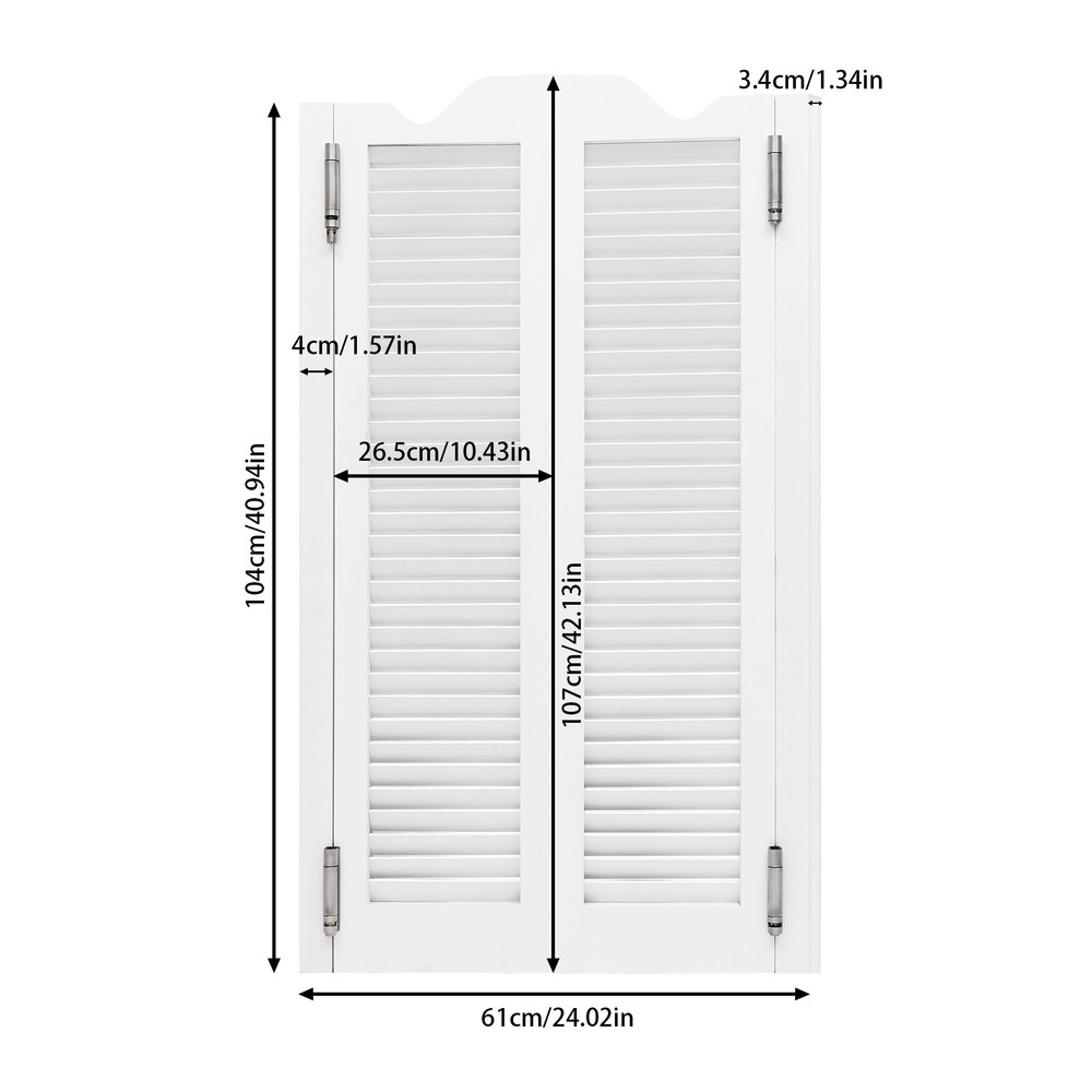 Specification Color: White Style: Countryside Material: Pine Wood, Aluminum Alloy Process: Polishing, Painting Indoor/Outdoor Use: Indoor Assembly Required: Yes Mount Type: Wall-Mounted Post Size: 4*3.4*104cm/1.57*1.34*40.94in Each Door Size: 26.5*3.4*107cm/10.43*1.34*42.13in Total Width: 61cm/24.02in Package Size: 108*35*8cm/42.5*13.8*3.1in Gross Weight: 12kg/26.46lbs Net Weight: 11kg/24.25lbs Package Included 1 * Double-door Partition Door 4 * Hinges Other Accessories for Installation Double-door Partition Door White Countryside Garden Entrance Partition Door Description Entering an extraordinary space, the magic of space is brought by our double-door partition door. Our product combines aesthetics and practical functionality to help you easily plan your room layout. The product uses high-quality materials to provide you with a safe and healthy environment. Rural style design can adapt to various decoration styles and enhance the overall style. Upgrade now and enjoy a high-quality life! Key Features Good Materials: The product is made of high-quality pine wood and aluminum alloy that have been polished and painted for high smoothness and hardness . It has stable performance and can maintain its beauty for a long time. User-friendly Design: The design of the double door can open and close 180 degrees without rebounding, bringing more convenience to use. In addition, the smooth hinges do not make too much noise, providing you with a quiet working or resting environment. Eco-friendly & Safe: This product uses water-based paint and uses natural pine wood as the main material, which does not release harmful substances, allowing you and your family to enjoy a healthy and safe environment. Practical Function: In addition to decoration, this product can also improve the layout of your home, protect privacy, and block sight, providing you with a comfortable indoor environment. Simple Installation: Simple construction and complete accessories allow you to complete the installation and start using it in a short time. Easy Clean-Up : The surface of the product is smooth and the structure is simple. You can easily use a soft cloth to wipe it clean. Ideal Gift: With a fresh appearance and complete functions, this item can be regarded as a holiday or housewarming gift for parents, friends, and lovers so that they can enjoy a more convenient life. Customer Service: We aim to provide quality products and services. If you have problems, please feel free to contact us. We will reply and solve the problem for you as soon as possible. Details Solid Doorposts: It is convenient for you to install and can also prevent damage to the wall. Reserved Grooves: They can help you quickly determine the hinge position and ensure a stable installation. Application This product can be widely used in corridors, kitchens, clubs, libraries, checkout counters, offices, cafes, shopping malls, bars, reception rooms, clubs, living rooms, balconies, terraces, and other scenarios. Installation Steps for Hinges 1. Hands-on the doorpost to make holes in the wall and install expansion bolts. 2. Fasten the hinges to the doorpost and the door. 3. Insert an Allen key into the adjustment hole to each hinge, and insert the pin. 4. Adjust the bottom hinge in the same way. 5. All hinges must be installed at the same time. Specification Color: White Style: Countryside Material: Pine Wood, Aluminum Alloy Process: Polishing, Painting Indoor/Outdoor Use: Indoor Assembly Required: Yes Mount Type: Wall-Mounted Post Size: 4*3.4*104cm/1.57*1.34*40.94in Each Door Size: 26.5*3.4*107cm/10.43*1.34*42.13in Total Width: 61cm/24.02in Package Size: 108*35*8cm/42.5*13.8*3.1in Gross Weight: 12kg/26.46lbs Net Weight: 11kg/24.25lbs Package Included 1 * Double-door Partition Door 4 * Hinges Other Accessories for Installation Notes Please note that the installation width should be greater than the product width . Please do not expose the product to sunlight or soak it in water for a long time. It is normal that the expansion screw will blow up after the force is applied. Please allow the slight color difference caused by the shooting light and 1-3cm error due to manual measurement, and make sure you do not mind before ordering. Payment Delivery details Terms of sales About us Contact us Payment We accept ebay payment 。 Fees such as import duties, taxes are not included in the item price or shipping costs. These charges are the buyer's responsibility. Delivery details Shipping: 2-9 working days to: USA Terms of sales We maintain high standards of excellence and strive for hundred percent customer satisfaction. Feedback is very important to us. We hope that you contact us immediately before you give neutral or negative feedback, so that we can address your concerns. It is impossible to address issues if we do not know about them! About us Your satis faction is our ultimate goal. We work hard to earn your trust and future business. Our certified technicians have tested each item before shipping. The unit comes with 1 year limited warranty on all manufacturing defects. a) If you receive a defective item, you may return it or ask for a discount. Please contact us within 14 days after you receive the package. b) What you returned must be intact and in its original packaging as re? u. Customer is responsible for shipping costs of the returned item. c) We will cover the cost of shipping back t with the shipping rate indicated in the registration page. We will send you a new unit or refund the full payment you paid. Thank you. Contact us Business Hour Business Hour: Monday To Friday: 8:30 AM to 5:00 PM (Beijing China time) Due to time zones, our reply to your questions may not be immediately. But within above working time, we will reply your email within 24 hours. If it's non-workdays, please kindly be patient and wait till Monday. Please contact us with ebay message. Please feel free to contact us if you have any questions. Monday To Friday: 8:30 AM to 5:00 PM (Beij