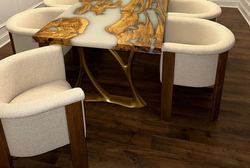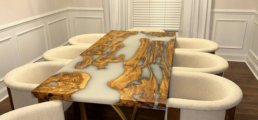White Epoxy Dining Table Top, Wooden Epoxy Resin Living Area Furniture Home Deco