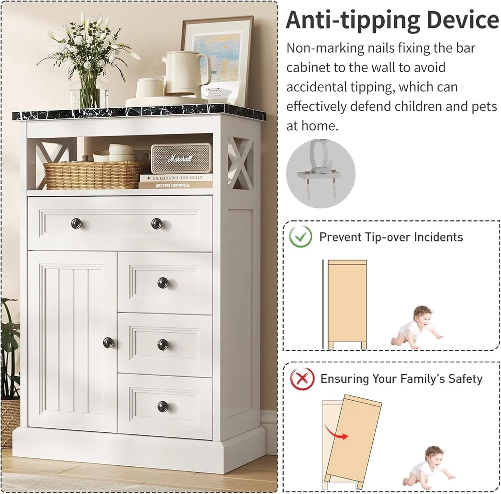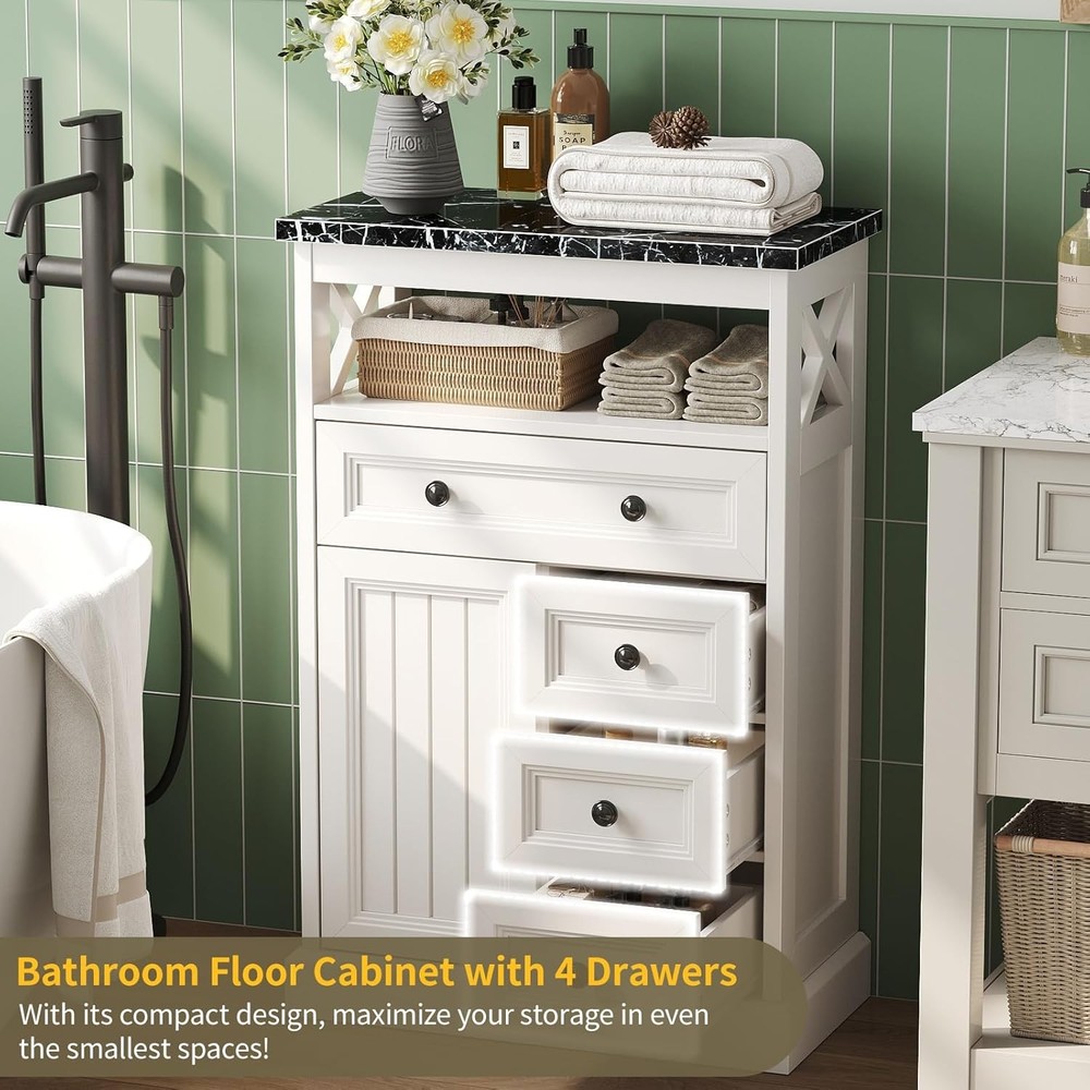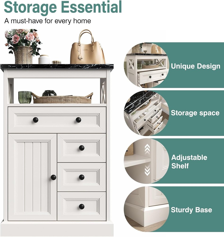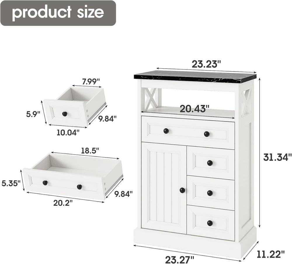 White Bathroom Storage Cabinet with Doors & 4 Drawers, Freestanding Floor Cabinet with Adjustable Shelf, Wooden Storage Organizer, Marble Pattern Tabletop for Living Room Product Description About this item [Elegant Black Marble Countertop]: This sideboard features a premium marble countertop, which not only gives the whole furniture a modern and luxurious look, but also has excellent wear and heat resistance. The marble surface is easy to clean and suitable for everyday use, adding a touch of sophistication and elegance to your dining room. The aesthetic of the cabinet is absolutely gorgeous and goes ideally with the farmhouse chic look [Sturdy Structure]: This sideboard is made of medium-density fiberboard (MDF), which is sturdy, durable, and highly stable. Waterproof surface, great coating with moisture resistance. And also with metal soft hinges and polished round black handles, making this cabinet scratch-resistant and wear-resistant [Impressive Storage Capacity]: It comes with 4 large-capacity drawers that can easily store small items such as tableware and snacks, or to hide all the bathroom, living room clutter. There is also 1 open storage compartment for easy access to frequently-used items, allowing you to see everything at a glance. On one side, there is a door that can be opened, and inside, there are adjustable partition to flexibly adjust the storage space and meet diverse storage needs [Compact Size for Versatile Placement]: With a compact size 23"W x 11" D x 31"H. Whether it's in an apartment, a small home or a compact dining area, this sideboard fits in skillfully and is both practical and aesthetically pleasing, it can be easily positioned, saving space in your home while providing practical storage functions [Easy Assembly]: This wood cabinet package comes with tools that needed to install and clear step-to-step instructions. If you encounter any quality issues during use, please let us know that we have a professional customer team that will provide you with the optimum solution 23" Wide Bathroom Cabinet with Barn Doors Upper open storage place, smooth gliding drawer and the cabinet with double barn doors for internal storage. It is suitable for storing aromatherapy, toiletries, paper towels, and other bathroom items, better planning your bathroom space Freestanding Wooden Storage Organizer with Plenty of Storage Space Farmhouse Style Charm Floor Storage Cabinet Dimensions: 11.2"D x 23.3"W x 31.3"H Simple appearance design, blending seamless with your furniture style, create a country farm style home Combining farmhouse style with modern functionality, minimalist design with enormous capacity, this buffet sideboard features both exquisite black marble grain and barn-inspired silhouettes. The drawers slide smoothly, and the door opens and closes effortlessly, ensuring convenient operation that can be easily mastered by both the elderly and children Modern Farmhouse Floor Cabinet & Buffet Storage Cabinet / 5 Drawers Chest Anti-tipping Device Sturdy and Stable Non-marking nails fixing the bar cabinet to the wall to avoid accidental tipping, which can effectively defend children and pets at home More Farmhouse Sideboard with Black Marble