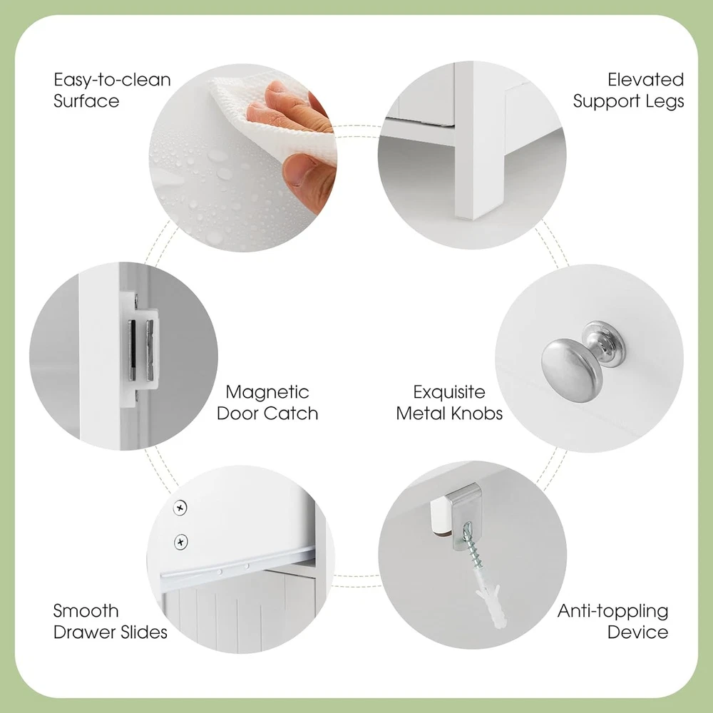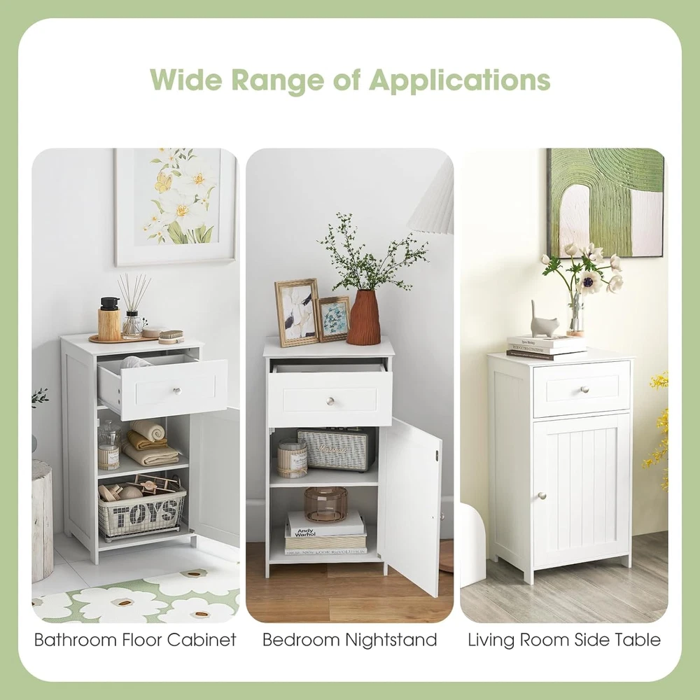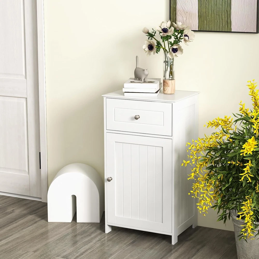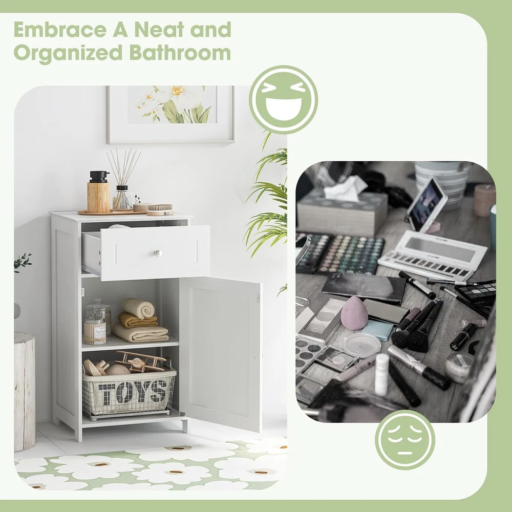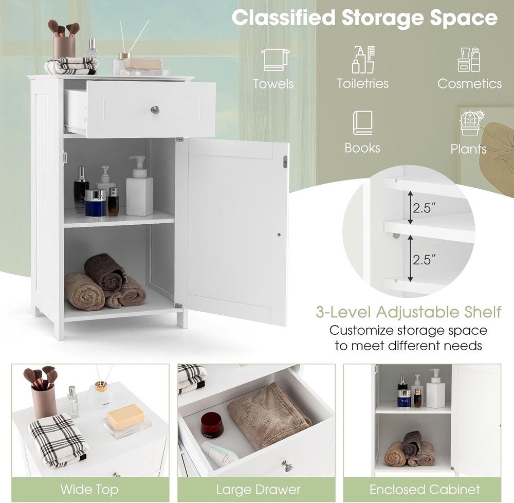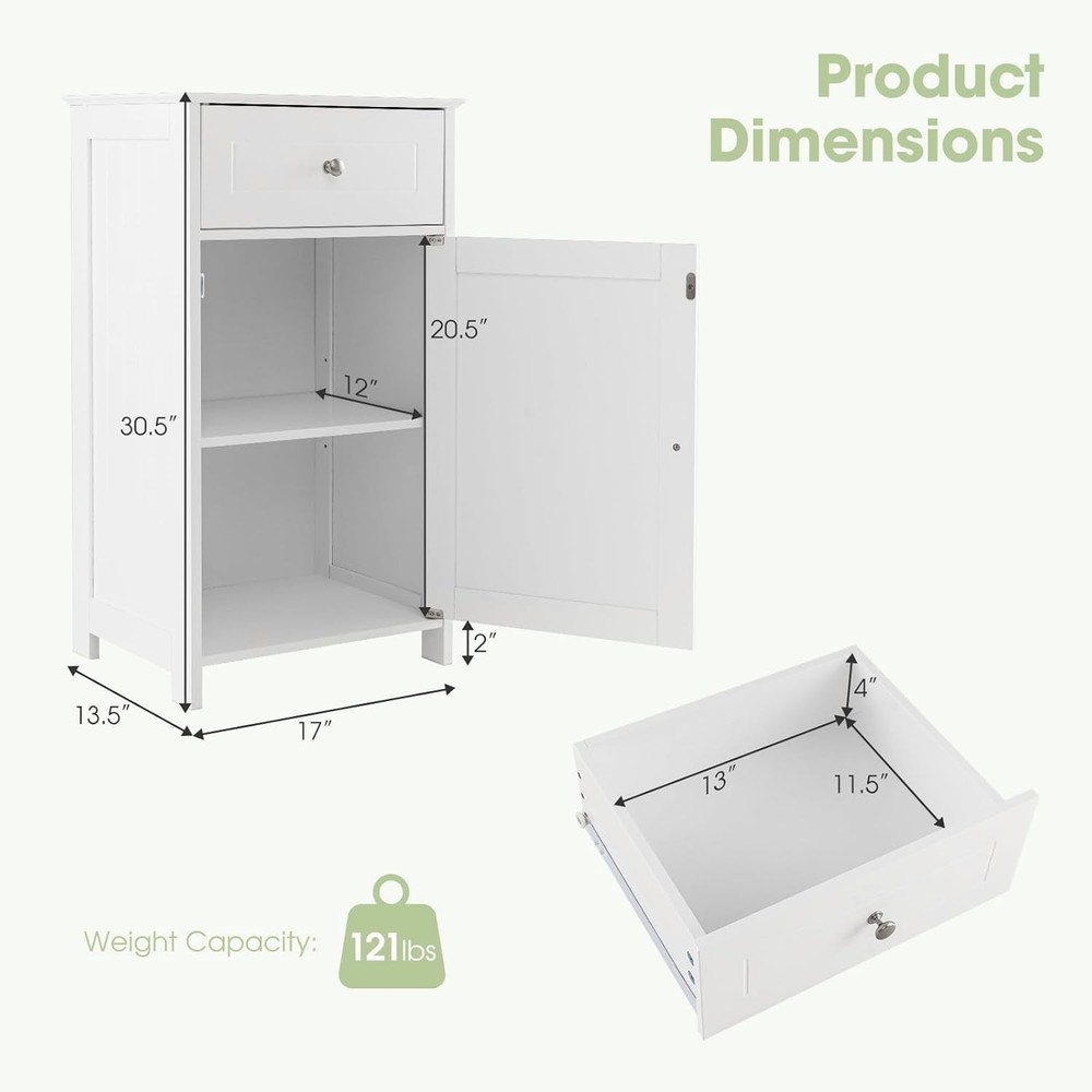 Product Description About this item 【Ample Storage Space】With a large one door cabinet, a drawer and a cabinet top, this bathroom cabinet provides plenty of storage space for your towels, toilet paper, shampoo, shower gel and other toiletries. 【Adjustable Shelves】The shelf inside the single door cabinet can be adjusted in 3 positions to fit your items in different heights. You can also remove this board if you need to store something in large size. 【Sturdy & Safe Structure】Constructed with thickened boards and strong elevated legs, this freestanding cabinet for bathroom is durable in a long time. Besides, there are anti-toppling devices behind to ensure safety in daily use. 【Easy to Assemble & Clean】With detailed instruction included and all parts labeled clearly, this floor cabinet can be easily assembled without effort. The smooth and waterproof surface is also easy to clean with some damp cloth. 【Multipurpose Cabinets】This simple cabinet in modern style can fit with kinds of decorations in your room. Whether to put it in the bathroom for storage, in the living room as side table or in the bedroom as nightstand, it could serve the purpose well. Description If you need some extra storage unit in your home, our multifunctional floor cabinet is a good choice for you. The simple modern style fits with kinds of decorations. There are sufficient storage space with one drawer, a one-door cabinet and the cabinet top. Besides, the shelves inside the cabinet can be adjusted in 3 positions for flexible use. As for the quality, thickened boards and anti-toppling devices behind ensure sturdiness and safety in a long time. You can put it in the bathroom, living room or bedroom for both storage and decor. Features ·Simple modern style fits most decorations ·Plenty of storage with a drawer, a cabinet and a top ·Adjustable shelves for flexible use ·Thickened boards for sturdiness ·Anti-toppling devices for safety ·Smooth drawer slide and magnetic door catch for convenience ·Detailed instruction easy to assemble ·Smooth and waterproof surface easy to clean Specification Color: White Material: P2 MDF Overall Dimension: 17’’ x 13.5’’ x 30.5’’/43cm x 34cm x 77cm(W x D x H) Net Weight: 22.3 lbs/10.1kg Total Weight Capacity: 122 lbs/55kg Package Includes: 1 x Bathroom Floor Cabinet 1 x Instruction On Aug 17, 2025 at 19:26:21 PDT, seller added the following information: