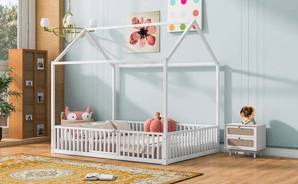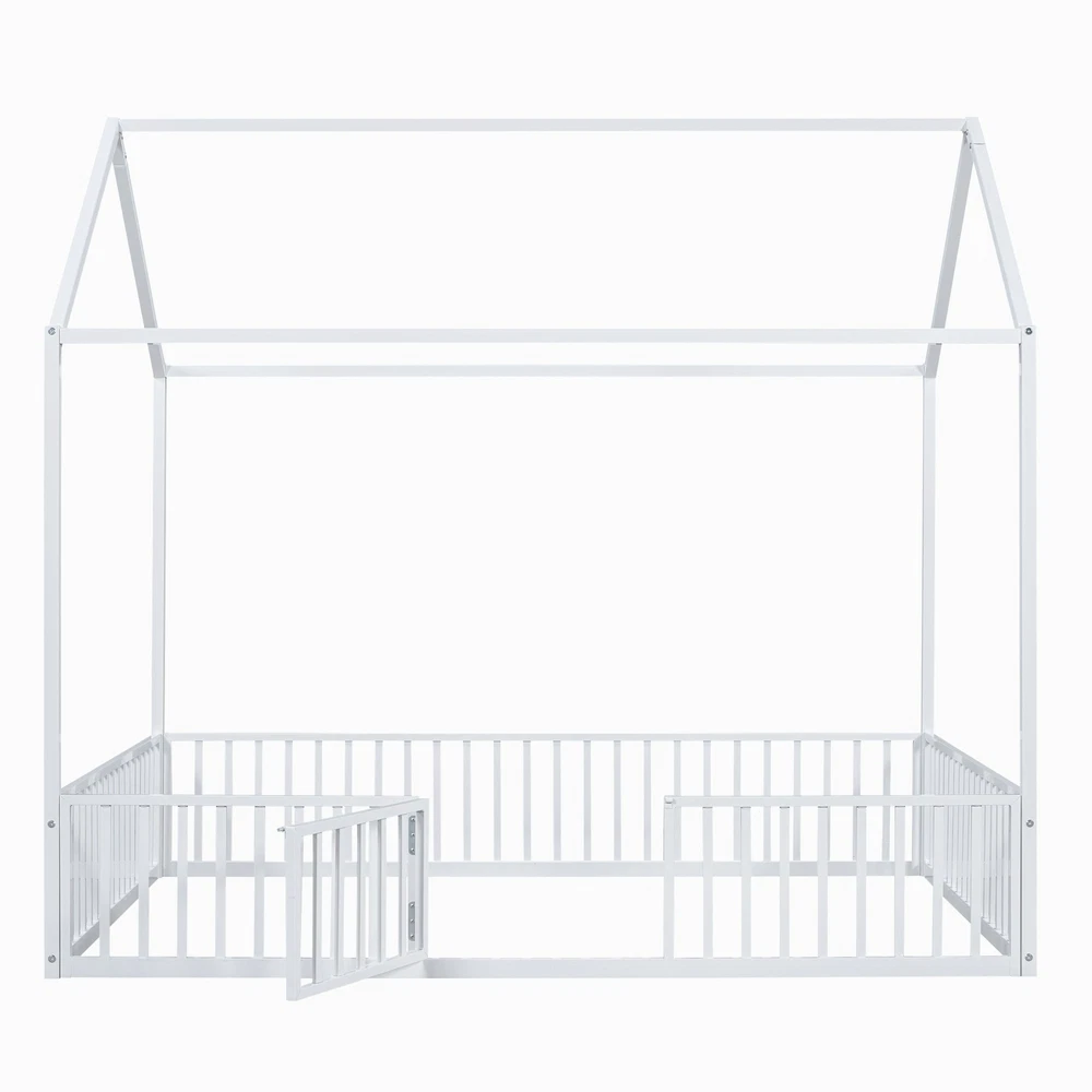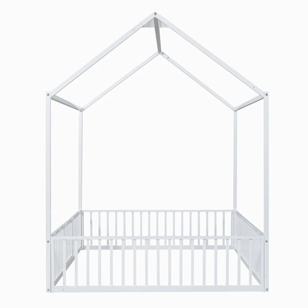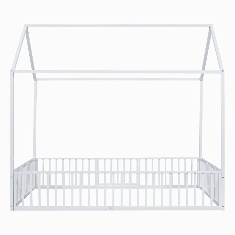 Specifications Place of Origin #originPlace# Main Color White Main Material Metal Dangerous Goods #dangerFlag# Dimensions & Weights Assembled Length (in.) 77.00 Assembled Width (in.) 56.10 Assembled Height (in.) 71.50 Weight (lbs) 72.00 Product Features [House-Shaped Design] The house bed featuring a classic house-shaped, this imaginative bed is equipped with a whimsical sky roof and uniquely shaped guardrail for a fun bedroom environment that your child will love. [Distressed Washed Design] This house bed has a distressed washed design, which gives a very special feeling and makes this bed unique. [A Better Space to Play] You can choose not to put the mattress in the bed frame, but let the child freely DIY this space to fully stimulate the child's creativity. [Fence with Door] The bed is fenced around the perimeter, but it is not a completely enclosed space because it has a small door over the fence. Kids can enter and exit freely through this small door. [Solid Construction] The house platform bed crafted from high-quality metal can last for long time use. The roof and fence are made from metal, ensuring strong stability and durability. Description Full Size Metal House Bed with Fence and Door With a roof, fence and a small door that can be opened and closed, this bed offers an enclosed play area perfect for exploring their imagination. This bed has a washed old design, regardless of gender, suitable for different people. This bed comes with a fence and a sturdy metal frame, providing a safe space for your child to get a good night sleep. Description Material Metal Size Full Color White Numbers of Package 1 Spring Box No need Assembly Required Yes <