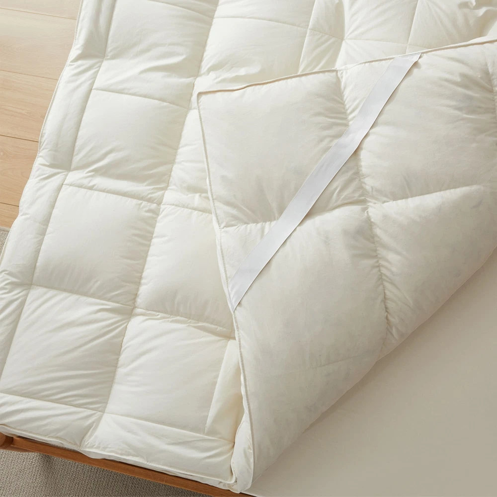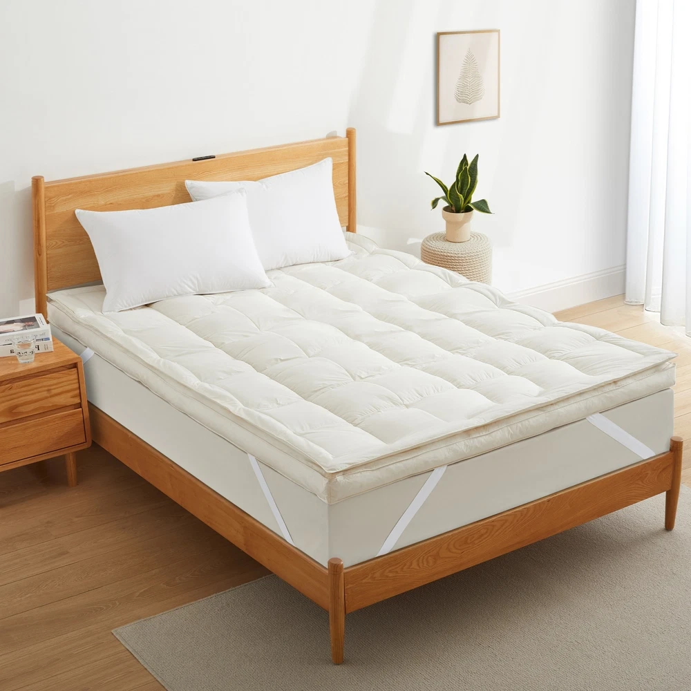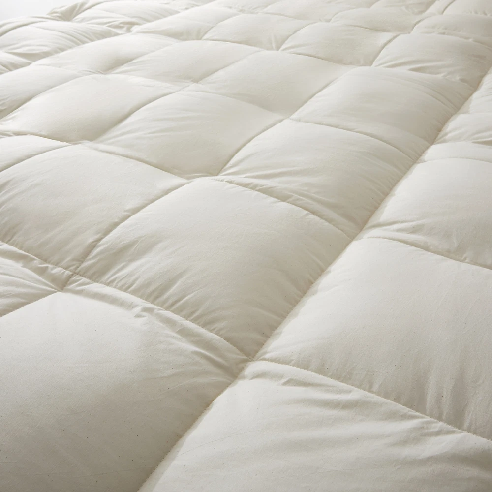 Elevate your sleep experience with our organic cotton pillow top mattress topper feather bed. This luxurious mattress topper features a five-layer construction designed for enhanced comfort and support. The top chamber is filled with 100% polyester, while the bottom chamber is filled with a blend of 95% white goose feather and 5% white goose down. Crafted from 100% organic cotton, this mattress topper is gentle on your skin and environmentally friendly. With its 3-inch thickness and stretchy straps, it easily fits mattresses up to 18 inches deep. Available in four sizes, this mattress topper is a perfect addition to ensure a restful and rejuvenating sleep. Features: Blend of white goose feathers and soft poly for luxurious comfort Ideal for those with back problems or joint pain Free Shipping Over $49.99* Details White Goose Feather Bed Fitted Mattress Topper with 100% Organic Cotton Cover Product Description: Elevate your sleep experience with our organic cotton pillow top mattress topper feather bed. This luxurious mattress topper features a five-layer construction designed for enhanced comfort and support. The top chamber is filled with 100% polyester, while the bottom chamber is filled with a blend of 95% white goose feather and 5% white goose down. Crafted from 100% organic cotton, this mattress topper is gentle on your skin and environmentally friendly. With its 3-inch thickness and stretchy straps, it easily fits mattresses up to 18 inches deep. Available in four sizes, this mattress topper is a perfect addition to ensure a restful and rejuvenating sleep. Features: Blend of white goose feathers and soft poly for luxurious comfort Ideal for those with back problems or joint pain Available in twin, full, queen, and king sizes to fit any bed Unbeatable comfort and gentle support Spot clean only or professionally dry clean Materials: Cover shell made of 100% white cotton for a soft and breathable feel Top layer of stuffing made of 100% polyester, while the bottom layer is made of 95% white goose feather and 5% white goose down Dimensions: TWIN SIZE39" x 75" x 3" FULL SIZE54" x 75" x 3" QUEEN SIZE60" x 80" x 3" KING SIZE78" x 80" x 3" Filling Weight: TWIN SIZETop Chamber 10 oz; Bottom Chamber 137 oz FULL SIZETop Chamber 13 oz; Bottom Chamber 189 oz QUEEN SIZETop Chamber 16 oz; Bottom Chamber 224 oz KING SIZETop Chamber 21 oz; Bottom Chamber 291 oz