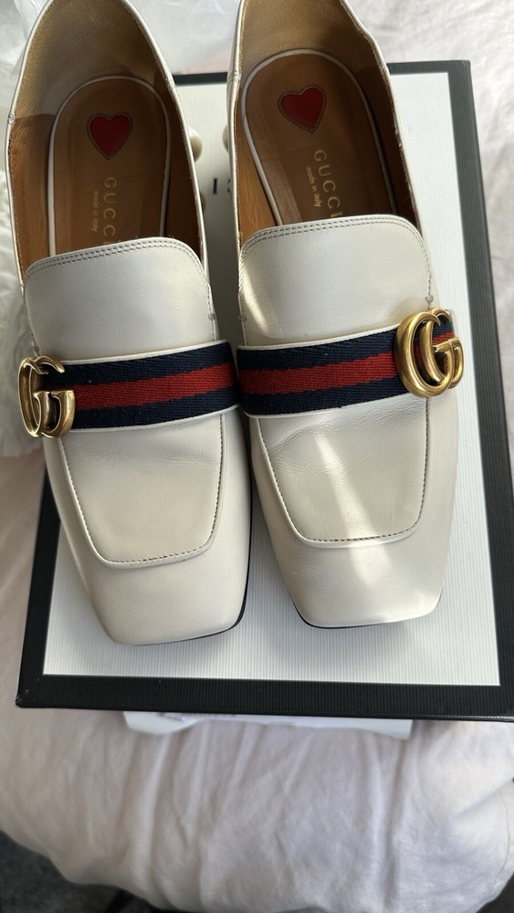 Toe Shape: Square Toe Type: Heel Theme: Metal Brand: Gucci Color: White Department: Women Heel Style: Block Pattern: Solid Heel Height: High (3-3.9 in) EU Shoe Size: 37 Style: Pump US Shoe Size: 7 Upper Material: Leather