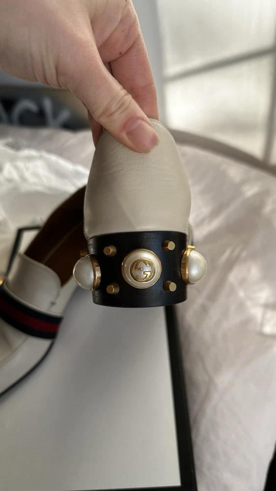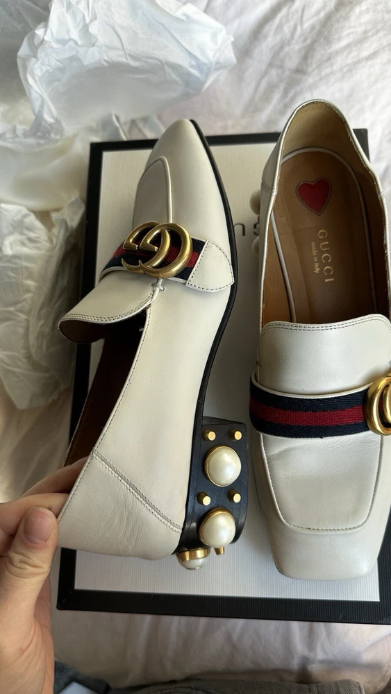 Size 37 Betis Glamour Calfskin Web Pearl Embellished Peyton 35mm Loafer Pumps in good condition. Bought from poshmark but do not fit, some wear on the leather and some other spots as you can see in pictures but other than that these are gorgeous heels with a cute strap and embossed GG on the front and back. Gold detailing and comes with box and 1 dust bag.
