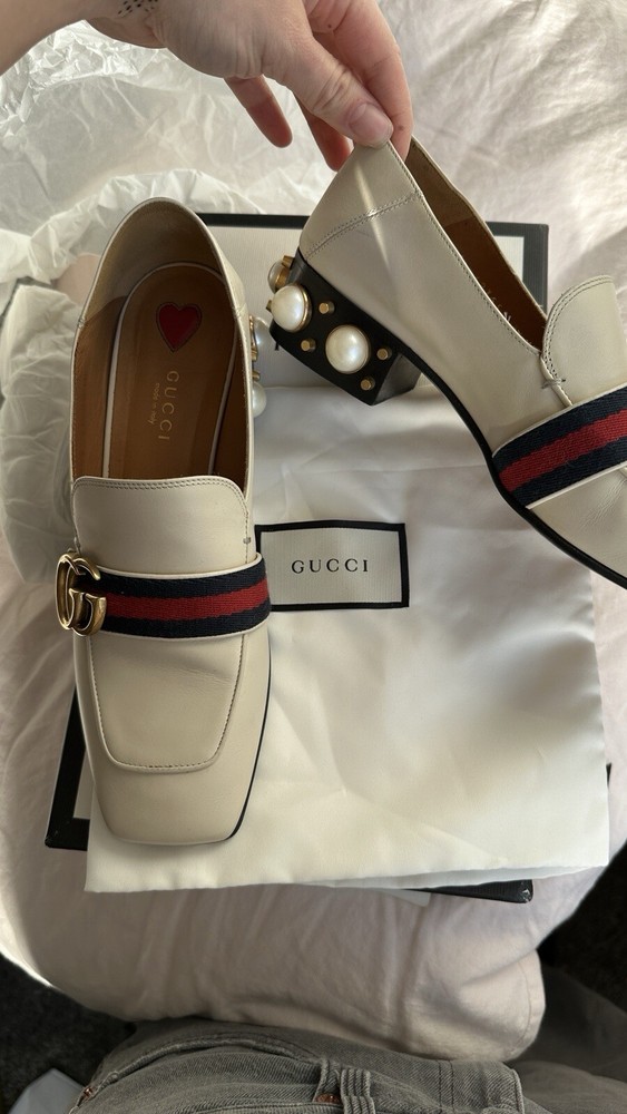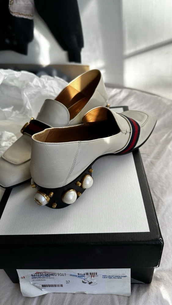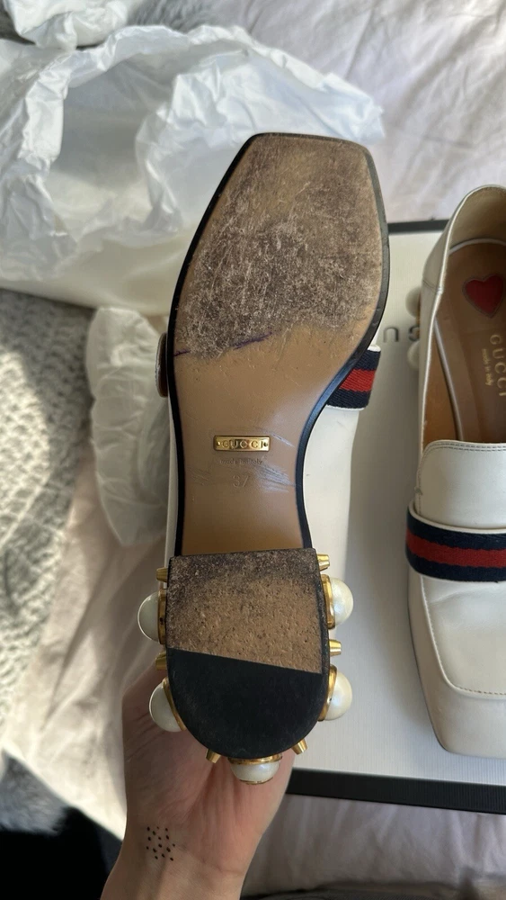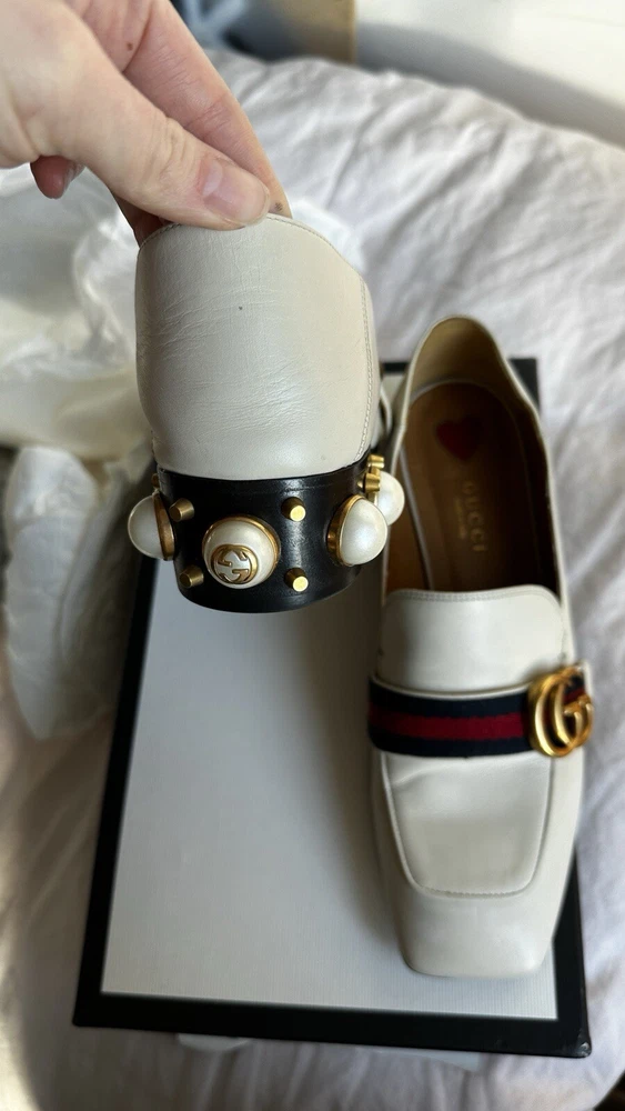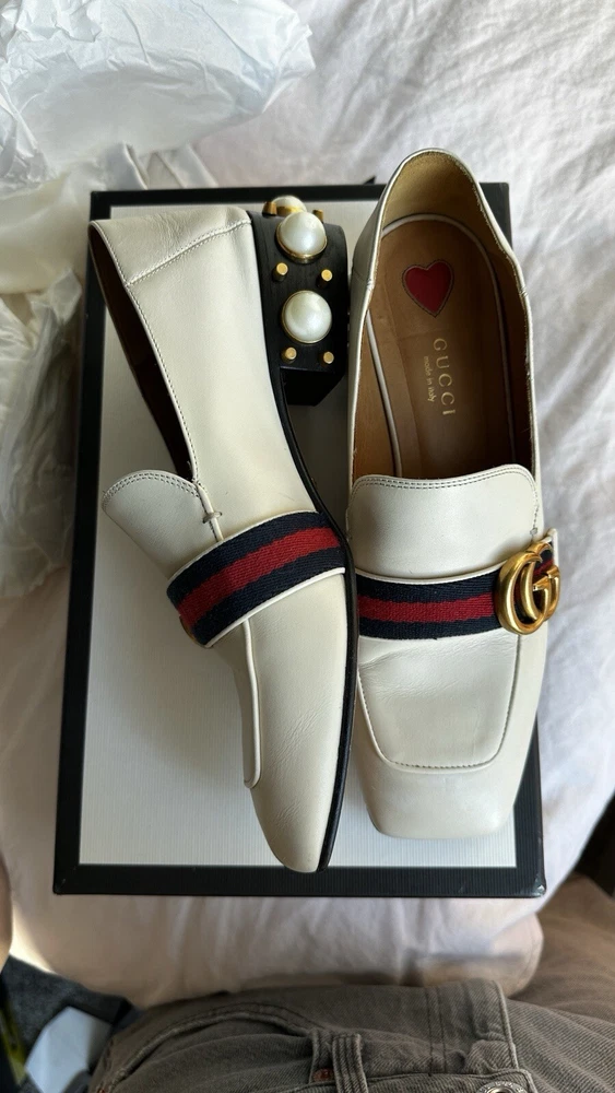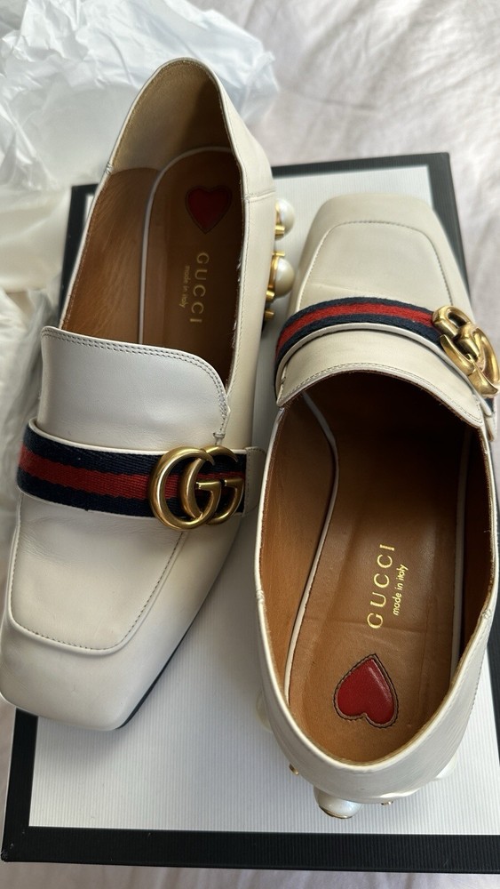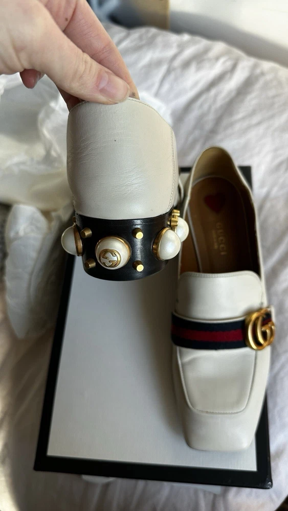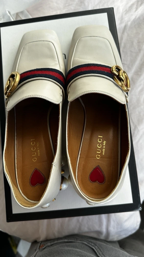 1. These stunning Gucci heels are a dream—gorgeous pearl embellishments, chic gold detailing, and the iconic GG embossed logo. The calfskin leather is soft with minor wear, but they still look luxurious. The strap adds a flirty touch, and they come with the original box and dust bag. A must-have for any fashion lover!
