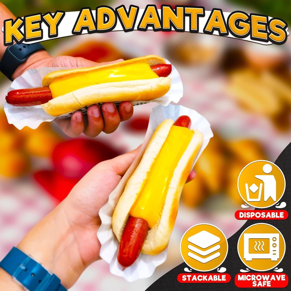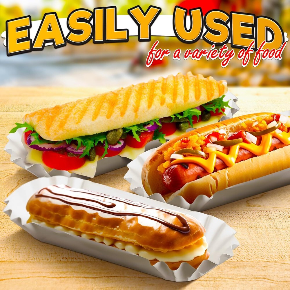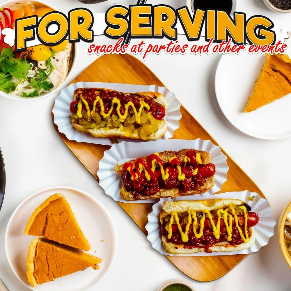 Product Description High Quality Disposable Serving Trays: These disposable food trays are made of premium quality dense paper. These hot dog trays disposable are durable, disposable and recyclable. These disposable trays for serving food can be a better alternative to plastic food trays. The 1 inch high side walls of our disposable party trays help you to keep your hands and clothes protected from ketchup and mustard stains. Size of Disposable Food Boats: In our pack of hot dog boats disposable you will get 50 pieces of hotdog trays disposable with a food capacity of up to 0.32 Oz. The length of our paper food boats is 8.26 inches. The width of our hot dog food tray is about 4.13 inches and 1.5 inch tall. Our white trays for serving food has convenient size so they are easily carry around anywhere. our white hot dog plates giving you peace of mind. Fluted Design of Paper Serving Boats for Food: The wave design of our food boats disposable plate keeps the hot dog steady, so you don't have to worry about it falling out. The medium-weight construction of paper food boat is strong enough for hot dogs piled high with all the classic toppings. Our hot dog holders are designed to be disposable when you are done, just simply toss in the trash for a quick and easy clean-up. Grease Resistant Hotdog Tray: With the help of these disposable trays for parties you can enjoy your food without worrying about spillage or grease stains seeping out of the bottom and onto your hands or clothes. Our rectangular hotdog boats disposable taco plates for party will make your food look stylish and professional. Our paper food trays disposable are stackable which is helping you to save your storage space. Wide Applications of Paper Serving Trays: These paper boat trays are perfect for serving food at parties, carnivals, festivals, movie theaters, concession stands, indoor and outdoor events. These hotdog holder disposable plates are perfect for summer grilling and BBQ. Our paper trays for food disposable plate can also be a perfect gift for mother, teacher, wife and the person who love BBQ and hot dog.
