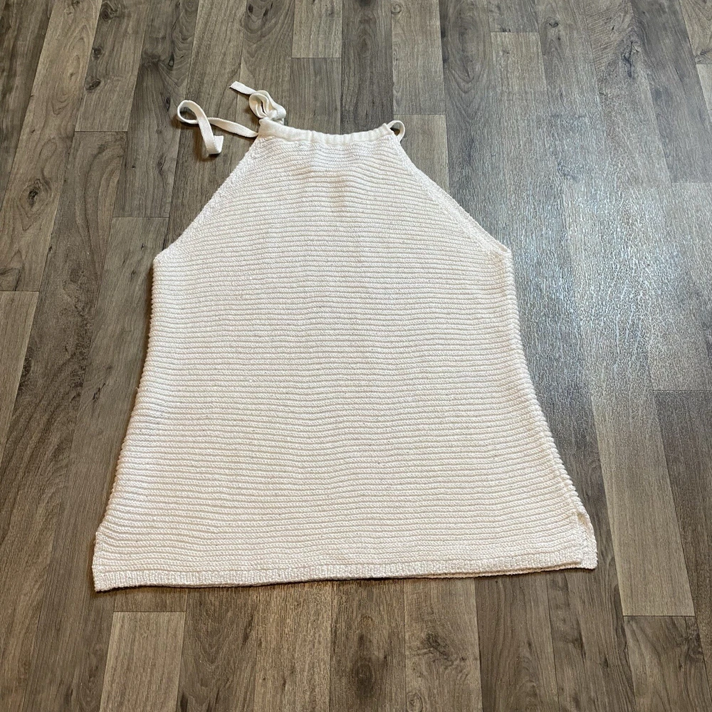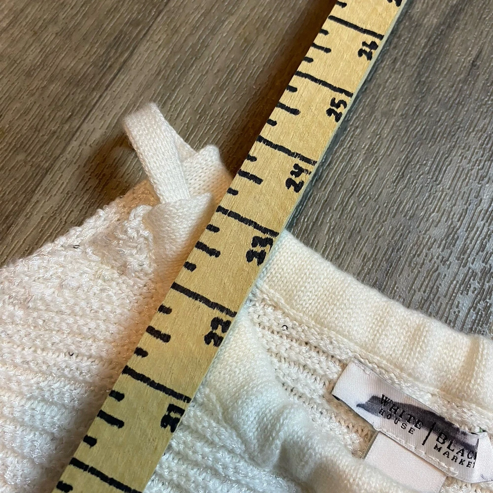 White House Black Market Women’s Size Large Knit Halter Blouse White with subtle sparkly sequins throughout Ties around the neck to the side Polyester cotton rayon blend Excellent Condition Pit to pit: 18 inches Total Length: 23 inches