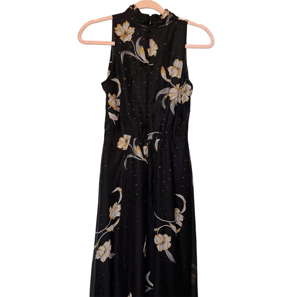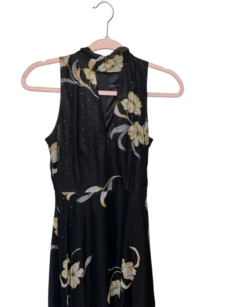 This White House Black Market halter maxi dress is a stunning piece that exudes elegance and style. The dress features a beautiful floral pattern, sleeveless design, and a keyhole V-neckline that adds a touch of sophistication to the overall look. The high-low hem and handkerchief straps are perfect accents that enhance the dress's charm. The dress is made of a poly blend fabric that gives it a lightweight and airy feel, making it perfect for any season. It has a zip closure and is available in black size 0. This dress is perfect for any occasion, from formal events to casual outings. The dress is a must-have for any fashion-forward woman who wants to make a statement.
