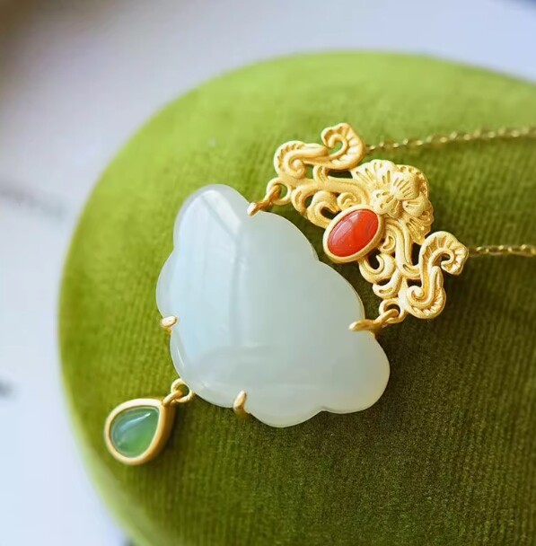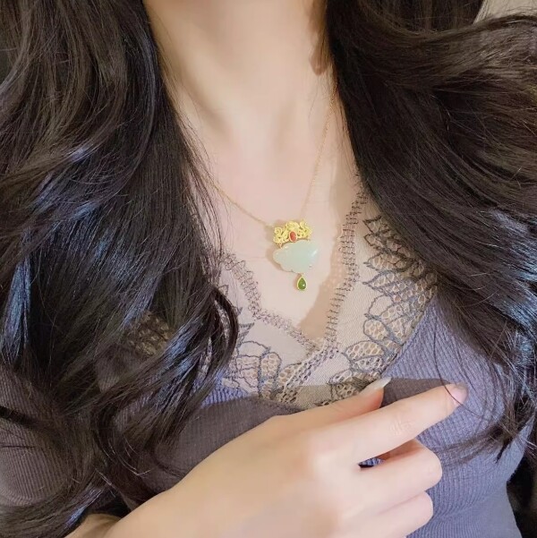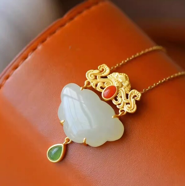 White Jade Ruyi Pendant Necklace in 925 Silver with Natural Chalcedony