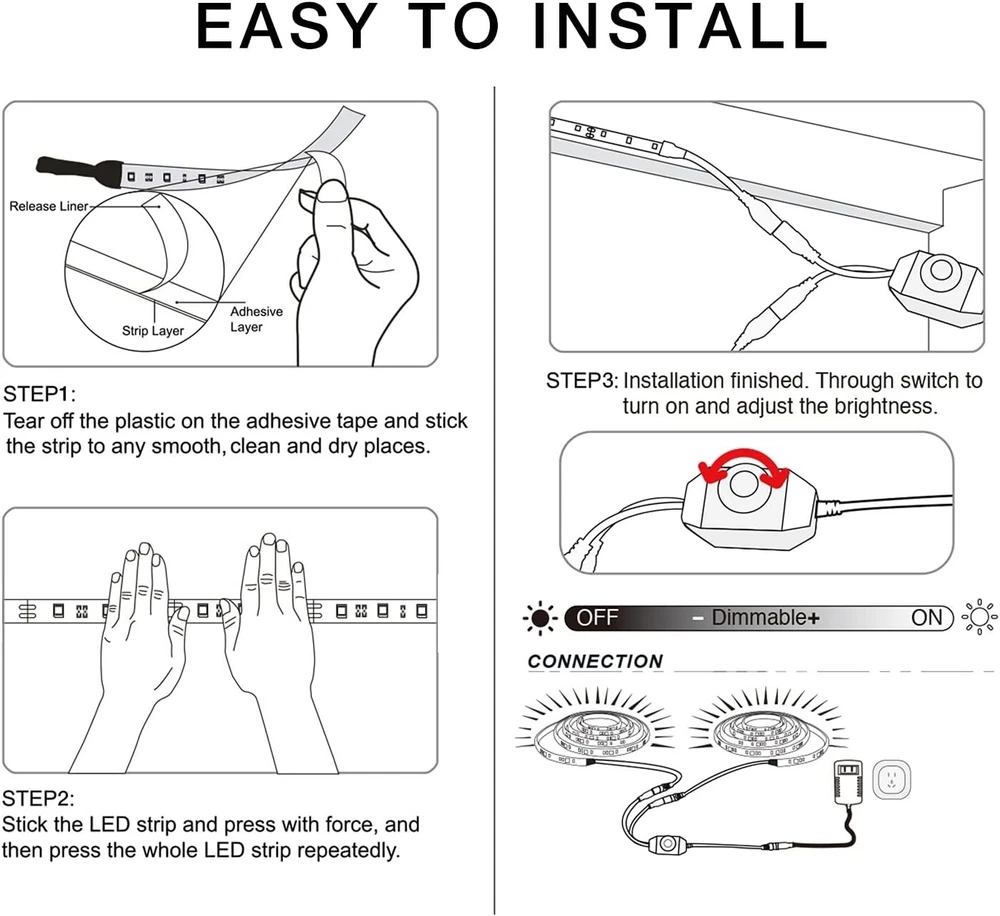 White LED Strip Light, 40ft Dimmable Bright Rope Light, 6500K 24V Light Strips, 720 LEDs 2835 Tape Lights for Bedroom, Kitchen, Mirror, Home Decoration2 Rolls of 20ft Daylight white: White led strip lights use 40ft 720 high quality LEDs and 6500K color temperature, it will help you light up those dark rooms, cabinets, mirrors and any corner Adjust brightness: The dimmer allows you to adjust the brightness of led white lights for various occasions. You can use the control box to dim or brighten your led light strip Simple installation: The installation of the strip lights is very simple, before the installation, please keep the surface dry and clean Flexible cuttable: You can also cut the length of the light strip according to your own needs, just be careful you should cut between every 3 LEDs with the cutting mark (packaging without the lights connector) Widely use: Powered by a 24V working voltage, the white led strip lights can be suitable for indoor lighting and decor LED Strip Lights White led strip lights Add to Cart Cob super led lights See Details TV led backlights Add to Cart LED strip lights Add to Cart LED lights for room Add to Cart LED lights for bedroom Add to Cart Warm led lights Add to Cart Customer Reviews out of 5 stars 2,505 out of 5 stars 2,505 out of 5 stars 1,557 out of 5 stars 13,343 out of 5 stars 21,643 out of 5 stars 49,277 out of 5 stars 2,505 Price $$ — $$ $$ $$ $$ $$ Length 40FT 60FT 100FT 100FT Roll 2 Rolls 1 Rolls 1 Rolls 2 Rolls 1 Rolls 2 Rolls 1 Rolls Color Daylight white Super daylight white RGB RGB RGB RGB Warm white Control way Dimmer Dimmer 20 key remote and app 44 key remote 44 key remote and app 24 key remote and app Dimmer Voltage 24V 24V 5V 12V 24V 24V 12V