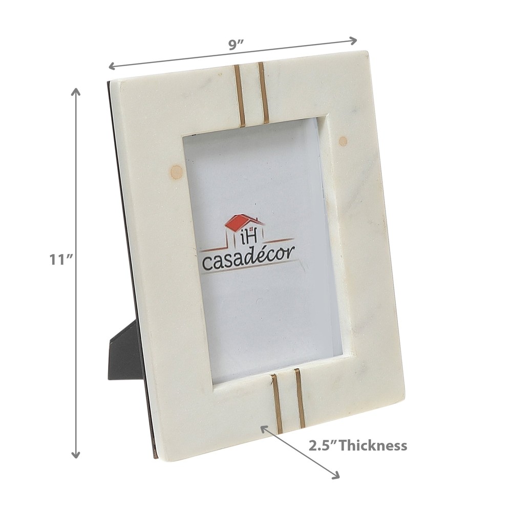 Perfect for displaying family photos or treasured snapshots, this innovative picture frame adds a touch of opulence to your home decor. It has a classic white color that is sure to enhance any space with timeless subtlety. The durable brass inlay creates a captivating contrast and enhances the frame's overall aesthetic appeal. Crafted from stone, the photo frame perfectly ensures durability and longevity. Highlighted Features: A gorgeous piece of home decor, this picture frame exudes a sophisticated exterior which is made from splendid white marble. Its neutral color palette effortlessly integrates into various interior design schemes and becomes a focal point in any room, showing your love of capturing moments in time with grace. Adding to your living space aesthetic, the combination Free Shipping Over $49.99* Details White Marble Brass Inlay Picture Frame 6X4 Product Description: Perfect for displaying family photos or treasured snapshots, this innovative picture frame adds a touch of opulence to your home decor. It has a classic white color that is sure to enhance any space with timeless subtlety. The durable brass inlay creates a captivating contrast and enhances the frame's overall aesthetic appeal. Crafted from stone, the photo frame perfectly ensures durability and longevity. Highlighted FeaturesA gorgeous piece of home decor, this picture frame exudes a sophisticated exterior which is made from splendid white marble. Its neutral color palette effortlessly integrates into various interior design schemes and becomes a focal point in any room, showing your love of capturing moments in time with grace. Adding to your living space aesthetic, the combination of marble and brass makes this photo frame stand out in terms of quality as well as visual experience. Sold as per piece, the picture frame has a dimension of 7 X 0.6 X 7 in inches. The rectangular frame perfectly blends traditional elegance with modern aesthetics.