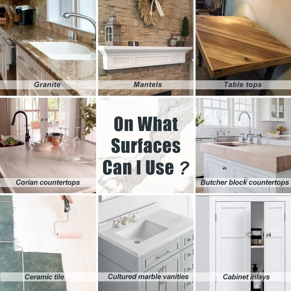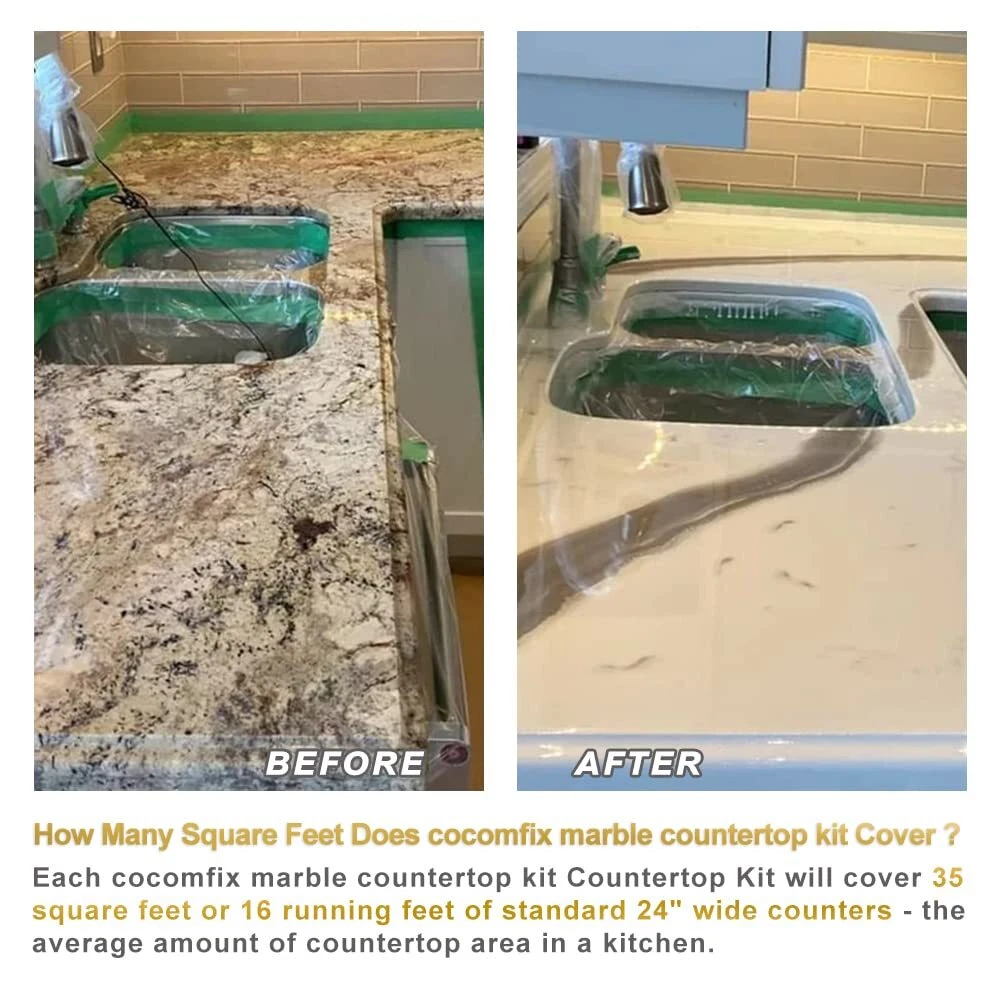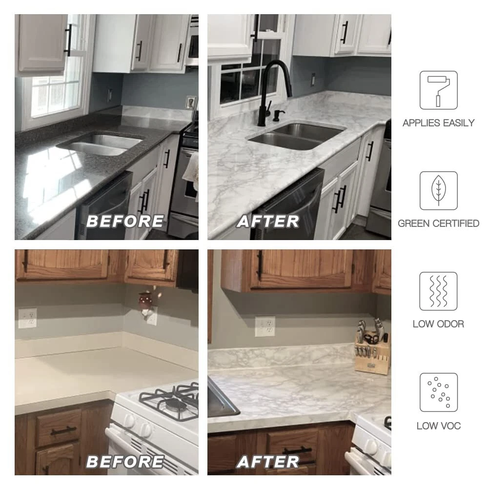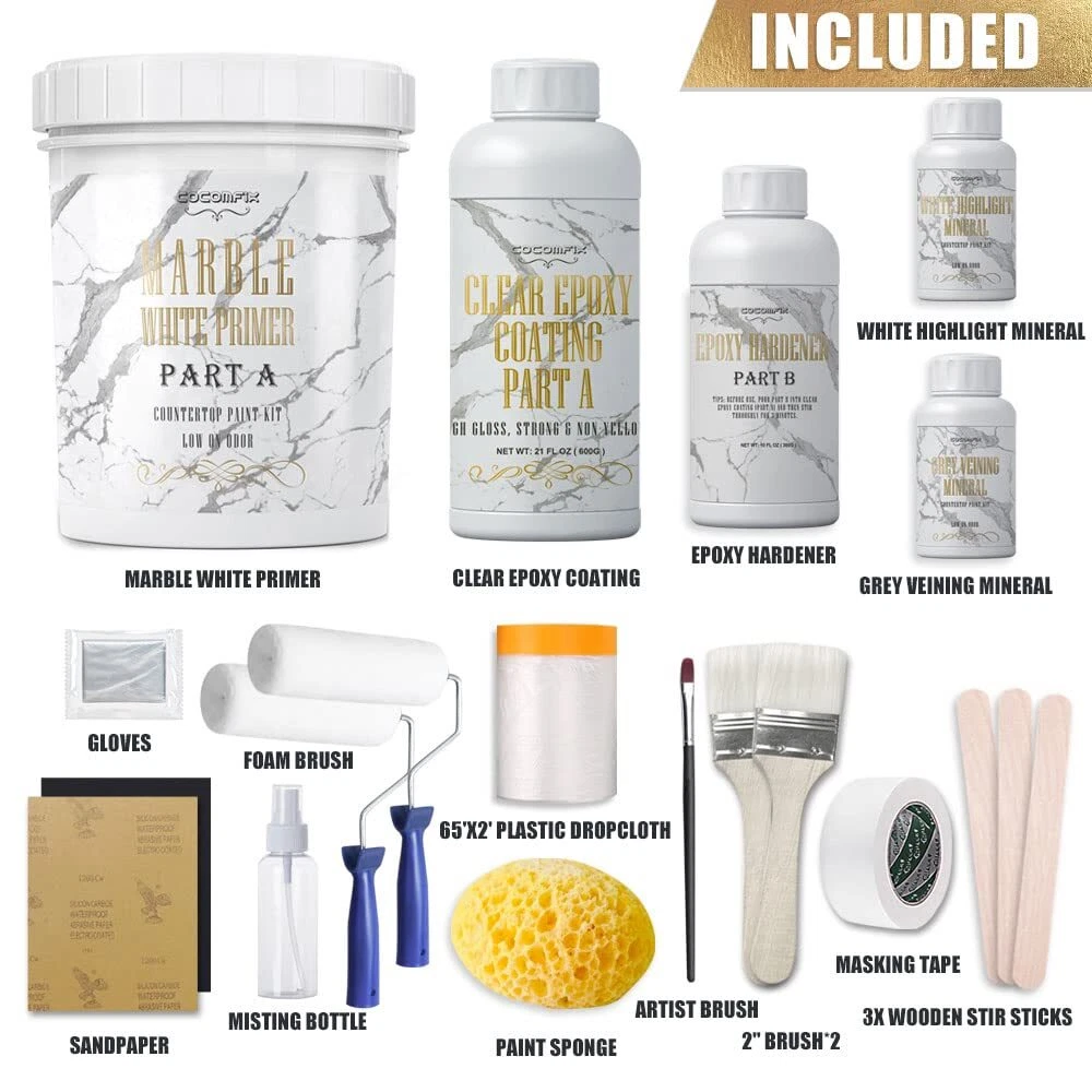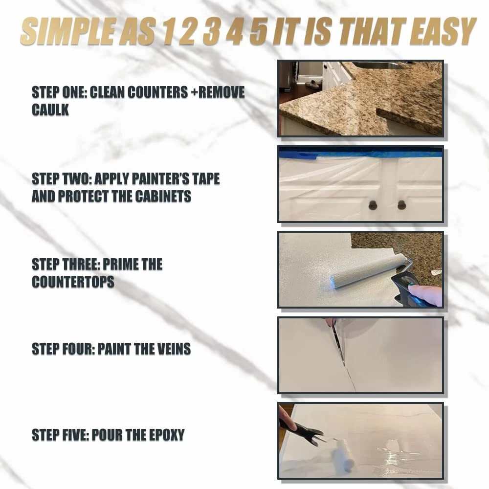 Epoxy countertop kit: Are you still troubled by discoloration, burns and stains in your kitchen countertop? Don't worry, with white marble countertop paint kit, you can effortlessly update the outdated countertops to the look of natural marble within just a couple of days Widely used: Perfect on cultured marble, traditional granite, formica, laminate, corian, ceramic tile, butcher block and other surfaces.(each set contains all necessary tools and covers 35 sq. Ft of surface, which is the average amount of countertop area in a kitchen Innovative technology: New 25x thick high-gloss epoxy topcoat. Its thick, full-seal coating restores countertop surfaces to a porcelain-like, hard, “like new” bright gloss. Long-lasting, super-adhesion, water-resistant, never peels and no yellowing Easy diy project: Simple 3 steps application - roll on white primer, draw grey veins, and then apply 25x thick high-gloss epoxy topcoat. Easy upgrade your countertop. Great adhesion and high gloss, refreshing your kitchen countertops Economic benefits: The marble countertop paint kit is aim to slash costs, allows you to bring projects to life without , the specialized primer hides existing discoloration, burns, stains, and minor scratches, the mineral colors create the characteristics of marbled quartz, easy remake your kitchen into the space you’ve always dreamed of Full Trust without Concern: If our product below your expectations, we will provide an intact substitute or indemnify the original value of your order, so please get in touch with us when in need