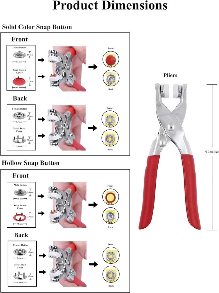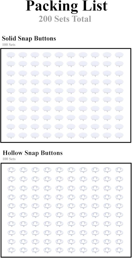 Metal Snap Button Kit - Snap on Buttons & Snap Fastener Tool - White Metal Snaps Buttons Snap Closures Sewing Snaps for Clothing Leather Crafting Small snaps for sewing made from alloy; Button snap kit with snap pliers; Rust-resistant button snaps for clothing; Nickel & lead-free snap button for sewing; No sew buttons clip snaps; Machine washable & dryable clothing fastener; Colorfast snap rivets Snap on buttons for fabric, cotton, rayon, flannel, fleece, or denim; Brass snap buttons for clothes; Kids & adult clothing snaps kit for baby onesies & bibs, costumes, t-shirts, hats, bodysuits, jeans, jackets, skirts, western shirts, coat pocket closures, and raincoats Buttons snap for sewing; Click button closure & snap tool kit for crochet & knitting; Decorative snaps for pouches, bags, duvet covers, backpacks, curtain layers, and wallets; Leather snaps for thin leather; No sew snaps for vinyl & plastic Snap button fasteners for crafts, scrapbooking, and jewelry making; Snap and snap setter for harness, pet clothes, sheaths, lanyards and bracelets; Easy to use snap fastener tool & snap fasteners kit requires no hammering and anchor holes for installation Bulk stud fabric snaps and fasteners kit; 100 white snap grommets sets; Total 200 white button snap sets; mm or ” DIY craft snaps; 6 inches snap fastener pliers Are your plastic snap buttons constantly popping off? Do you have trouble installing metal fasteners? This snap fastener kit is the answer. Unlike plastic snap fasteners, the heavy duty snaps have sharp prongs for secure gripping and sturdy fastening. The handheld metal snap tool pliers with a non-slip design aid in quick installation. The snap repair kit does not require a snap machine, hammering, or punching a hole. The installation is as easy as punching the sewing snap fastener through the cloth and slowly pressing the snap punch pliers. After practicing on a piece of unwanted cloth first, you will be able to install a press on snap in a heartbeat! The storage box keeps the assorted metal button snaps organized for easy picking. With plenty of quantity included, the boutique metal snap kit will last for several projects. Easier to apply than sewing on snaps, the metal snap on snaps are a must-have for repairing damaged or crimped snap closures. The clothing snaps work best when applied to a single or double layer of fabric. The cute metal snaps for sewing are not only functional but also decorative for pants, rompers, jumpers, coats, detachable badges, shoes, handbags, and belts. These fancy tiny snaps add a touch of fashion to otherwise plain decor and can be attached to upholstery and soft furnishings around the home to items like curtains, cushions, and chair covers. The uses of the colored button snap kit are so versatile they can even be used for card making.
