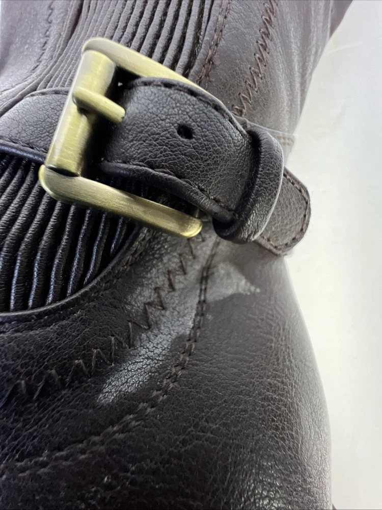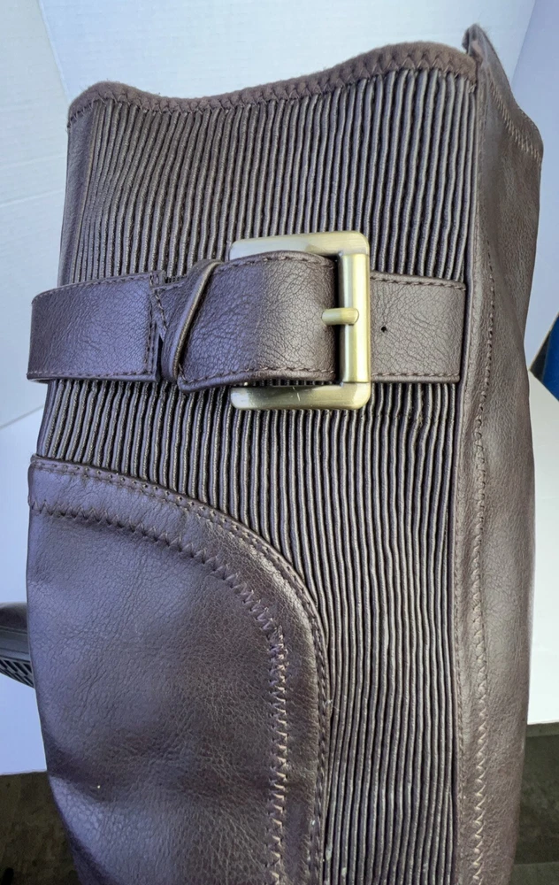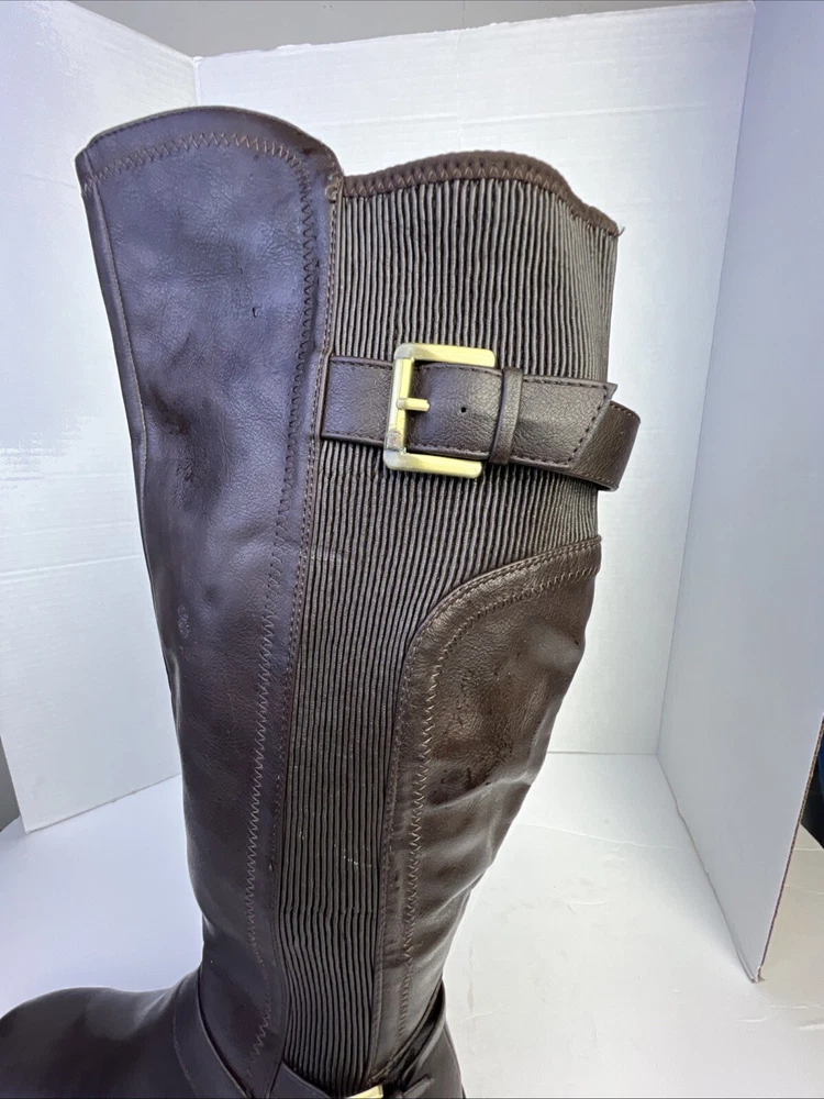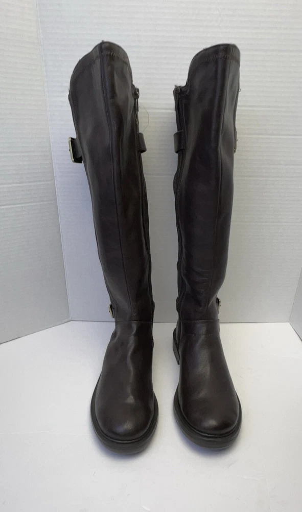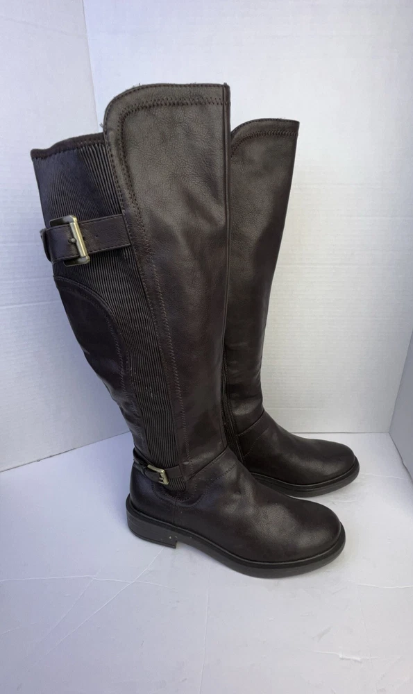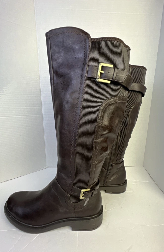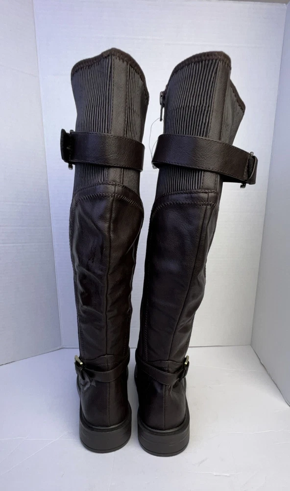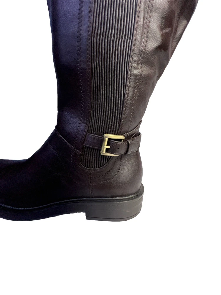 The White Mountain Desirable Women's Knee-High Boots in Brown are a stylish and versatile choice for various occasions such as travel, casual outings, workwear, or business settings. These boots feature a round toe shape, wide calf width, and a medium heel height for comfort. Made of faux leather with a zipper closure, they have a block heel style and a solid pattern. Ideal for the winter, fall, and spring seasons, these boots are designed with a biker, equestrian, and bohemian theme in mind. Perfect for women who wear a US shoe size 7.5 and UK shoe size 6.5.