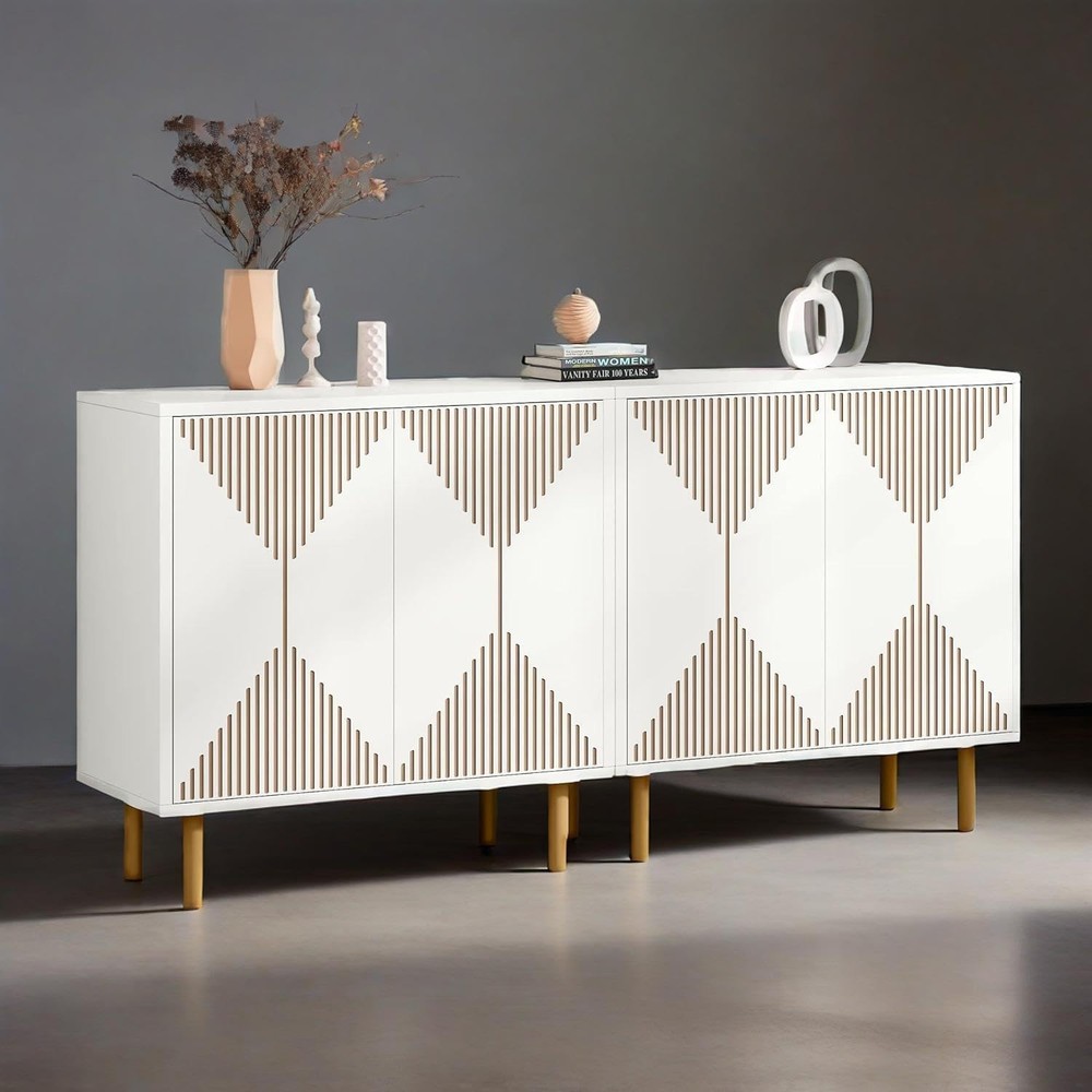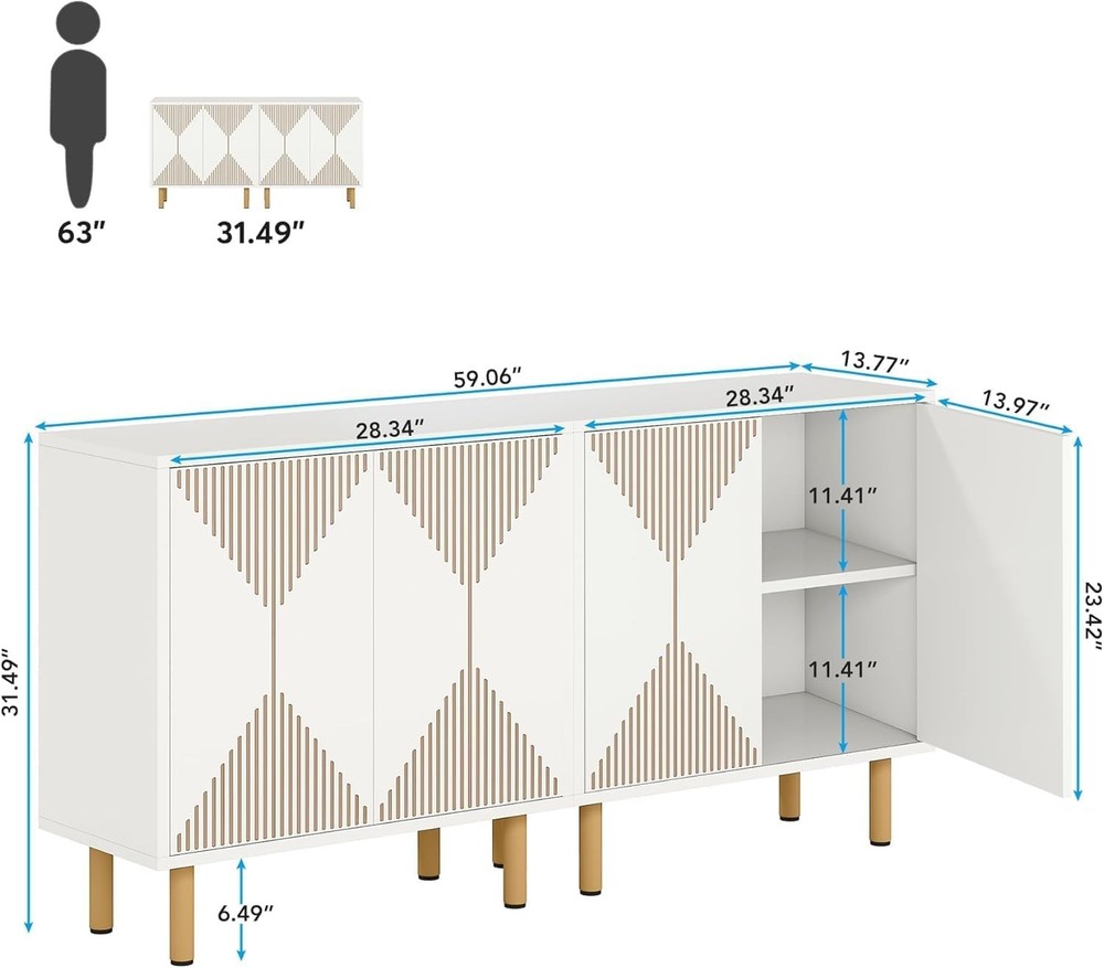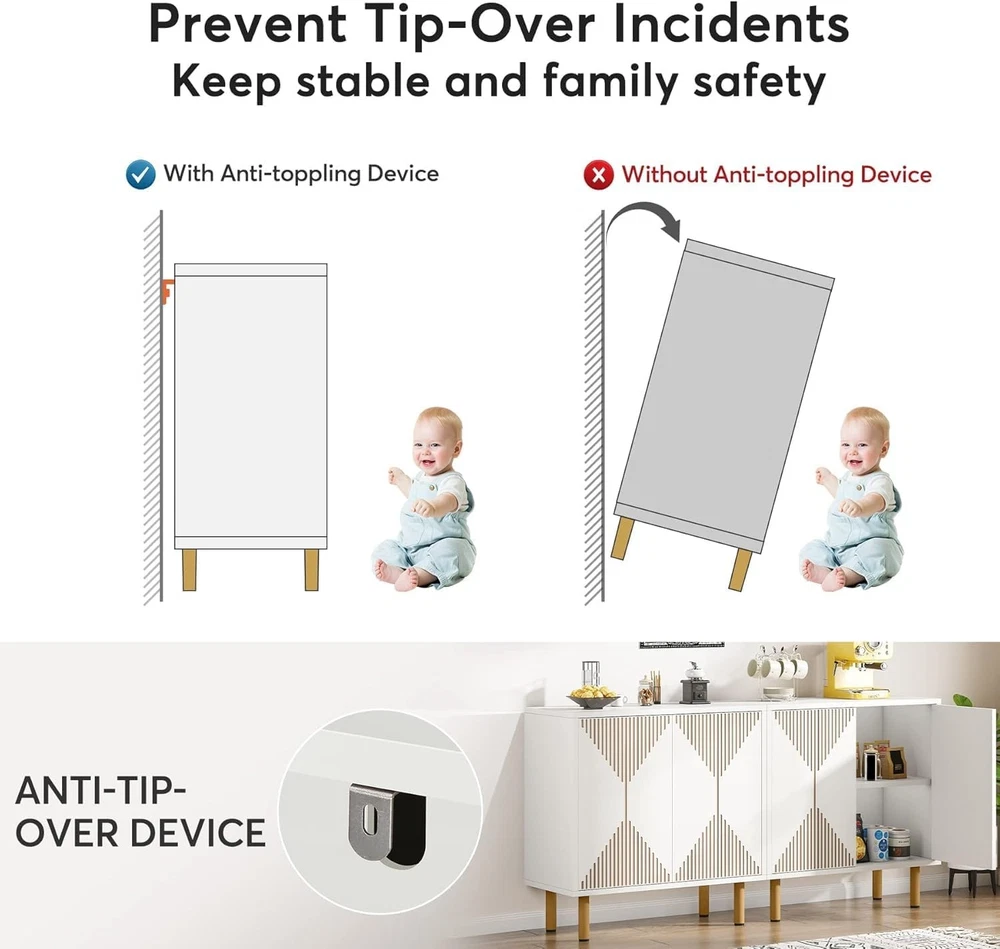 Product Description About this item Ample Storage Space & High Quality: This storage cabinet boasts ample storage space with 4 shelves and 4 doors. Each shelf measures D13.77 * W28.34 * H11.41 inches and can bear up to 40lbs. You can keep all your belongings organized and your room tidy and clean. The spacious tabletop also offers enough room to display your favorite items, such as flowers and photos. Freestanding and Multi-functional: This sideboard cabinet is freestanding and fits perfectly in any room of your home that needs organizing and storage, such as the living room, dining room, or garage. The versatile design allows you to use it separately, and the interior shelves provide ample space for storing all kinds of items without limitation. You can use it as a sideboard, buffet cabinet, storage cabinet, dresser, and more. Stable with Anti-Tip-Over Device: The buffet cabinet is mainly constructed of E1 level manufactured wood, except for the legs which are made of thick metal. This combination ensures the sideboard is sturdy and stable. Additionally, the thick metal legs provide solid support, and an anti-tip-over device enhances stability and safety, especially for children. Classic Modern Appearance: The floor storage cabinet features a beautiful and elegant appearance. The surface of the doors is carved for decoration, making the white sideboard stand out from others. The gold in the metal legs adds a touch of color to the sideboard, complementing the white body. Simple Design & Easy Assembly: The large accent storage cabinet has a simple design and is easy to assemble. We provide detailed instructions and label each part for your convenience. If you encounter any issues during the assembly process, we are always here to support you and help you solve any problems. Features: Ample Storage Space & High Quality: This storage cabinet boasts ample storage space with 4 shelves and 4 doors. Each shelf measures D13.77 * W28.34 * H11.41 inches and can bear up to 40lbs. You can keep all your belongings organized and your room tidy and clean. The spacious tabletop also offers enough room to display your favorite items, such as flowers and photos. Freestanding and Multi-functional: This sideboard cabinet is freestanding and fits perfectly in any room of your home that needs organizing and storage, such as the living room, dining room, or garage. The versatile design allows you to use it separately, and the interior shelves provide ample space for storing all kinds of items without limitation. You can use it as a sideboard, buffet cabinet, storage cabinet, dresser, and more. Stable with Anti-Tip-Over Device: The buffet cabinet is mainly constructed of E1 level manufactured wood, except for the legs which are made of thick metal. This combination ensures the sideboard is sturdy and stable. Additionally, the thick metal legs provide solid support, and an anti-tip-over device enhances stability and safety, especially for children. Classic Modern Appearance: The floor storage cabinet features a beautiful and elegant appearance. The surface of the doors is carved for decoration, making the white sideboard stand out from others. The gold in the metal legs adds a touch of color to the sideboard, complementing the white body. Simple Design & Easy Assembly: The large accent storage cabinet has a simple design and is easy to assemble. We provide detailed instructions and label each part for your convenience. If you encounter any issues during the assembly process, we are always here to support you and help you solve any problems. Package Includes: 1 x Kitchen Cupboard 1 x Manual On Aug 15, 2025 at 02:39:26 PDT, seller added the following information: