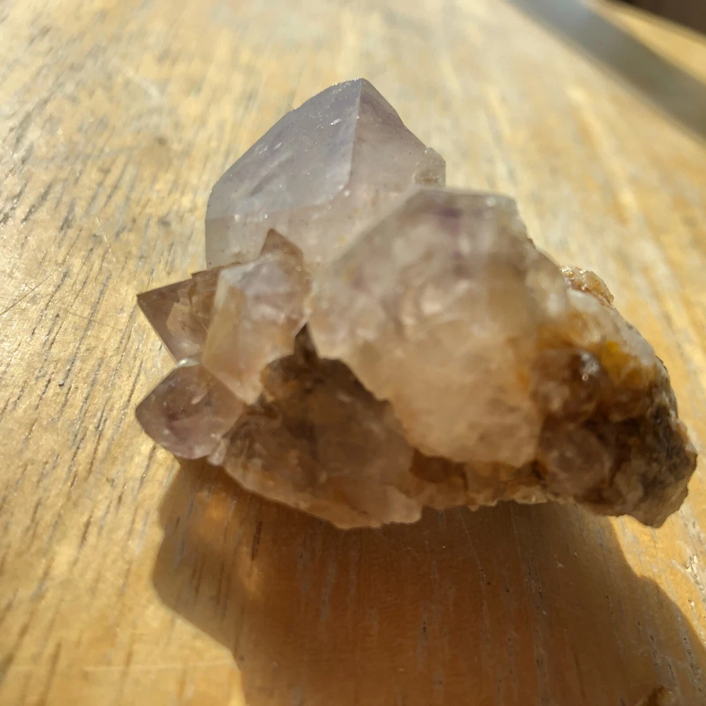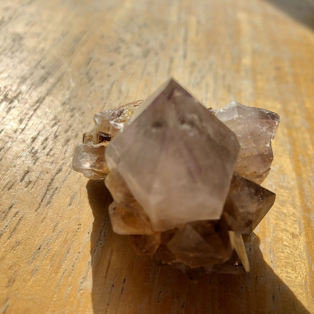 Cactus Quartz or Spirit Quartz Size Approximately y cm x y cm x y cm y g View My Other Items For Sale Visit My eBay Store Add me to your Favorite Sellers A cactus or spirit quartz is a quartz crystal that is encrusted by a second generation of smaller crystals grown on its prism faces. These crystals were first discovered in 1986 in the Magaliesberg Mountain Range near Pretoria, South Africa. It occurs as quartz, citrine and amethyst, and comes in a wide range of colors, including purple amethyst, violet amethyst, smoky, milky clear and golden citrine. FAQ/Tips Crystals are priced by quality, color and size. Purple amethyst is more highly prized and will cost more for a smaller lesser quality crystal. Lavender is the most common color and where you will find the best quality/value for price Crystals change colors with changes in type angle and intensity of light. Color may also vary between monitors. Pictures were taken in bright natural light. We do our best to give you many views so you can judge the quality of the given crystals. If you have questions please ask before bidding or buying. Many of the crystals have special color properties: Many have phantoms, not just the ones we?ve indicated. Some have ?floating? purple tips. The placement of darker purple against purple or white crystals appears to change as the crystal is turned. Many are a mixture of citrine and amethyst. The ones called ?Golden Healers? or ?Sunshine? have a rainbow effect on crystal faces. We value your feedback please contact us with problems. Items are returnable. Track Page Views With Auctiva's FREE Counter