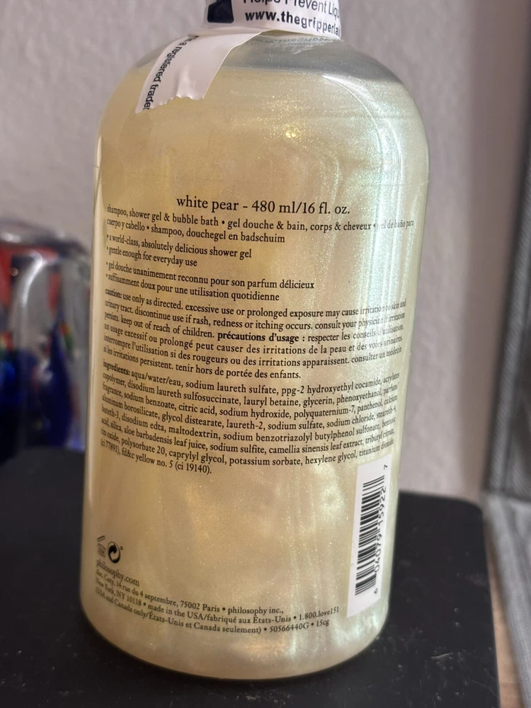 Scent: White Pear Volume: 480 ml Product Line: Philosophy Features: Animal Cruelty-Free Body Area: Body, Face, Hair gtin13: 604079159227 Formulation: Gel UPC: 604079159227 Type: 3-in-1 Color: White Brand: Philosophy Department: Unisex MPN: N/A Country/Region of Manufacture: United States Size: 16 fl oz Ingredients: Aloe Vera, Camellia Extract, Glycerin Skin Type: Normal Skin