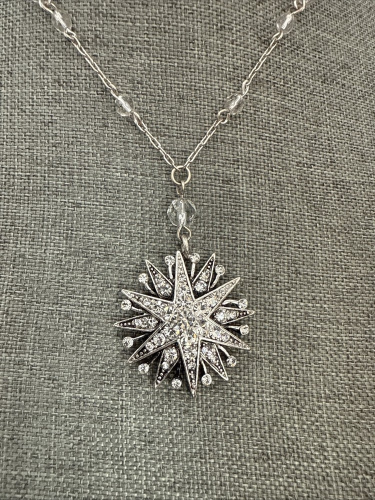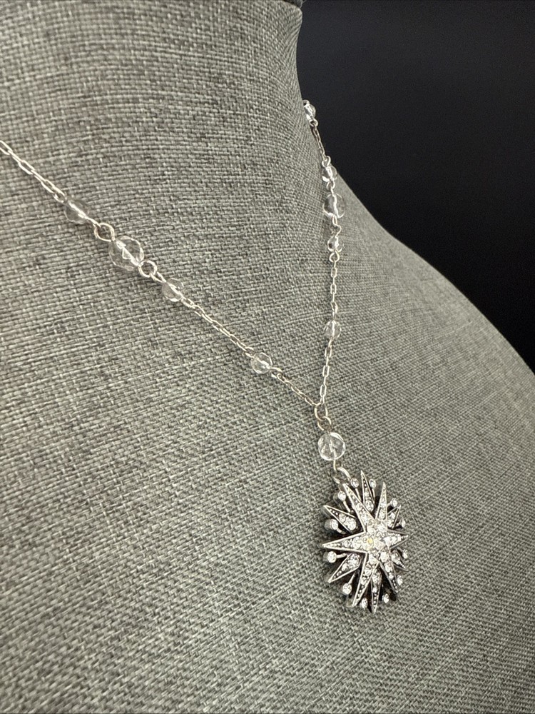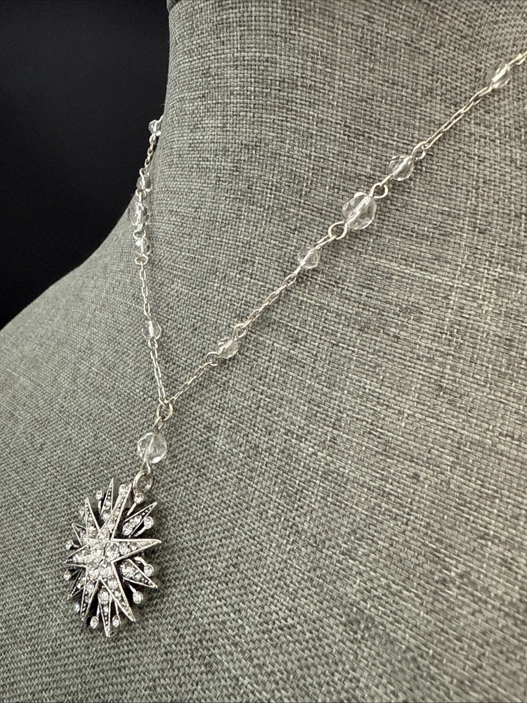NECKLACE Choker White Clear Beaded Silver Tone Chain with Double Star Pendant with Rhinestones 15.5” See Photos (5682)