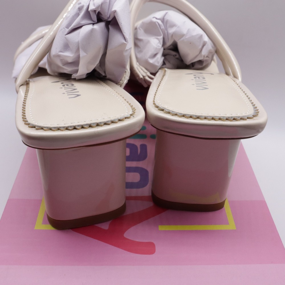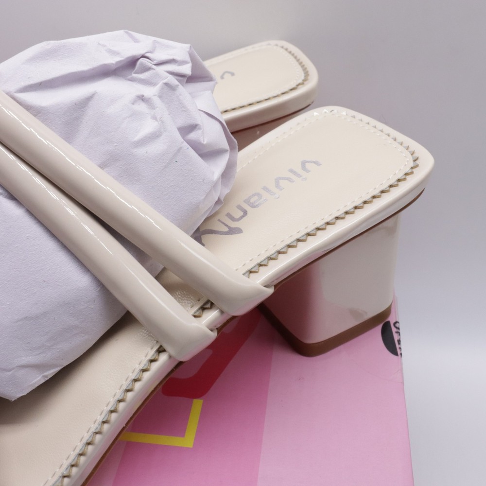 These ivory white square toe strappy chunky heel sandals are designed for women in size 7. They feature a slip-on style with a mid-height block heel for comfortable wear. The sandals are made of faux leather with a strappy design, perfect for adding a stylish touch to any outfit.
