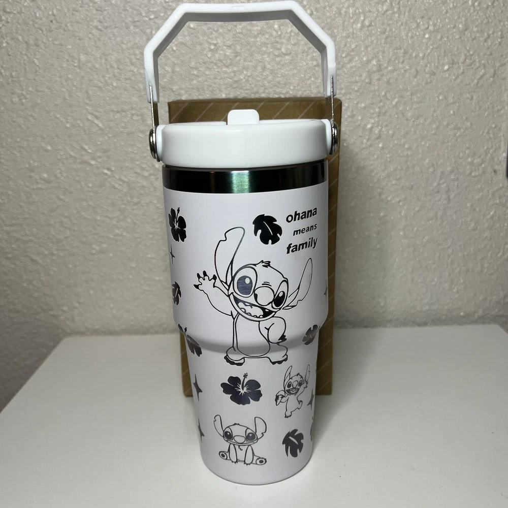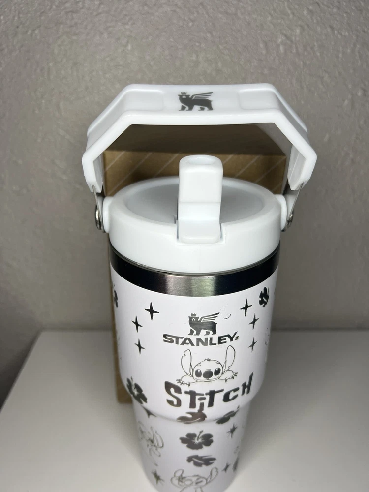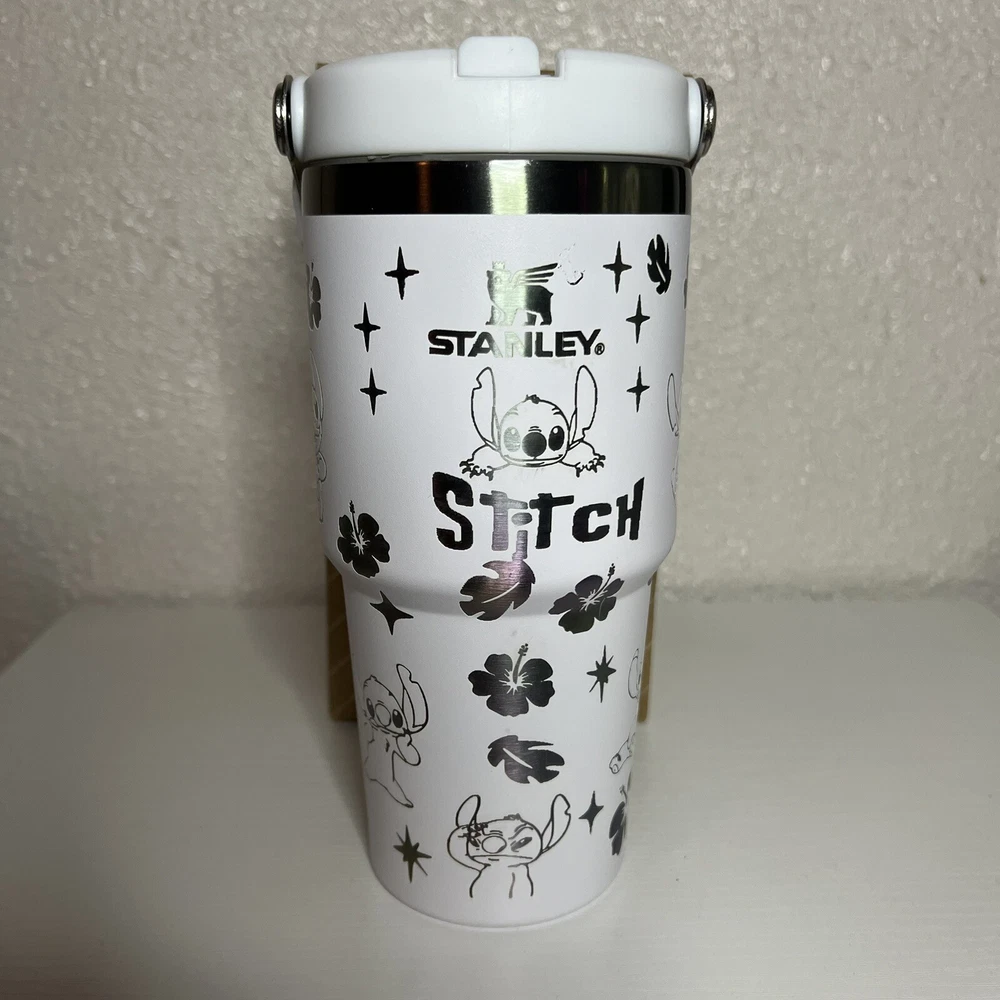 Brand new 20oz white stitch engraved Stanley tumbler Enjoy your favorite hot or cold beverage in style with this 20oz White Stitch Engraved Stanley Tumbler. Featuring the beloved cartoon characters Lilo & Stitch, this stainless steel tumbler is perfect for fans of the movie. With a lid and flip straw, this tumbler is both convenient and stylish.