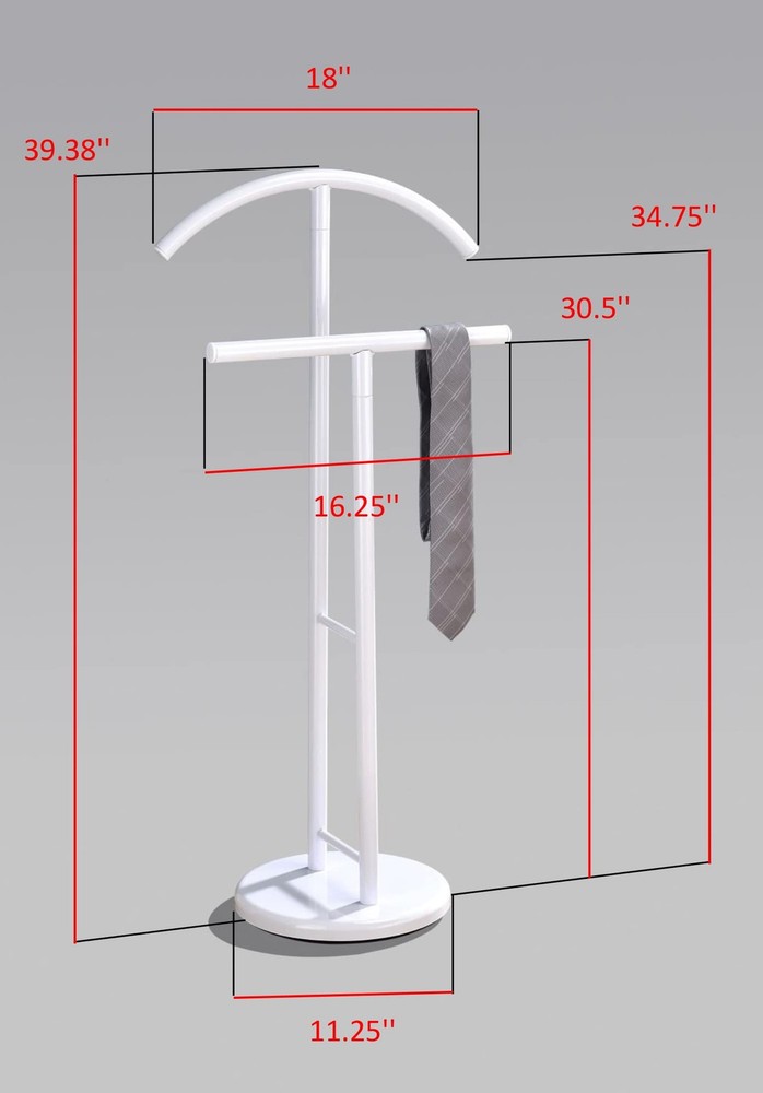 - Meadut Metal Suit Wardrobe Valet Stand, White Product Description Keep suit jackets, coats, hats and ties in pristine condition with this convenient valet. Featuring a white metal construction, this rack features ample space for suit coat, slacks, hats and ties. Features Collection Name: Meadut Finish: White Material: Metal Number of Bars: 1 Assembly: Required Dimensions Item Size: 18"L x 11.25"W x 39.38"H Effortlessly keep your wardrobe organized with 's Meadut Metal Valet Stand - the perfect solution for storing your suits, coats, hats, and ties! Say goodbye to wrinkled suits and disheveled ties - our valet stand keeps your clothes in pristine condition, ready to wear at a moment's notice. Crafted from durable white metal, our valet stand features ample space for your suit coat, slacks, hats, and ties - making it the ultimate storage solution for any fashion-conscious individual. With a sleek white finish and sturdy metal construction, our valet stand is both stylish and functional - perfect for any modern home or office. Measuring 18"L x 11.25"W x 39.38"H, our valet stand is the perfect size for any space - whether you're looking to store your clothes in your bedroom, closet, or office.