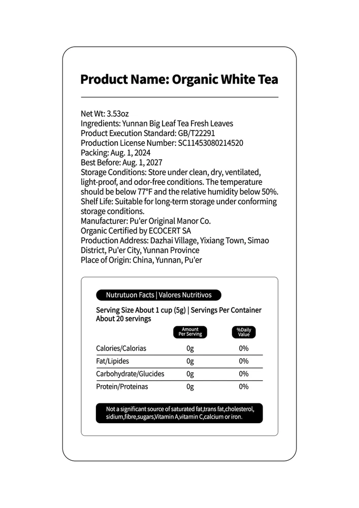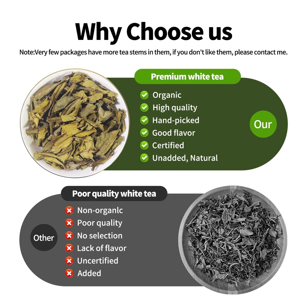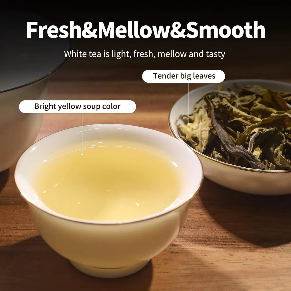 🍵Natural Organic White Tea - Experience the white tea growing at high elevation. Our loose white tea is made from its meticulously handpicked finest white tea leaves youngest, freshest early spring tea leaves, making it a delight that any tea lover will enjoy.【If you receive a white tea bag with more stems inside and don't like it, please talk to us】 🍵Loose Leaf White Tea - Freshly brewed white tea loose leaf has a refreshing aroma, unique light floral taste, and mellow & and delicate flavor. Savor the harmony of sweet, clean taste and the fresh, scent of organic white tea, it can make you feel relaxed and cheered up. 🍵White Tea Health Benefits - Loose leaf white tea is loaded with antioxidants and is believed to be a rejuvenating beverage, delicious, and may be served hot or iced. Our organic tea can help to neutralize the effects of harmful free radicals and support your overall wellness. 🍵Hot & Iced Tea Brew- Embrace white tea leaves through the two quintessential methods: Hot brewing and cold brewing. The hot brewing method preserves the tea leaves health benefits, offering a revitalizing boost for the day. Iced tea unveils a refreshment. Both approaches allow you to savor its roasted aroma, showcasing the unique essence of white tea. 🍵Traditional Craftsmanship - Chinese white tea is made by sun exposure and drying, this technique adeptly accentuates the unlocks its inherent captivating aroma, retaining more of the nutrients that, result in a robust and flavorful taste, all contributing to the creation of the finest white tea.