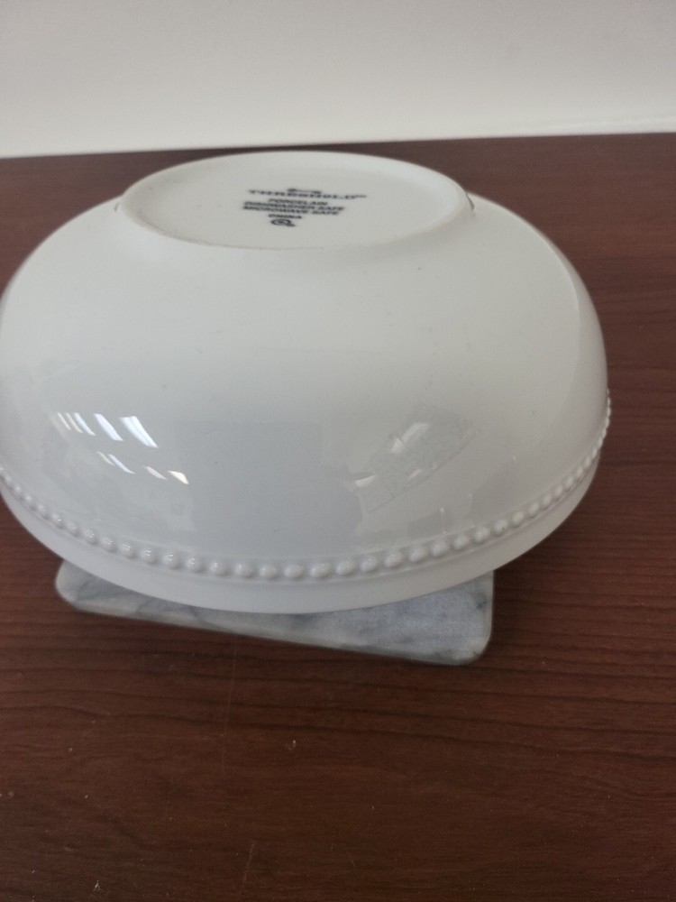 This is a White Beaded Cereal Bowl from the brand Threshold. It is made of porcelain with a glossy finish and features a decorative design. The bowl is round in shape, measures 2.75 inches in height and 8.25 inches in width, and has a capacity of 40 oz. It is microwave and dishwasher safe, suitable for all occasions, and is an original piece of art pottery from the 21st Century.