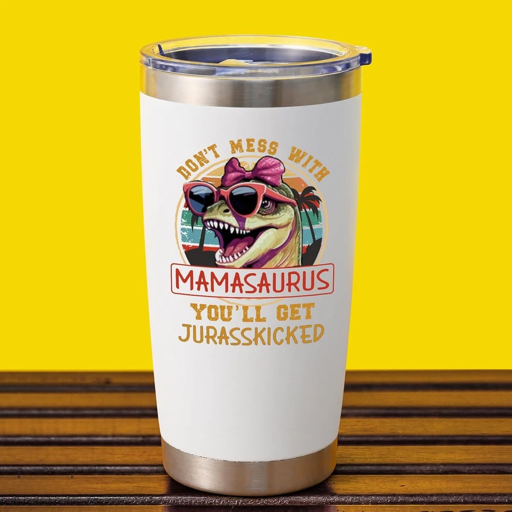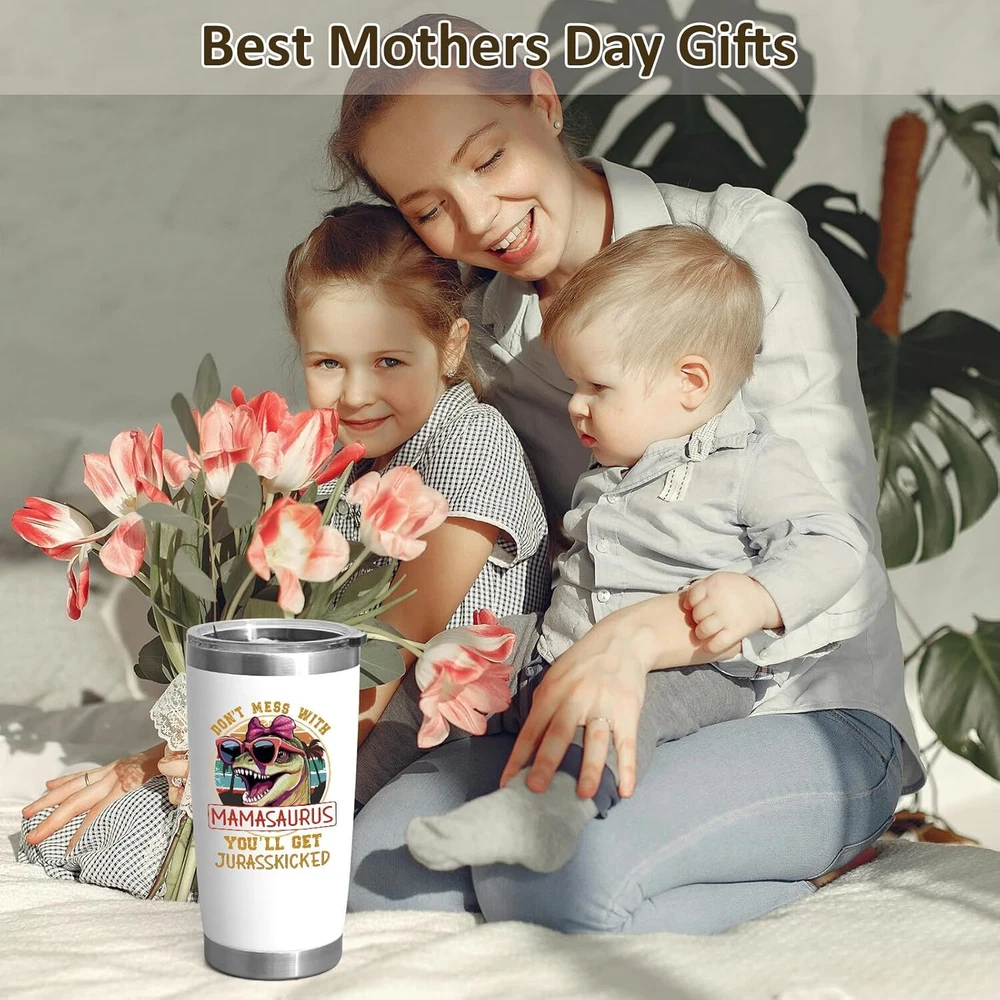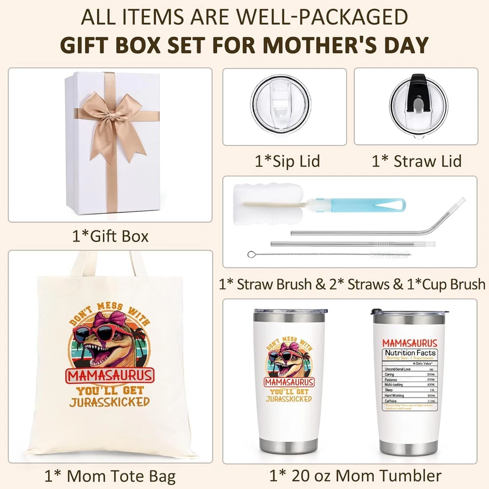 Mom Christmas Gifts, Best Mamasaurus Tumbler Gift, Funny Christmas Gifts for Mom Wife from Daughter Son, Unique Popular Christmas Presents Gifts Ideas for Wife Women(20Oz, White) - Mother's Day, New Year, Christmas, Holiday, Birthday, Valentine's Day 【Best Happy Mother's Day Gift Set】: Show love with our " Mamasaurus" gift set. This Containing ① 1* exquisite gift box ② 1* Mamasaurus tumbler ③ 1* big capacity tote bag ④2* lids & 2* straws ⑤1* straw brush &1* tumbler brush. Skillfully packaged, a whimsical yet loving gift for your spectacular mom. 【Unique Gifts Ideas for Mom】: Our wearing "PINK SUNGLASSES" Mamasaurus and nutrition facts label design celebrates a mom's love, care, and dedication! Perfect appreciation gifts for your mom, or your wife, sister, friends, daughter who are outstanding mothers! 【Chic & Sturdy Mother's Tote Bag】: Measuring 14 x 13.4 inches with an 8.8-inch handle for a comfortable grip, our durable tote is decorated with lively graphics and is a breeze to maintain. It's the quintessential companion for a mother's life. 【18/8 Stainless Steel & Superior Insulation】: This 20oz tumbler, crafted from durable 18/8 stainless steel, features double-wall vacuum insulation, keeping drinks hot for 6 hours or cold for 10 hours, perfect for any occasion or location.