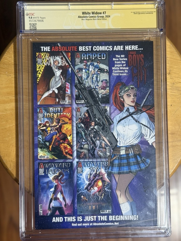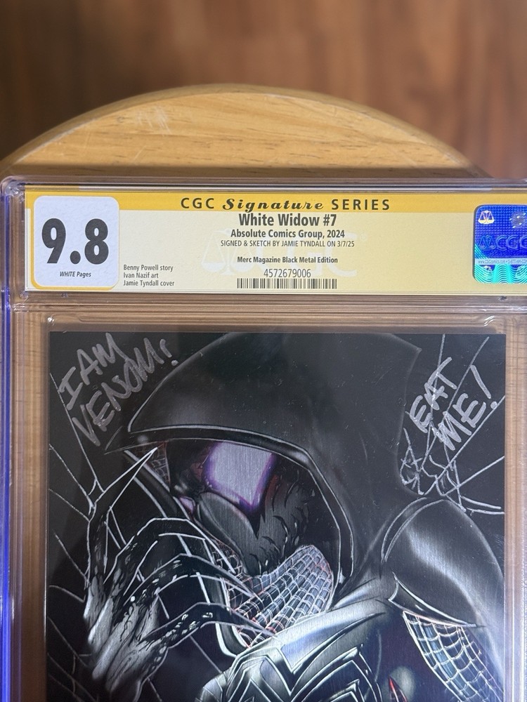 The product is a White Widow #7 black metal comic book signed and sketched by artist Jamie Tyndall.