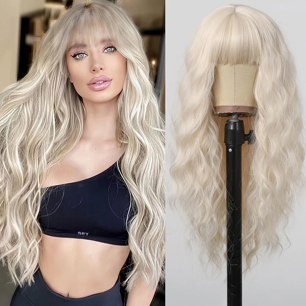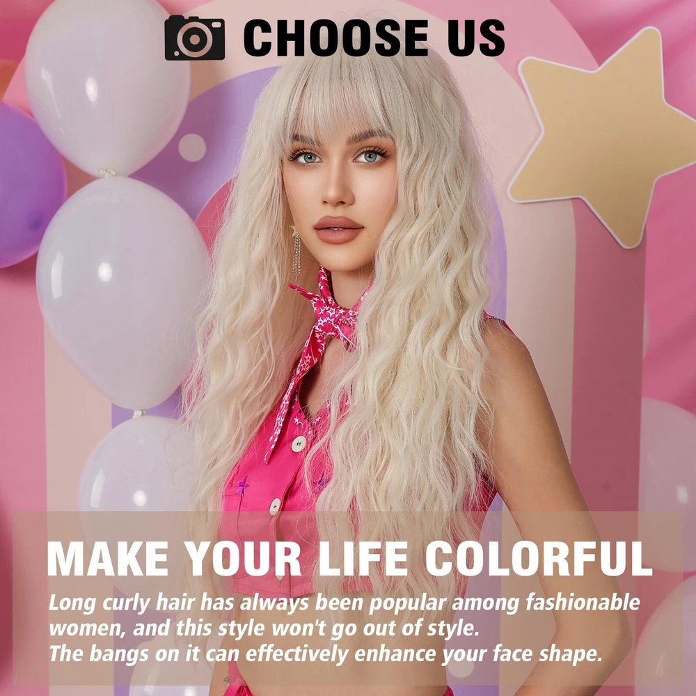 How To Wear the wigs? - Comb your own hair into a ponytail or updo - Put on the wig cap and make sure your own hair in it - Wear the wig on,the hooks are towards back.You could also adjust the hooks to the right size - Move the triangular cap tip on both sides to your temple - Comb the hair with your fingers to the style you like.You could also use spray and hair tools.The wig is suitable for many occasions MATERIAL: The long platinum blonde wavy wig is made of high-quality heat resistant synthetic fiber wig and stands heat up to 150°c(300°f). soft touching even better than your own hair, skin-friendly and soft hair made the white wig very comfortable.More durable,You can easily wear it all day.And Has a realistic look. Wig Type: This long white curly wig with bangs, length of 26 inches wigs for white women hair has a color that is popular among women's wig. Compared with other curly hair wig, the curl is more beautiful and fluffy. It has cute bangs that can better modify your face shape.Hair is softer and more like human hair. CAP & SIZE: Our white wig with a cap size of 21-23 inches. Soft straps adjust up to a 1-2 inch in either direction to achieve a more comfortable and secure fit.The wig cap is soft and breathable.It is very convenient to wear. You only need to spend 1-2 minutes before going out to wear a beautiful curly wig. Occasion: The long blonde wig with bangs is perfect for any occasion,daily,halloween,concerts,theme party, weddings, dating,christmas,working and so on.Bring you confidence in any occasion.Use your finger or wide-tooth brush to comb it when you first wear it will better. Warm Tips: The picture is taken by the camera, there is a slight color difference under different computer and mobile phone monitors.We do try our best to accurately represent colors on all of our products.And all synthetic wigs will slight shedding and tangling which is normal.We recommend that you spray some hair care solution before wearing it, which can reduce tangles.