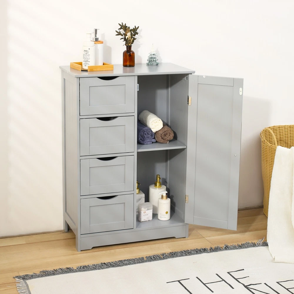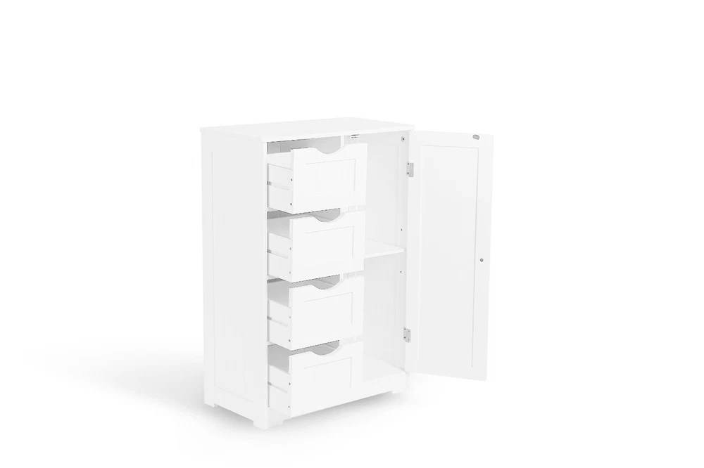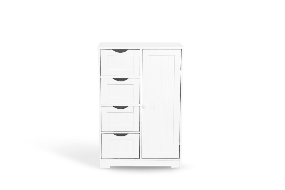 Features: The Bathroom 4 Drawer 1 Door Free Standing Unit has a modern and stylish design that will complement any bathroom decor. The elegant smooth white finish adds a touch of sophistication to the unit, making it a great addition to any home. The Bathroom 4 Drawer 1 Door Free Standing Unit features four drawers and 1 cupboard, providing plenty of storage space for your bathroom essentials. You can easily store your towels, toiletries, and other items in this unit, keeping your bathroom tidy and organized. This bathroom drawer unit is made from MDF, a sturdy and durable material that can withstand daily wear and tear. MDF is also resistant to warping and cracking, ensuring that this unit will last for many years. Cleaning this unit is effortless. You only need to wipe it with a dry cloth to remove any dust or dirt, making it easy to maintain its pristine appearance. This free-standing unit is not limited to the bathroom only. You can use it in other rooms of your home, such as the bedroom or laundry room, to store your items. Specifications: Color : White Recommended Uses For Product : Towels Product Dimensions: 22"L : x 12"W x 32.5"H In. Special Feature: Removable Shelf Material: Engineered Wood Style: Modern Number of Drawers: 4 Number of Cabinet : 1 Shape: Rectangular Package Contents: Bathroom Floor Cabinet