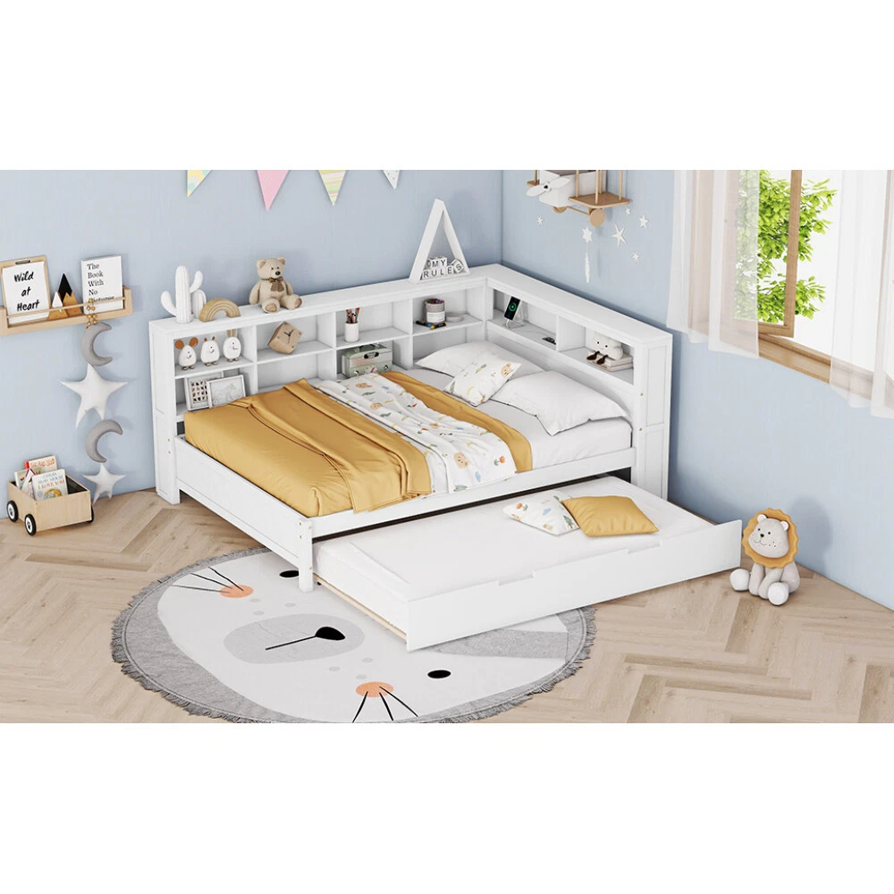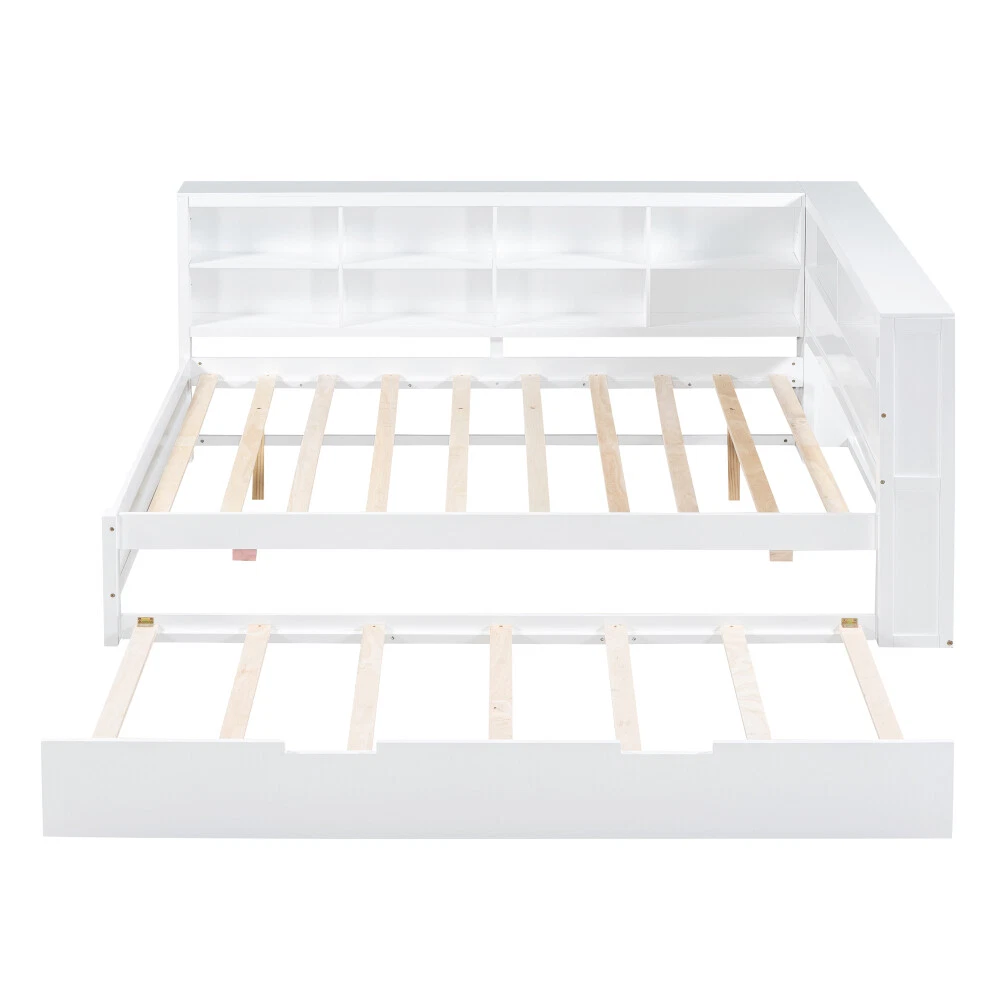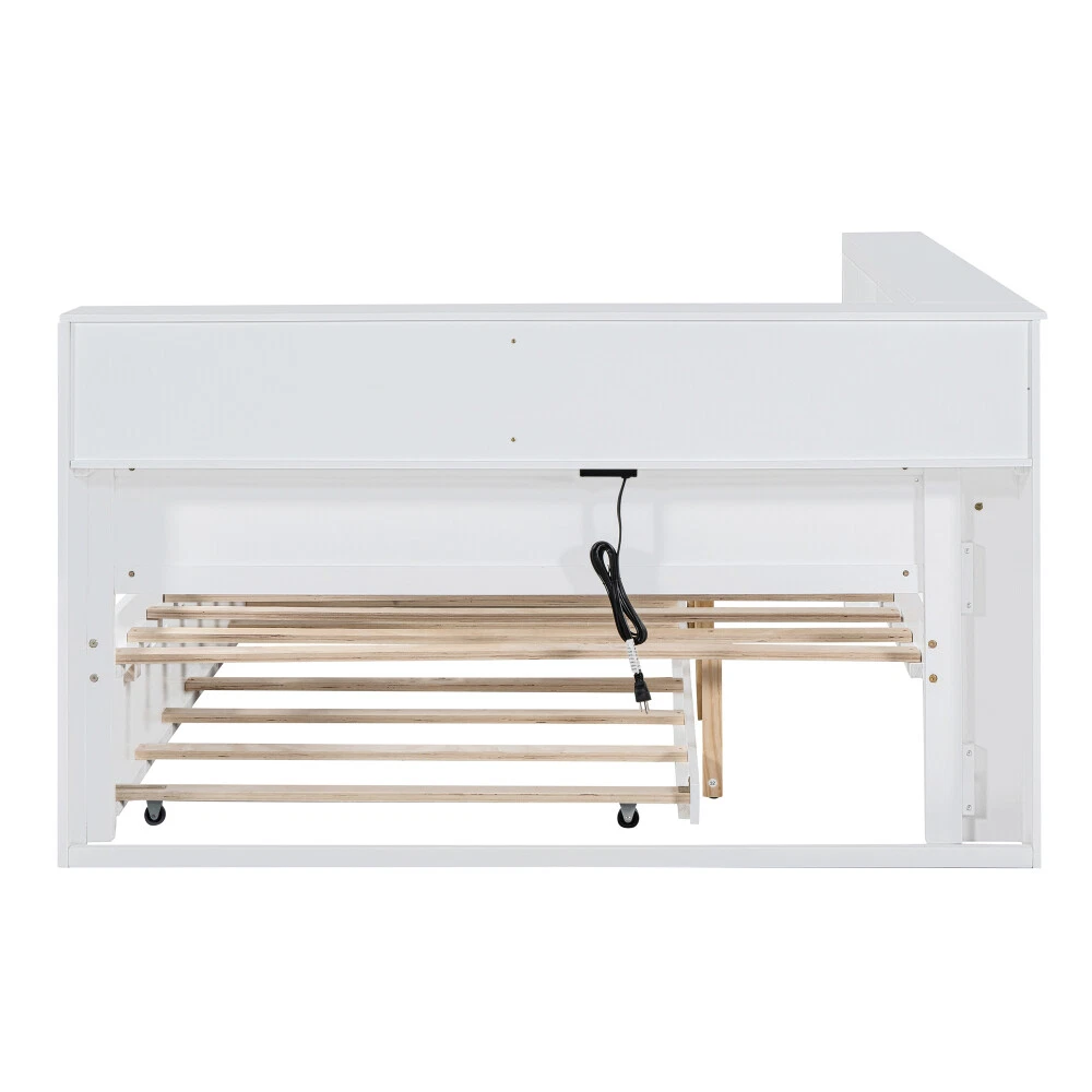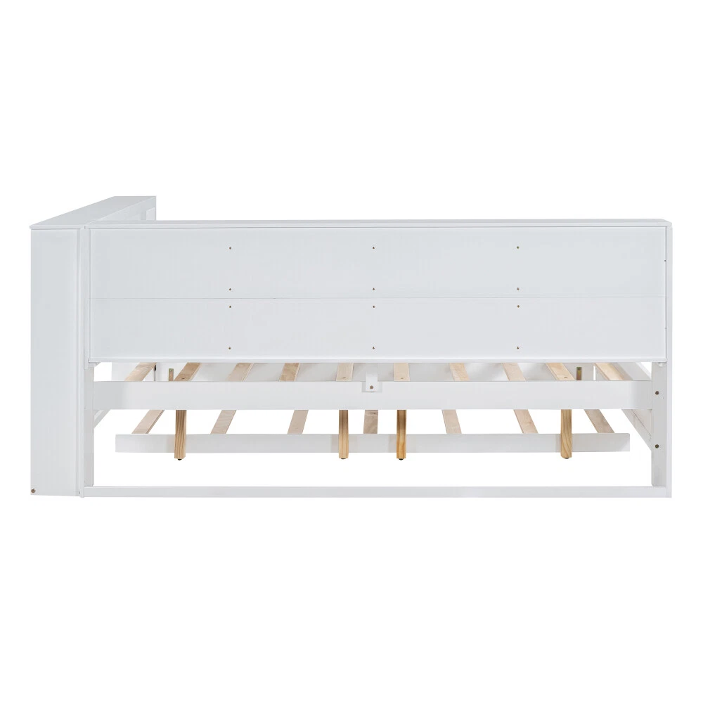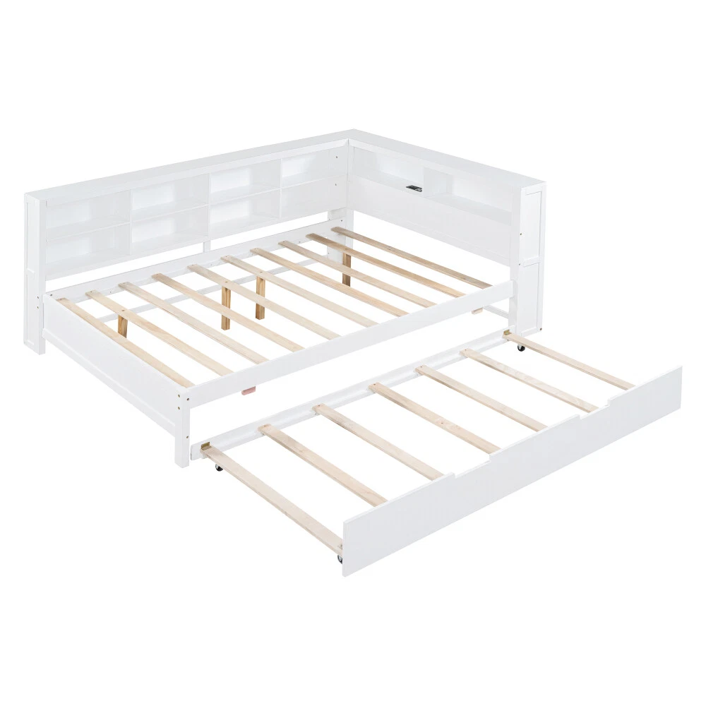 Elegant design: This daybed is designed with pine wood material, available in grey or white color. It is not only suitable for any home decoration, but also designed to last forever. Daybed Frame with Charging Station: This unique full size daybed frame is designed with a USB port charging station to allow you to charge or use electronic devices while you sleep, providing even more convenience and comfort. Space-saving:The daybed includes one trundle, which can be rolled out to provide extra sleeping space. This design is ideal for families with children or users who need to host guests frequently. There is a double-layer storage shelf next to the bed, where users can store bedding, toys and other items. Superior Quality: Made of high-quality MDF, the frame of this bed is not easy to be affected by humidity change and lead to crack. The strong legs, wide boards and 10 slats for bed,not only improve the weight capacity of the bed greatly but also ensure the stability. Product Dimension: Overall Product Dimension: 83.9"L X 63.3"W X 36.6"H. Bed suitable for full size mattresses. Wooden Full Size DayBed with Trundle, DayBed with Storage Shelf and USB Charging Ports, White This day bed is designed with pine wood material, available in grey or white color. It comes with a double-layer shelf for convenient storage and one pull-out bed for extra sleeping space. In addition, it is equipped with a USB charging station for electronic devices. This design is not only practical but also stylish, making it an ideal choice for any modern bedroom. The solid pine wood frame ensures durability and stability, while the sleek and minimalist design adds a touch of elegance to any room.
