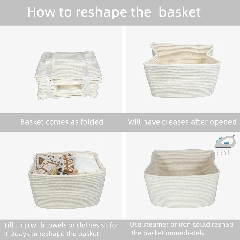 Cotton Rope storage Basket Bins Woven for 14.5“X9.5”X9.3“, White Product Details Material: Cotton Color: White Brand: XUANGUO Shape: Between Oval to rectangular Product Dimensions: 14.5"D x 9.5"W x 9.3"H Style: portable Room Type: Bedroom, Bathroom,nusrsery ,living room,dining room kitchen,kids, grils room boys room Recommended Uses For Product: Storage, Decoration Number of Pieces: 3 Finish Type: Unfinished With Lid: No Handle Material: Cotton Closure Type: Foldable,Rope Special Feature: soft and nontoxic rope basekts, washable rectangular Manufacturer: XUANGUO Part Number: LBG-0001 Item Weight: 3.94 pounds Country of Origin: China Item model number: LBG-0001 Size: 14.5“X9.5”X9.3“ Finish: Unfinished Pattern: Solid Item Package Quantity: 1 Special Features: soft and nontoxic rope basekts, washable rectangular Usage: Cube organizer for Cube shelf, closet storage basket,on the shelf,as nursery organizer,Kid’s toy storage. Normally use at home,such as living room,nursery room,playroom,bedroom. Included Components: 3 basket Batteries Included?: No Batteries Required?: No Material: Cotton Color: White Brand: XUANGUO Shape: Between Oval to rectangular Product Dimensions: 14.5"D x 9.5"W x 9.3"H Cotton rope 1, Medium to Large rectangle woven basket for storage: Our rope basket with handles size is 14.5”X9.5”X9.3”. Designed as home storage basket for organizing. Could use as toy basket, pet basket, book basket, towel basket, clothes basket, nursery basket, wicker basket for storage and more. Perfect as storage basket for shelves or closet storage bins to store household items. 2, Nature, safe and durable decorative basket for storage: We use heavier and non-toxic coiled cotton rope to make sure the quality of this cute rope basket. Those rope baskets is safe for people and Pet. No odor smell. As its soft, its foldable and easy to store as well. 3, Designed to complement your room and decor : We special chose classic solid color for those rope basket bins. Our rope basket with the solid colors could use as cloth basket and looks good in any room. Those rope shelf basket looks good in your shelves, closet or next to your bed and is an essential item for your daily storage. This cube rope storage basket enhances any room or décor at your home. 4, Between ovel to rectangle storage basket with handles: This cute square rope basket designed with seamless look handles. With the handles, the rope basket is easy move around. As the cloth storage basket made of soft cotton rope, the basket have no sharp edge, will not scratch your furniture. 5, Note:Products comes as folded, will have crease. Fully fill the basket with towels or clothes waiting for 1-2 days could reshape the basket. Steaming or Ironing could reshape the basket as well.