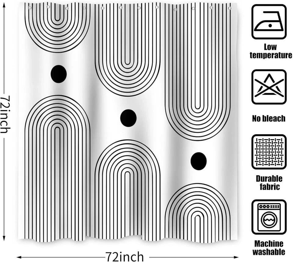 PREMIUM MATERIAL: The black and white modern shower curtain adopts premium fabric, easy to clean, machine-washable, waterproof, durable, no peculiar smell, good wrinkle resistance, smooth PRIVACY PROTECTION: The black and white modern shower curtain is thick enough to protect your privacy. The bathtub shower curtain allows you to enjoy the shower without outside distractions, make you relax body and soul WATERPROOF: Black and white modern shower curtain with excellent waterproof performance, it is beneficial to the separation of wet and dry. It also means the curtain is quick-drying, so you barely spend much time on caring GREAT DECOR: We use HD printing technology, the pattern is clear, printed with a unique pattern, this black and white modern shower curtain gives an eye-catching look in your bathroom. Whether it is at home, RV, apartment, or hotel, suitable for any bathing place EASY USE & CARE: Our black and white modern shower curtain with rust-resistant metal grommets on the top, with 12 plastic hooks, use the C-hooks to quickly hang the shower curtain on the pole. You can machine or hand wash to keep it clean