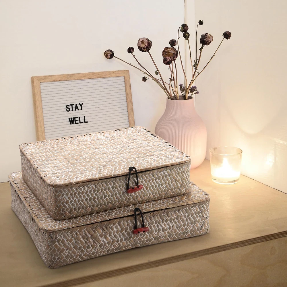 100% seagrass, include set of 2 pieces(S+L), Size: L: 12.6"x11"x2.4"H; Size S: 27*23*6, 10.6"x8"x2.3"H The organizer baskets can hold chargers, data cable, makeups, socks, underware to place on coffee table, shelf, kitchen, bathroom vanity, TV bench, wardrobe and dresser; The flat shape make it very flexible to be inserted to different places of your home. Neatly hand-woven natural seagrass baskets with lid, help you keep important things in one place and make your home clean and organized; The lid help to hide all clutter inside, make your home tidy and neat The warm brown color add a natural elegance and warmth feel to your home Premuim Material: 100% seagrass, adding a natural and genuine expression to any space. Include set of 2 pieces(S+L), Size: L: 12.6"x11"x2.4"H; Size S: 27*23*6, 10.6"x8"x2.3"H. All-Occasion Storage: The wicker baskets with lids can hold chargers, data cable, makeups, socks, underware to place on coffee table, shelf, kitchen, bathroom vanity, TV bench, wardrobe and dresser. Home Decor: Woven Storage Baskets are a great way to add storage or decorate your home or other living spaces. The flat shape make it very flexible to be inserted to different places of your home. Practical Use: Neatly hand-woven natural storage with lid, help you keep important things in one place and make your home clean and organized. Elegant Style: Natural seagrass baskets not only have the storage function, but also integrates the natural charm into the home life, The warm brown color add a natural elegance and warmth feel to your home.