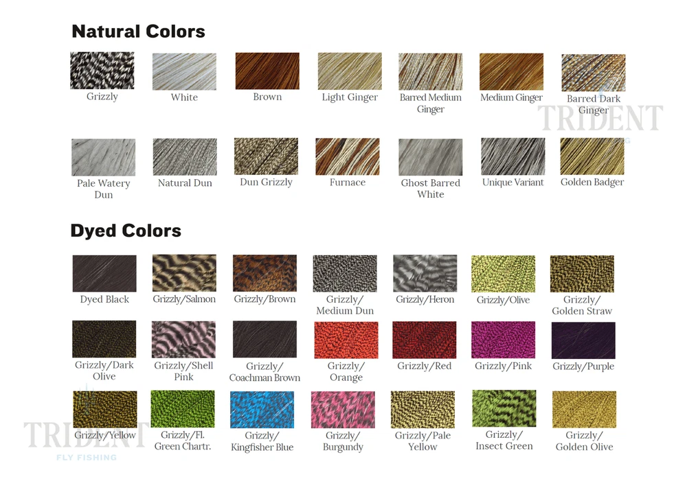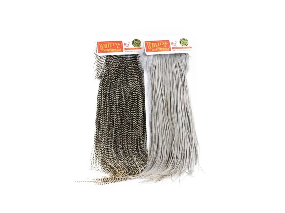 Whiting Dry Fly Hackle Full Saddle If you’re a dry fly enthusiast, Whiting’s Dry Fly Hackle Full Saddle has everything that you need to tie the perfect dry fly for years. Tying solid dry flies starts with using quality hackle, and what you find in Whiting’s Dry Fly Hackle Saddle is some of the best on the market. The feathers on these saddles are long with great barb density and have stems that are supple and super easy to wrap. Whiting breeds these roosters in a range of different colors and produces them in a few different quality grades, allowing you to dial in your flies exactly how you like. Maintaining the quality that Whiting is known for, these saddles are some of the best on the market and you can count on them to tie all of your dry fly needs for years to come. Uses First and foremost, Whiting’s Dry Fly Hackle Saddle is an excellent choice for the tier looking to whip up some dry flies. These feathers are nice and long with great barb density, allowing you to tie anything from parachutes and classic Catskill patterns to flies like the Stimulator and Elk Hair Caddis. And although these feathers are bred with the dry fly angler in mind, you’ll also find plenty of great feathers to use on fresh and saltwater streamers–whether you’re looking for long hackles to add to a Hollow Fleye or something nice and webby to palmer a Wooly Bugger, you’ll find something to use on the Dry Fly Hackle Full Saddle. Comparisons When it comes to an alternative to Whiting’s Full Dry Fly Saddle, there isn’t really anything out there that offers exactly the same quality. Sure, Keough’s Full Grizzly Saddle will work fine if you’re exclusively looking to use the color grizzly, but you won’t get the quality and consistency found from Whiting. Another option would be Whiting’s Dry Fly Hackle Half Saddle. These half saddles are exactly the same as Whiting’s Dry Fly Hackle Full Saddle but come packaged as a half saddle–this makes them a good choice for anyone who doesn’t want to invest in a full saddle, but the serious dry fly angler, it’s probably best to go with Whiting’s Dry Fly Hackle Full Saddle Whiting dry fly saddles are graded based on the approximate number of flies each pelt will tie. The grade does not, as is sometimes thought, denote hook sizes of the hackle. The following steps are carried out to determine the number of flies each pelt will provide. The approximate number of usable dry fly tying feathers is counted for both sides of the pelt. (Example: a 95 count on the left side and a 100 count on the right side total 195 usable tying feathers). The average hackle length is then measured. (Example: a pelt has an average hackle length of 8 inches). The tying sizes of the feathers are determined. Most saddles have two predominant sizes, with some hackle on either side of the predominant sizes. The total number of flies per pelt is calculated. (An 8-inch feather that is size 14” will hackle four flies; 195 feathers multiplied by four flies equals a minimum of 780 flies.) The saddle pelts are then placed in their appropriate grade based on the minimum number of flies each pelt will tie. Bronze - will tie a minimum of 500 flies Silver - will tie a minimum of 800 flies Gold - will tie a minimum of 1,100 flies Platinum - will tie a minimum of 1,500 flies Half Saddle Pelts will tie approximately ½ of these quantities Quarter Saddle Pelts will tie approximately ¼ of these quantities Whiting Dry Fly Hackle Full Saddle If you’re a dry fly enthusiast, Whiting’s Dry Fly Hackle Full Saddle has everything that you need to tie the perfect dry fly for years. Tying solid dry flies starts with using quality hackle, and what you find in Whiting’s Dry Fly Hackle Saddle is some of the best on the market. The feathers on these saddles are long with great barb density and have stems that are supple and super easy to wrap. Whiting breeds these roosters in a range of different colors and produces them in a few different quality grades, allowing you to dial in your flies exactly how you like. Maintaining the quality that Whiting is known for, these saddles are some of the best on the market and you can count on them to tie all of your dry fly needs for years to come. Uses First and foremost, Whiting’s Dry Fly Hackle Saddle is an excellent choice for the tier looking to whip up some dry flies. These feathers are nice and long with great barb density, allowing you to tie anything from parachutes and classic Catskill patterns to flies like the Stimulator and Elk Hair Caddis. And although these feathers are bred with the dry fly angler in mind, you’ll also find plenty of great feathers to use on fresh and saltwater streamers–whether you’re looking for long hackles to add to a Hollow Fleye or something nice and webby to palmer a Wooly Bugger, you’ll find something to use on the Dry Fly Hackle Full Saddle. Comparisons When it comes to an alternative to Whiting’s Full Dry Fly Saddle, there isn’t really anything out there that offers exactly the same quality. Sure, Keough’s Full Grizzly Saddle will work fine if you’re exclusively looking to use the color grizzly, but you won’t get the quality and consistency found from Whiting. Another option would be Whiting’s Dry Fly Hackle Half Saddle. These half saddles are exactly the same as Whiting’s Dry Fly Hackle Full Saddle but come packaged as a half saddle–this makes them a good choice for anyone who doesn’t want to invest in a full saddle, but the serious dry fly angler, it’s probably best to go with Whiting’s Dry Fly Hackle Full Saddle Whiting dry fly saddles are graded based on the approximate number of flies each pelt will tie. The grade does not, as is sometimes thought, denote hook sizes of the hackle. The following steps are carried out to determine the number of flies each pelt will provide. The approximate number of usable dry fly tying feathers is counted for both sides of the pelt. (Example: a 9