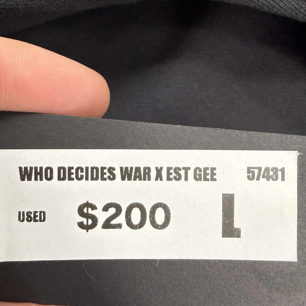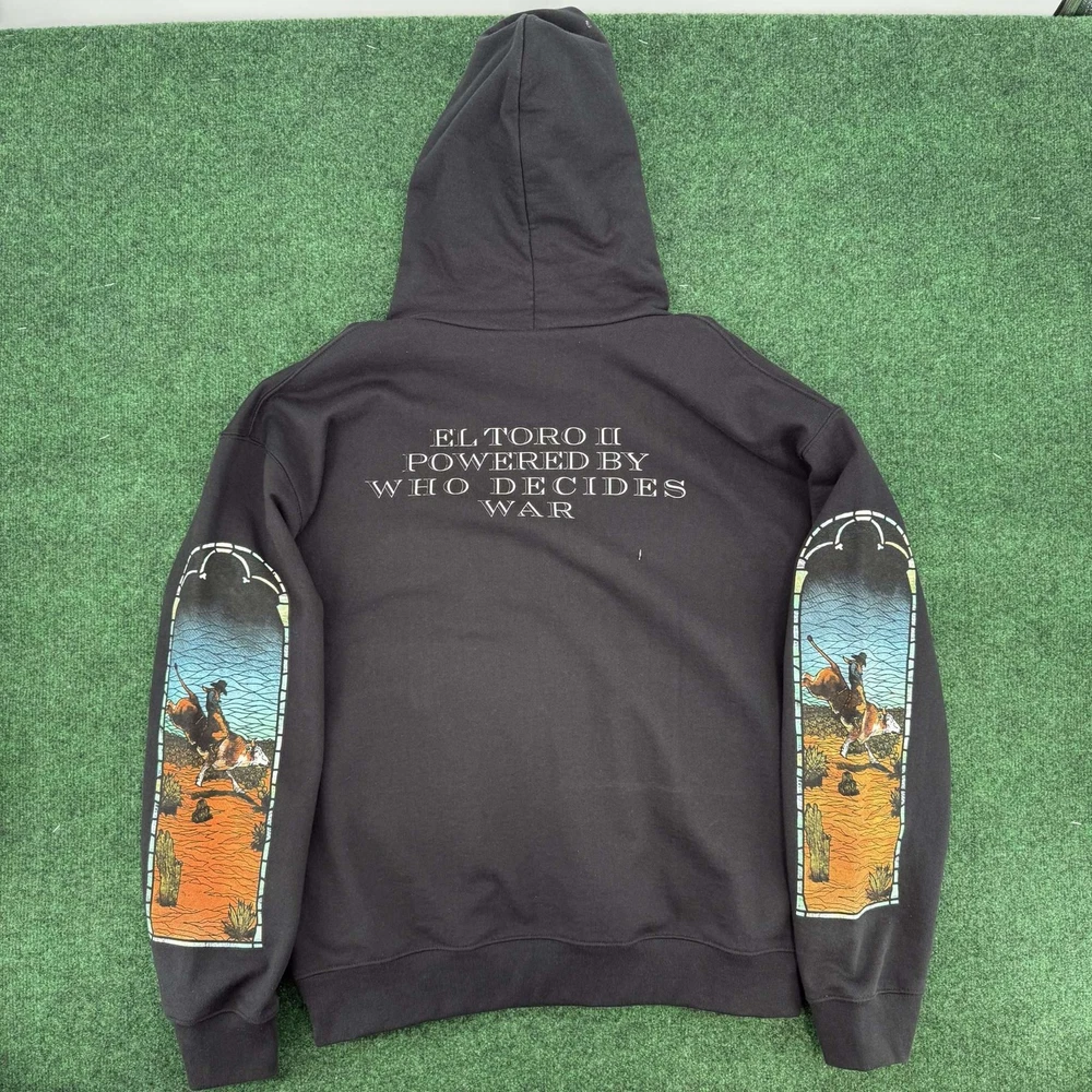 ALWAYS AUTHENTIC, SHIPS 1 BUSINESS DAY, VERIFIED SELLER Who Decides War x EST Gee Hoodie Large This is a unique collaboration piece between Who Decides War and EST Gee. The hoodie features a striking design with vibrant graphics on the front and sleeves, depicting a dynamic scene. The back showcases the text ‘EL TORO II POWERED BY WHO DECIDES WAR’. Made from high-quality materials, this hoodie is both comfortable and stylish, perfect for making a statement. The size is Large, and it is in used condition, offering a distinctive look with a touch of character.