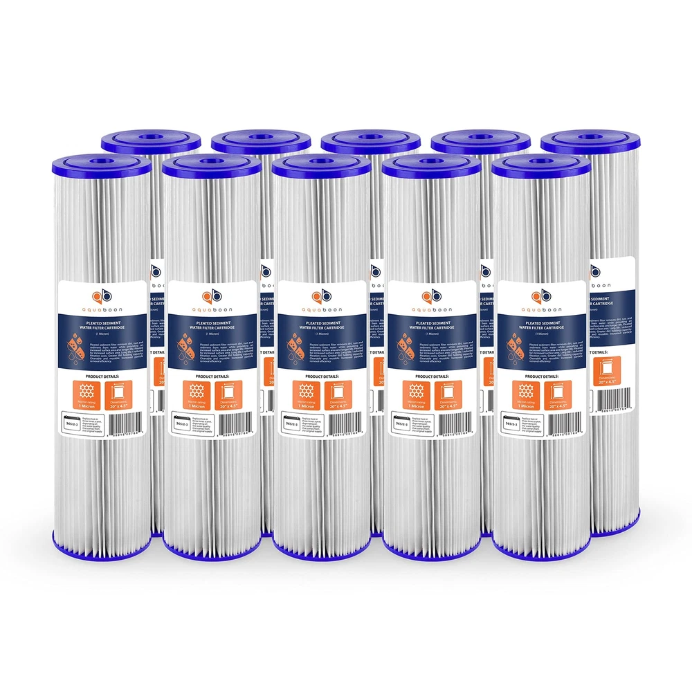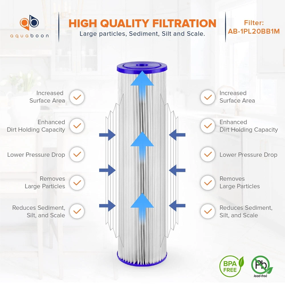 Superior 1 Micron Filtration: Our 1 micron pleated water filter ensures your home enjoys clean filtered water by trapping even the finest particles. From sand to rust, whole house filter captures them all, providing crystal water without contaminants . Long-Lasting Water Purity: Say goodbye to frequent water filter replacements. ’s 20-inch sediment filter offers an extended lifespan of 4-6 months(depending on water quality), giving you consistent, high-quality filtration for longer. High-Performance Filtration for Any Source: Whether municipal or well water, sediment water filter cartridge protects plumbing and appliances from sediment buildup, offering optimal protection and prolonging the lifespan of entire water filter system. Consistent Water Pressure: Our 20 inch water filter delivers a smooth, uninterrupted water flow. The large filtration area prevents pressure drops inside whole home water filtration system, ensuring a steady supply of water without compromising flow rate. Effortless Maintenance: Built for durability, this washable water filter cartridge reduces the need for replacements. Well filter cartridge is easy to clean and maintain, allowing you to enjoy easy operation and reduced maintenance expenses over time. Versatile Filtration Solution: From residential homes to commercial spaces, 1 micron water filter 20 x 4.5 cartridge fits perfectly into 20-inch water filter housings. Its ideal choice for both whole home water filtration and pre-treatment processes. Protects Downstream Water Filters: This sediment filter not only purifies water but also enhances the efficiency of downstream house water filters. By capturing larger particles first, it ensures other water filters cartridges work more efficiently. Built for Tough Conditions: Crafted from high-quality non-woven polyester, pleated water filter replacement cartridge is designed to withstand challenging conditions. Whole house filter ensures reliable performance even in demanding environments. Universal Whole House Water Filter Cartridge Fit: Compatible With American Plumber 155184-51, W5CPHD, Ametek CP5-BB, AquaPure AP810-2, Culligan 155184, CP5-BB, Dupont HDC3001, OmniFilter RS15, Hydronix SPC-45-2001, SPC-45-2005, Keystone GPC5. Plug and Play Excellence: Compatible With Liquatec SPF-45-1005, SPF-45-2005, Neo-Pure PS-45097-05, PS-45200-01, Pelican PBBB-P20-5, PBB-P20-1, PBB-P20-5, Pentek 255490-43, ECP1-20BB, ECP5-20BB, ECP5-BB, Watts FM-BB-20-5, PWPL20BBM5, WPC1FF20, etc.