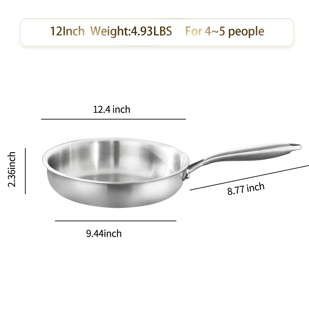 Tri-Ply Stainless Steel 12inch Frying Pan Non-toxic stainless steel skillet Non-toxic stainless steel fry pan Non-toxic stainless steel frying pan 【Your Reliable Cookware Partner】Each pan and pot form heats quickly and spreads heat evenly because of our High-Control level of materials. We insist on upgrading the quality 【Efficiently Energy Saving】In , Energy saving is not just a slogan but truly happened! Tri-Ply Stainless Steel cookware Heats quickly and spreads heat evenly, will spend 20% Gas or electricity less that you have spend in cooking before 【Professionally Design】Outer Riveted and Stay cool handle design. The Good grips Handle which Provides a confident grasp and remains cool-to-touch while cooking over induction, ceramic, electric, or gas cooktops.Take it directly from stove to oven 【Practical and Elegance】Tri-Ply Stainless Steel Pan Combines Ergonomic cookware Design and superior features for optimal cooking performance. The rounded and encapsulated rim for drip free pouring and easy transfers,Rivet-free surface to eliminate food traps 【Family Approved】Highly polished 18/8 Food Grade cooking surface won’t react with food. Oven and broiler safe up to 650˚F, 3-layer metal construction delivers performance and durability for years to come