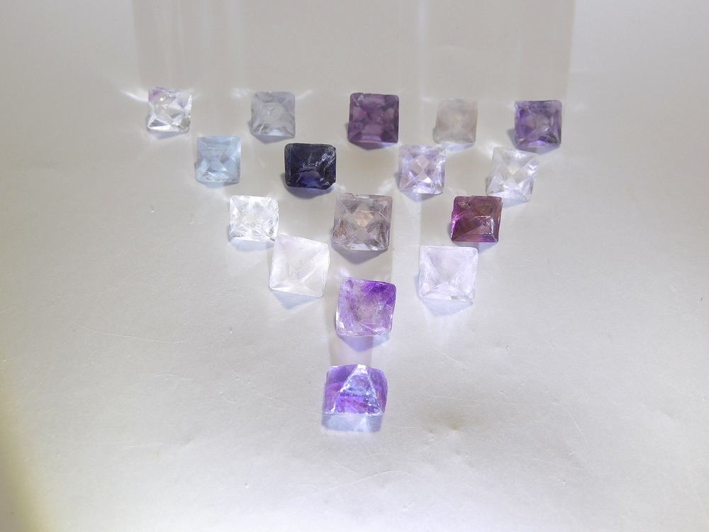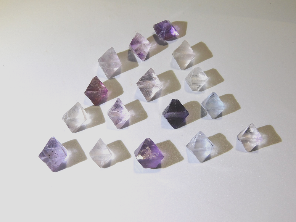 Here are 16 Octahedron fluorites from southern Illinois and are a favorite for collectors. These small gemmy and lustrous bi-color octahedrons range in colors, blue, purple, and bluish - white. Most octahedra are single colors and you don't see many anymore that are extremely gemmy. These crystals are completely terminated all the way around and measures in a variety of sizes from the largest measuring 15.3mm tall x 11.4mm wide x 11.1mm front to back and the smallest measuring 12.9mm tall x 9.6mm wide x 8.8mm front to back. The others measure between those. Comes with original label and as always we offer combine shipping in the USA, Thank you.