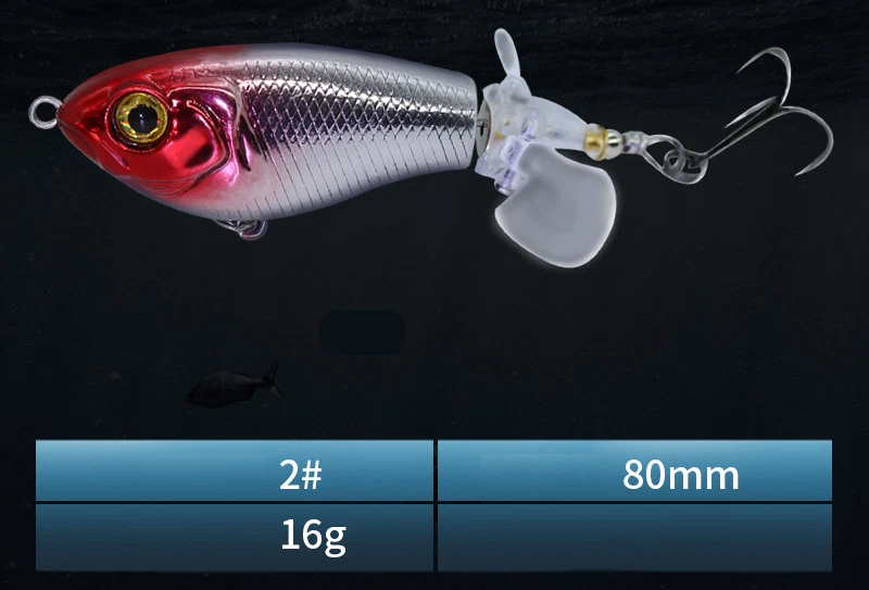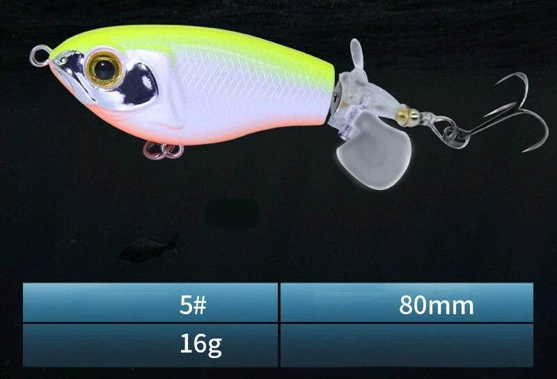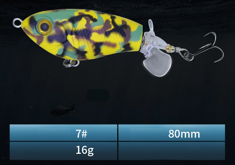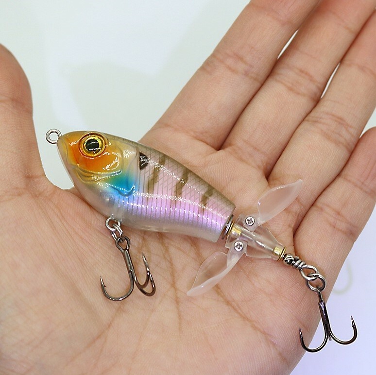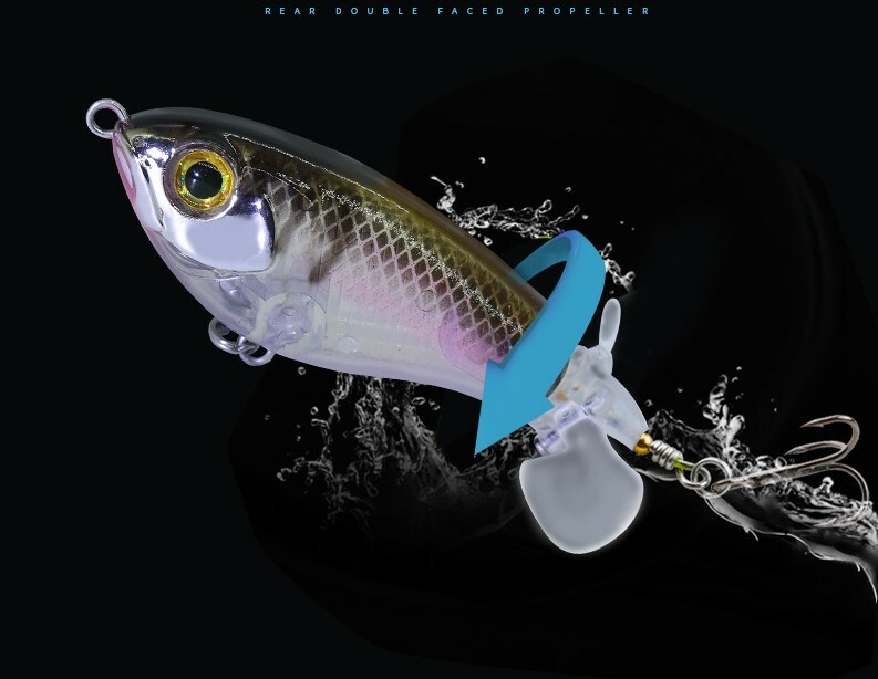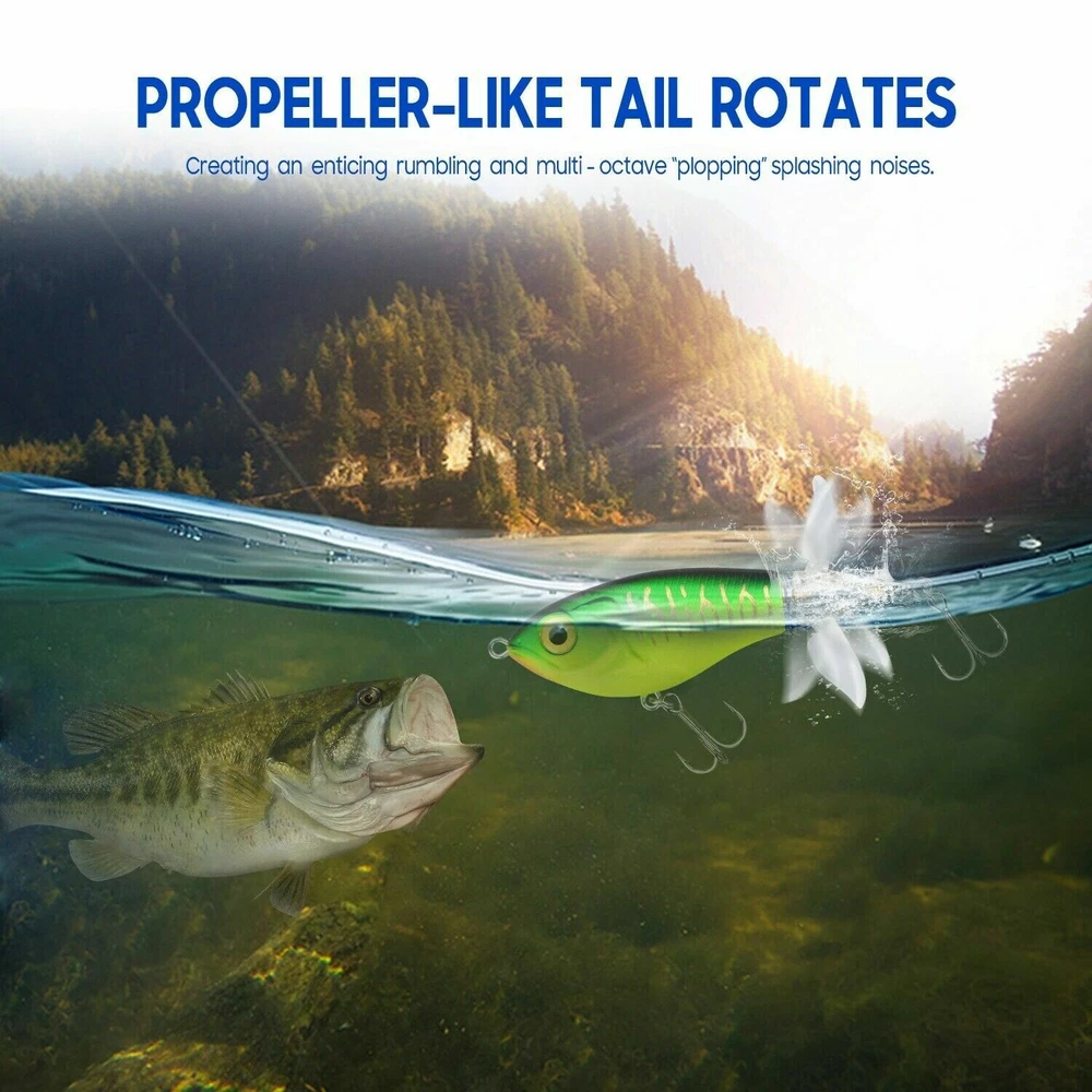 This topwater lure is a game-changer! The vibrant colors and lifelike swimming action instantly grab attention, while the built-in gravity balls add noise and casting distance. The double propellers create an irresistible surface disturbance, and the sharp treble hooks ensure solid hooksets. Perfect for aggressive strikes—it mimics a wounded baitfish so well that bass can't resist. The durable design holds up against big fish, making it a must-have for any angler targeting explosive topwater action.