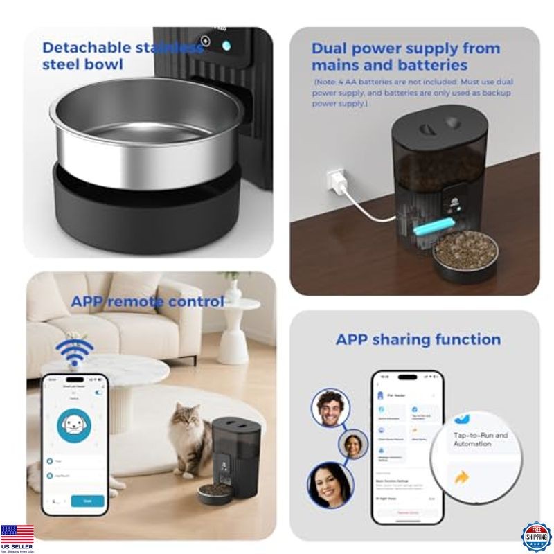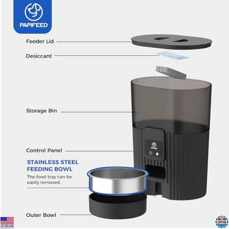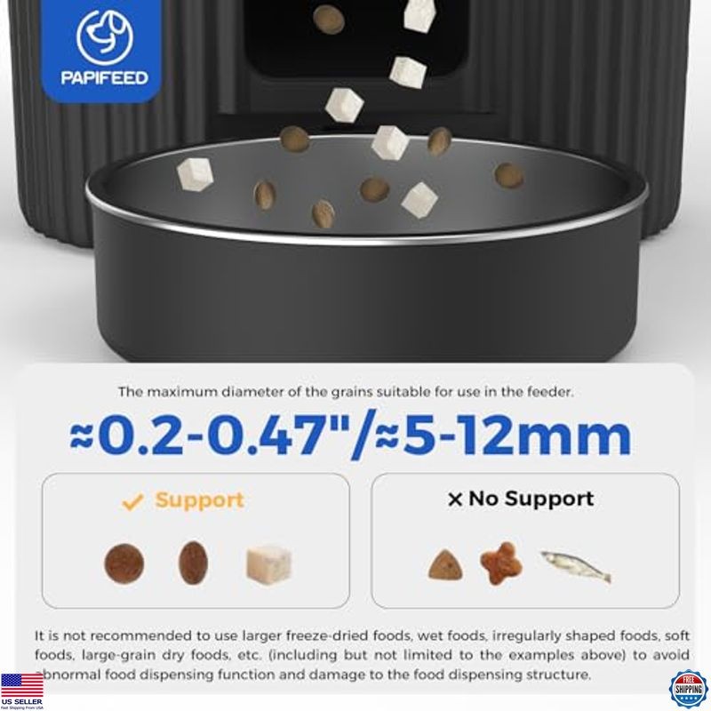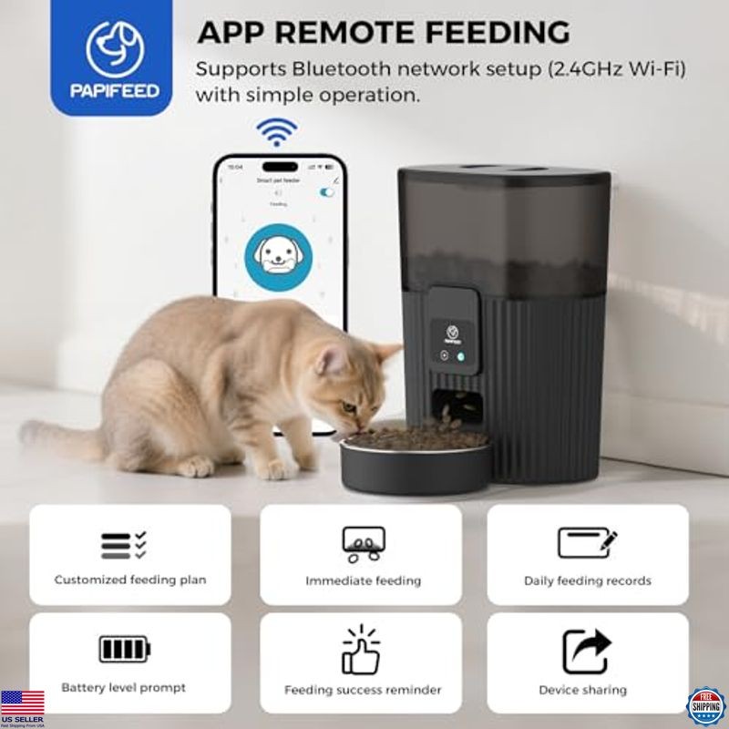 Automatic Cat Feeder 3.5L/15 Cup 2.4G WiFi Pet Feeder for Dog Work with Alexa & Echo Timed Cat Food Dispenser for Remote Feeding with Stainless Steel Bowl up to 10 Meals Per Day with APP Description Keep your furry friend well-fed and happy with the PAPIFEED Automatic Cat Feeder! Designed with an airtight lid and desiccant bags, it ensures your cat's food stays fresh and safe from curious paws. Control feeding times and portion sizes right from your phone, and share access with family members for effortless feeding. Enjoy peace of mind with dual power options, ensuring reliable operation even during outages. Perfect for busy pet owners! Product reference: B0CLH9NBW7. Features 【2.4G WIFI Remote APP Control】: When the automatic cat feeder is connected to the 2.4GHz WiFi, you can feed your pet anytime and anywhere via the "Smart Life" APP, no more worrying about your pet being home alone and not being fed. You can also set up a daily feeding schedule via the APP for regular feedings, relieving you of the burden of getting up early to feed. The "Smart Life" APP not only allows you to view feeding records, but also to share control with family members.(Note: Only supports 2.4GHZ not 5GHZ) 【Customized Healthy Diet】:Say no to your pet’s irregular healthy diet. Customize a healthy eating habit for your pet from now on. Easily set up and schedule feeding times based on your pet's needs, even while you're enjoying your vacation outdoors. papifeed automatic pet feeder creates a consistent daily feeding schedule to ensure your pet is eating regularly. (Max 10 meals per day, 1-6 servings each) 【Let Alexa Feed Your Pet】: Our auto cat feeder supports Echo devices with Alexa, with a simple command, you can let your Amazon Echo devices feed your pet anywhere in your home. And you can customize the voice commands and the number of servings you feed. 【Slow Feeder & Portion Control】 : When your cat or dog is bloated, you can manually feed through the " Feed " button in the APP, extend the feeding interval and control the portion size of each meal,helping greedy pets eat at a healthier rate. Portion control can help pets control their food intake, so that pets can develop good eating habits and not overeat and become overweight. You can set up a feeding schedule of up to 10 meals per day, with 1-6 portions per meal. 【Eat Fresh Food At Any Time】:PAPIFEED automatic pet feeder storage has an air-sealed design. Desiccant bags and safety-lock lids not only keep food fresh, they also prevent your pet from accessing stored food. At the same time, the 360° visual transparent trough design also facilitates us to visually observe food consumption. 【Dual Power Mode】:The PAPIFEED dog food dispenser has two power systems. You can use the DC 5V power adapter for long-term power or use 4 AA batteries(Battery not included)for regular power. Even if the power goes out, the automatic feeder with battery backup will continue feeding so your pet won't go hungry. If the power goes out and there is no battery inside, the meal settings will be remembered when the power comes back on.(Note: 4 AA batteries are not included. The battery is for emergency power supply and has a standby time of about 15 hours. It cannot be connected to the internet when using battery power) 【Easy to Clean ( BPA Free )】:The PAPIFEED cat food dispenser with timer comes with a food-grade, safe and odorless removable stainless steel bowl. It makes cleaning easier and keep your beloved pet's fur clean. PAPIFEED auto feeder not only cares about reducing the feeding workload of pet owners, but also cares about the hygiene of pets during the feeding process. Shipping Free & Fast Shipping: We offer free shipping to most of the USA with a normal delivery time of 3-7 days. However, d...