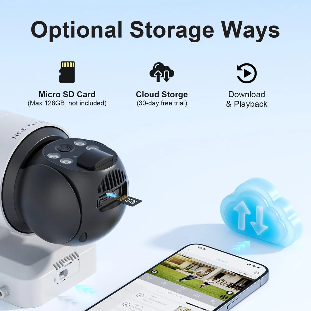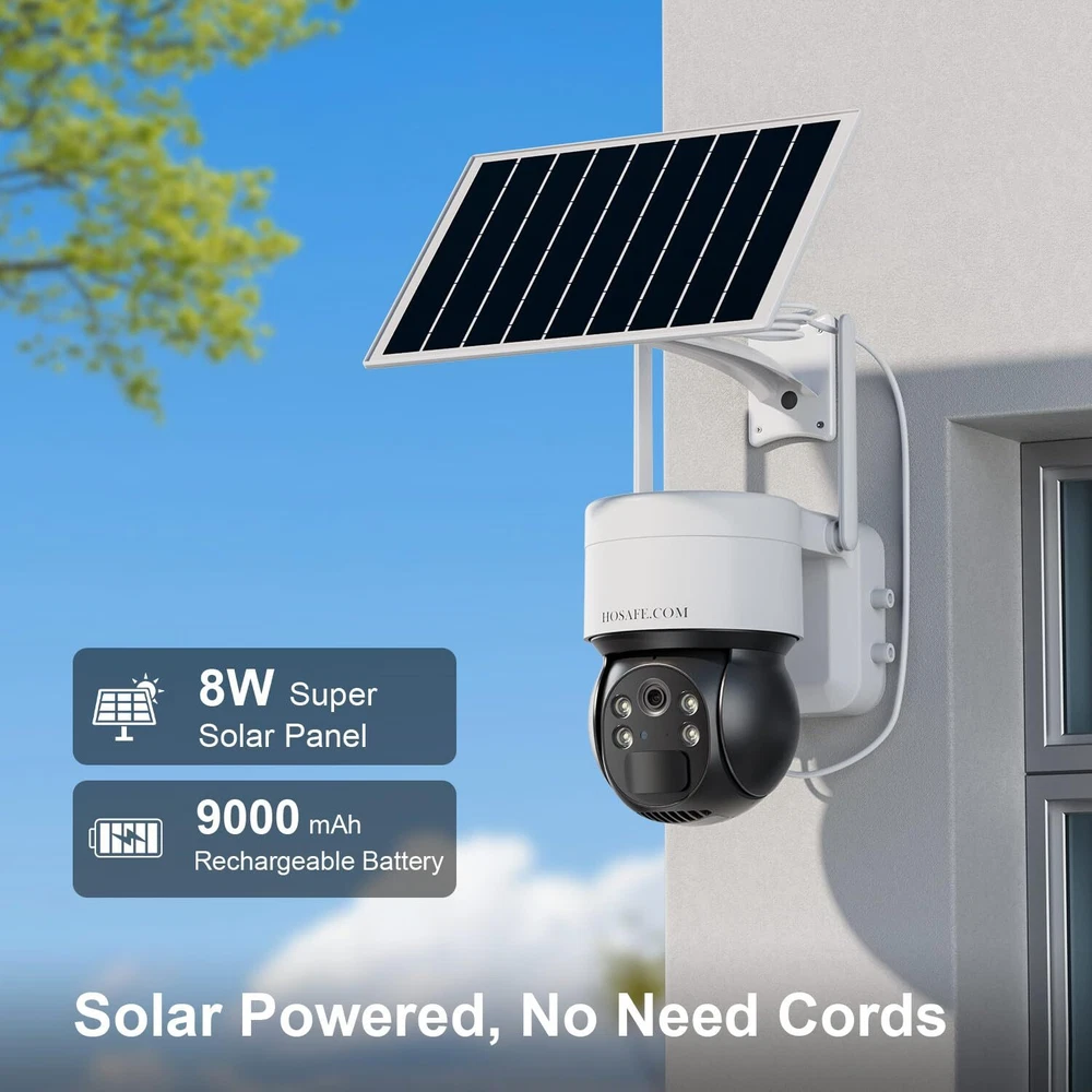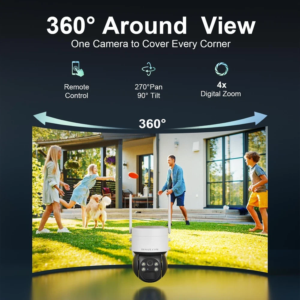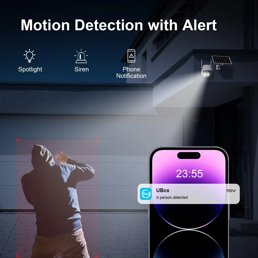 Built for home security, The outdoor camera wireless equips a strong 2.4G WIFI module to keep good performance with stable connection, and works anywhere around your home-- within wifi signal coverage(only 2.4GHz WIFI support). Non-Stop Solar Power: No need frequent battery changes or outlets, this security camera outdoor uses 8W solar panel to charge the battery, making it always ready to capture footage, say bye to power-off. Rotate Camera with 360 View: Remote rotate the home security cameras with pan 270° /tilt 90°, enabling everywhere around the home to be visble, and you can examine any corner with 4x zoom. 2K HD Color Night Vision: See vivid in 2K HD 3MP color vision with IR and spotlights, this outdoor security camera offers stunning- sharp images as daytime. Human Detection & Push Alerts: When someone is near the surveillance area, the solar camera outdoor wireless will be triggered and send instant notifications to your phone, keeping you informed with what's happening in no time. Real-Time 2-Way Talk: After receiving push alerts, you can engage and act to respond by hearing and speaking with visitors via the wireless cameras for home security's microphone-speaker, as if you are there. Secure Storage Options: Recordings are saved to the local SD card(64GB, included), and optional cloud storage is available that you can easily playback anytime no matter the solar camera outdoor wireless online or offline. Multi-User Sharing & Custom Arming: Share the wireless camera with family and friends, enabling them to receive push alerts and have a live view with their phone. Plus arming time setting on the Ubox app, easily reducing unwanted alerts. IP66 Weatherproof: the wireless security camera outdoor is IP66 waterproof and resists any extreme weather within -4°F to 122°F, such as dust, rain and snow.